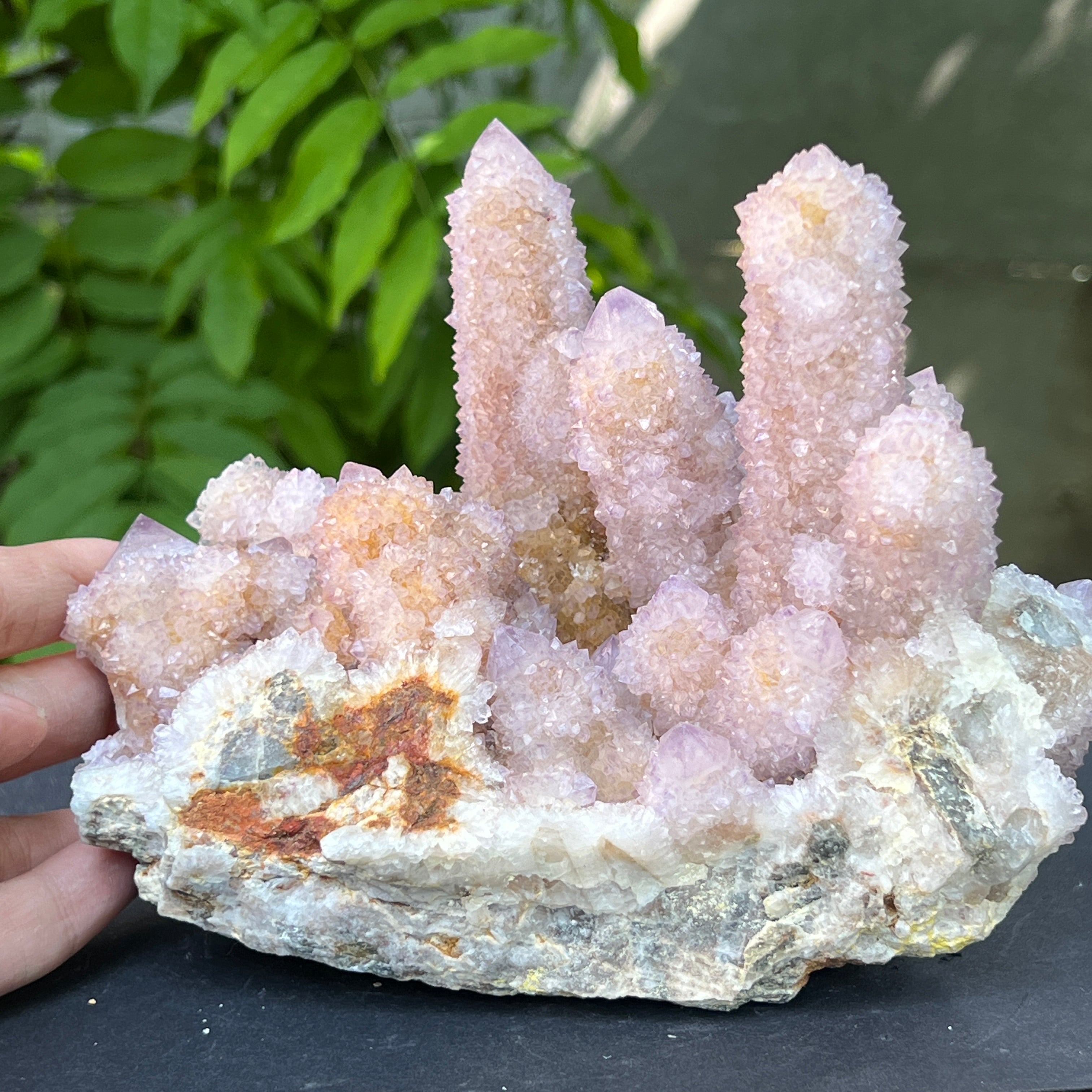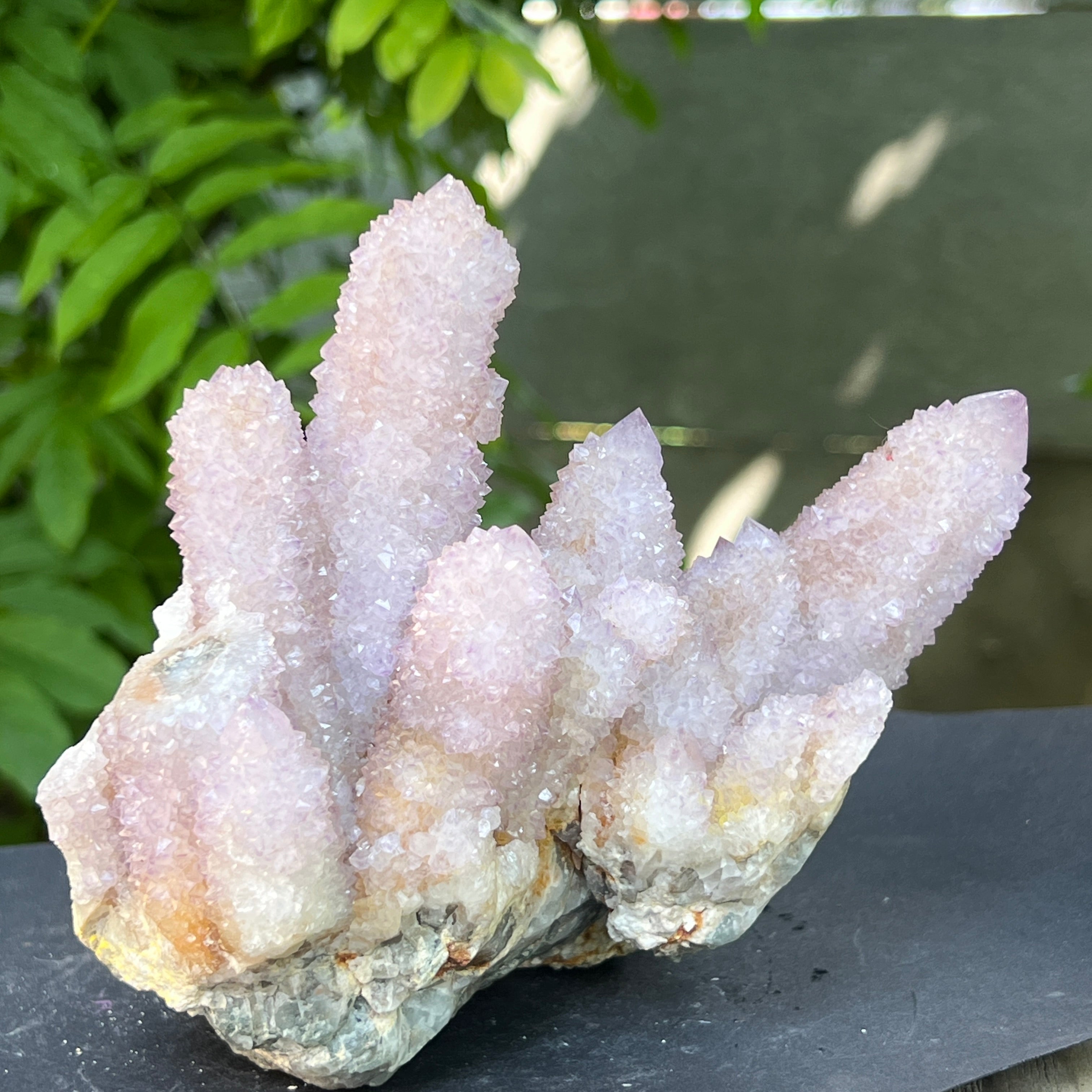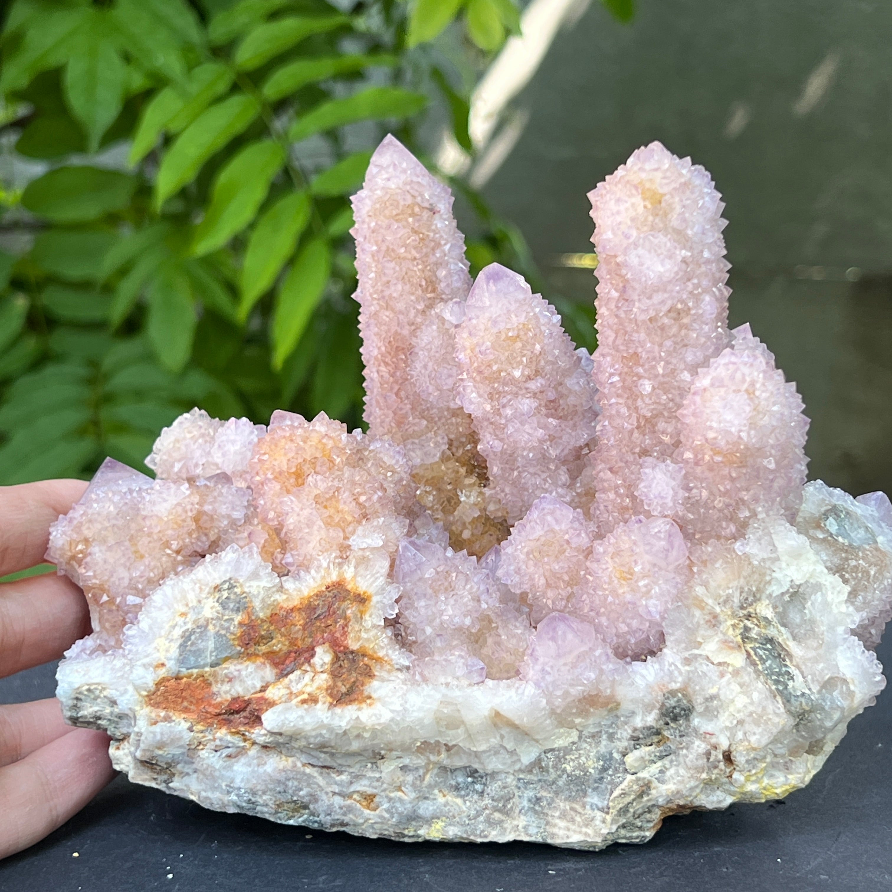 En las profundidades de la tierra africana, donde el silencio de las montañas esconde historias no contadas, nace un cristal de belleza inusual: el Cuarzo Espíritu Amatista, también conocido como "Cactus Quartz". Esta maravilla mineralógica parece envuelta en un aura mística: una sola base sólida, cubierta con miles de puntas delicadas, como una comunidad de cristales unida en un baile de luz.