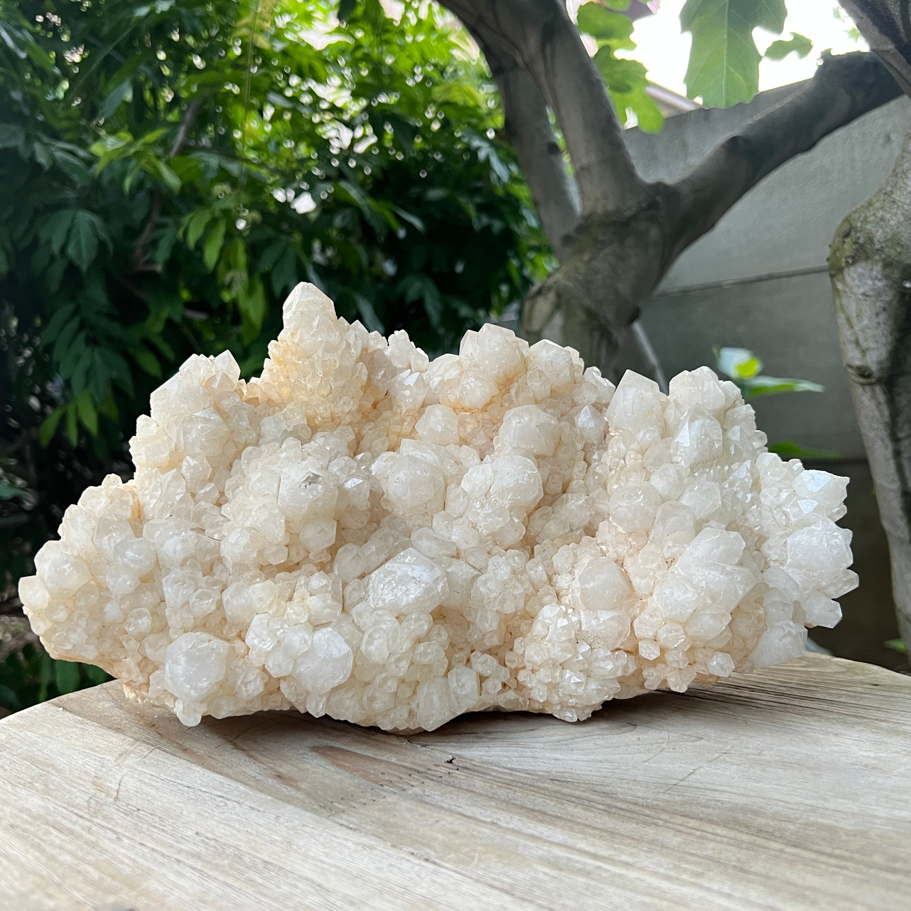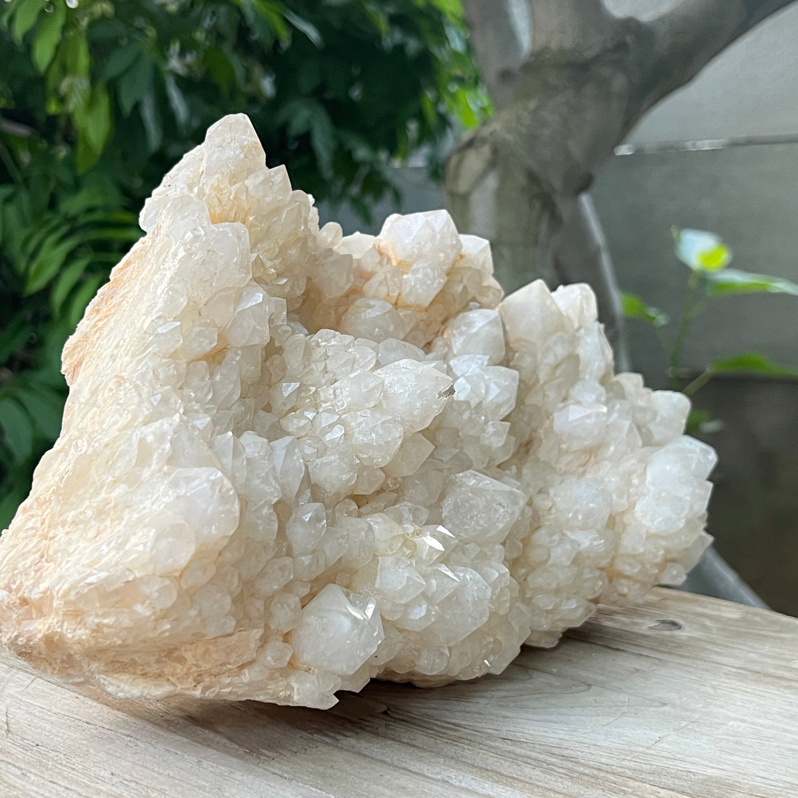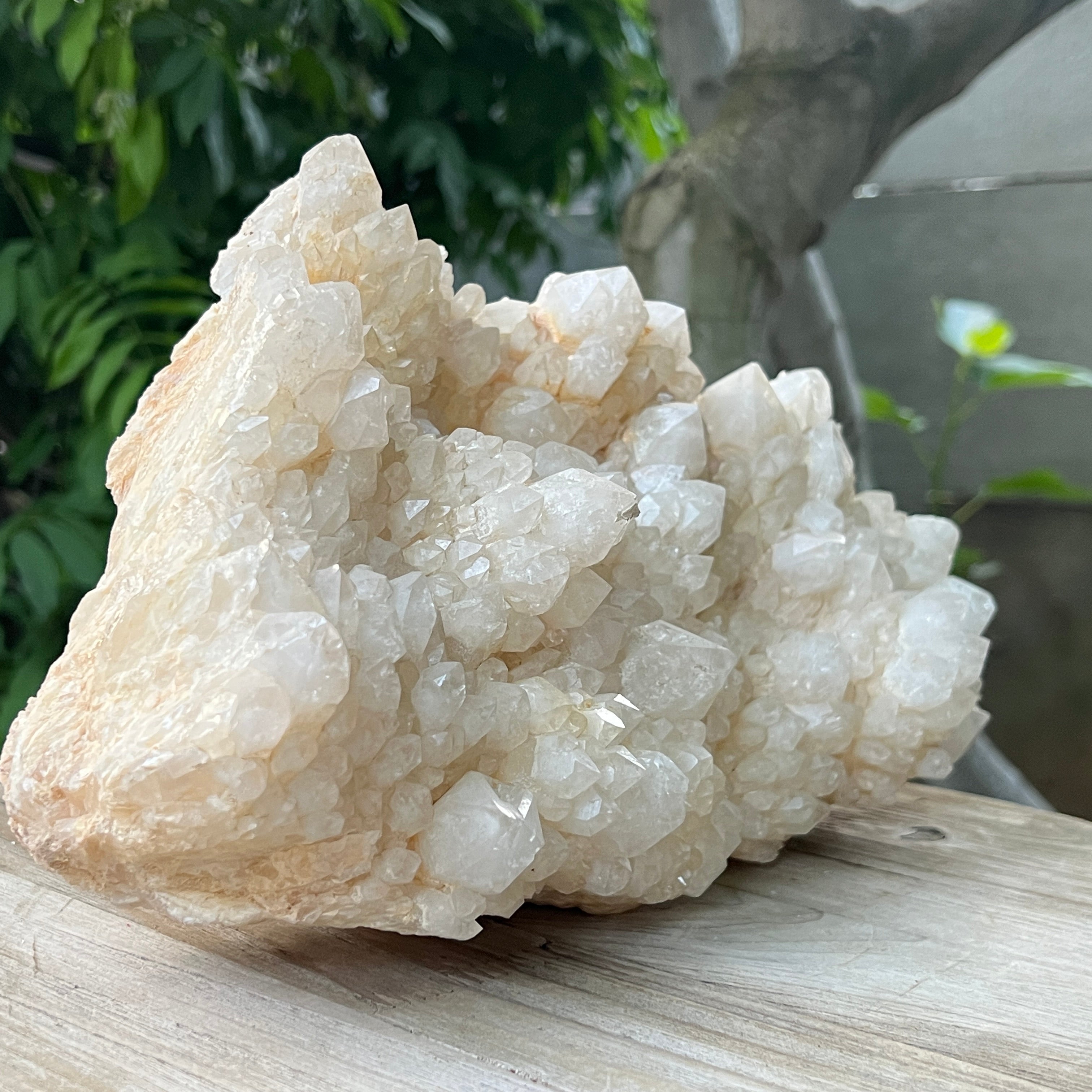 Un ejemplar verdaderamente notable del mundo de los cristales: este cluster de cuarzo piña impresiona por su forma inusual, compuesta por un cristal central de cuarzo cubierto por múltiples cristales secundarios dispuestos radialmente, semejantes a las escamas de una piña. Es una pieza que atrae la atención tanto por su belleza natural como por la complejidad de su formación geológica.