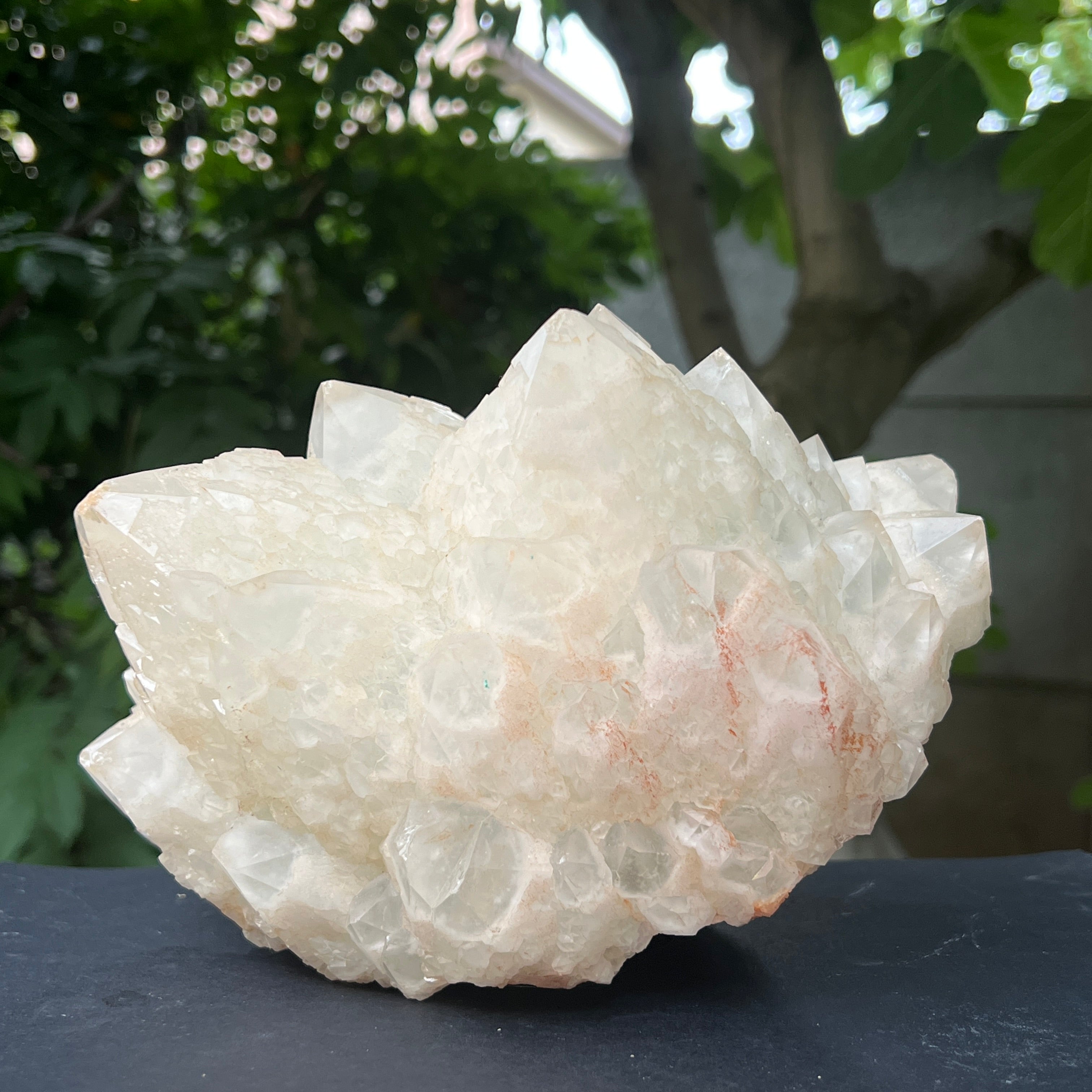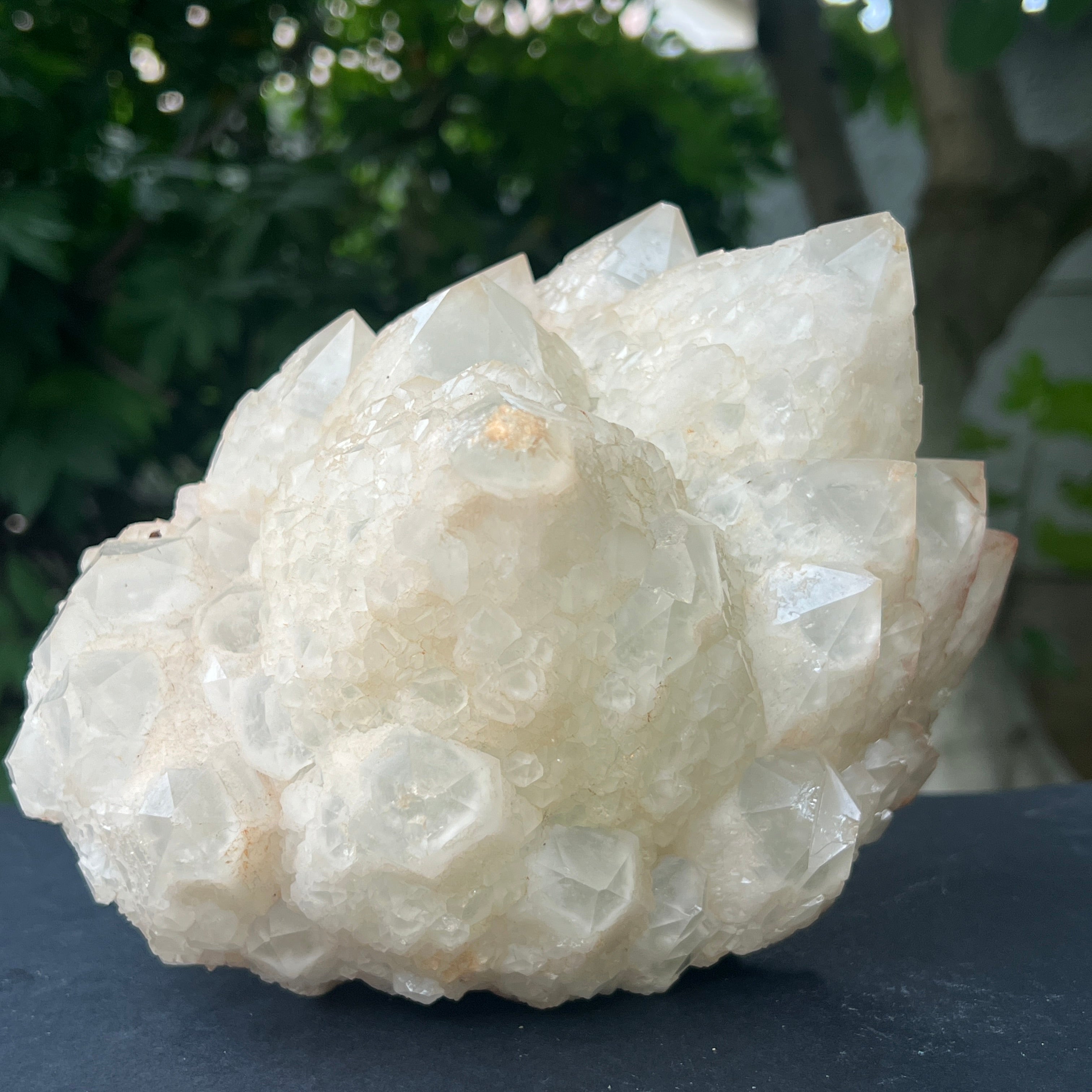 El fenómeno que da lugar a esta forma especial se llama epitaxia secundaria : un proceso en el cual los pequeños cristales de cuarzo se desarrollan sobre las caras de un cristal madre, manteniendo la orientación cristalina pero formando una textura compacta, granular y radiante. El resultado es una superficie ricamente texturizada, con una estética orgánica y un sutil juego de luces, dependiendo del ángulo desde el que se observe.