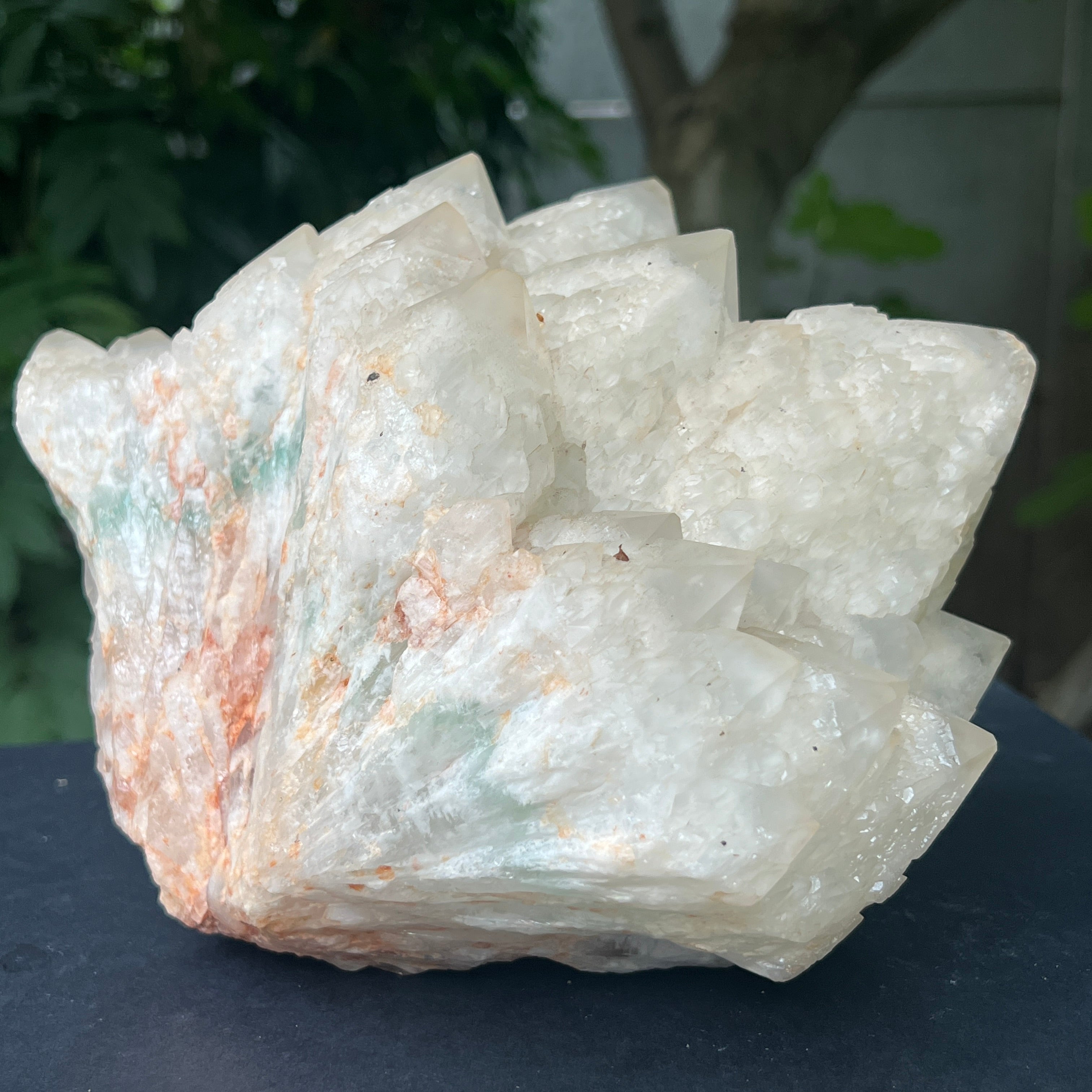 Un ejemplar realmente notable del mundo de los cristales: este racimo de cuarzo piña impresiona por su forma inusual, compuesta por un cristal central de cuarzo cubierto por múltiples cristales secundarios distribuidos radialmente, semejantes a las escamas de una piña. Es una pieza que llama la atención tanto por su belleza natural como por la complejidad de su formación geológica.