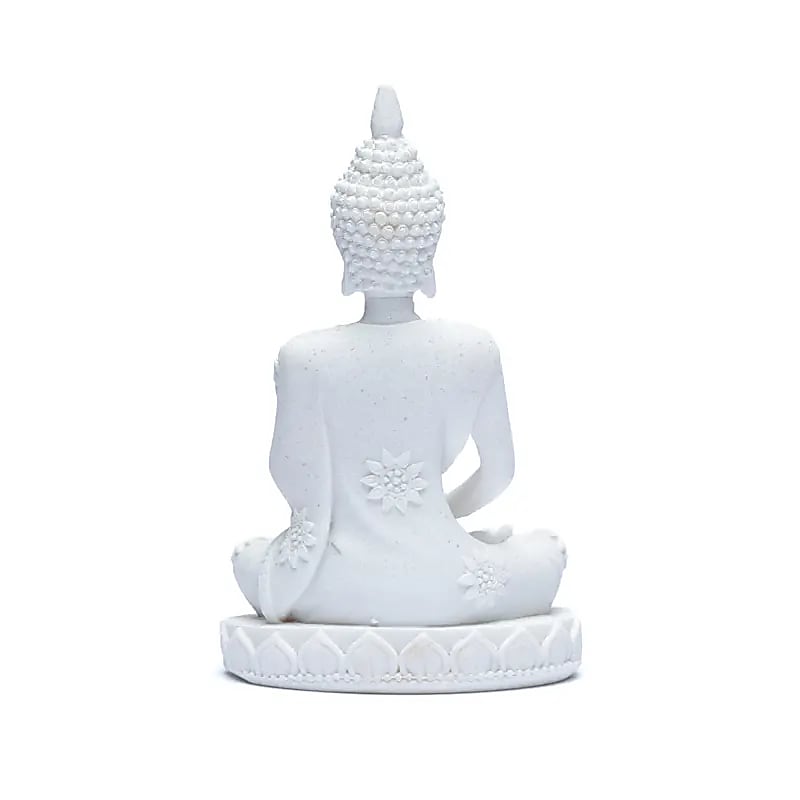 Esta estatuilla de Buda blanca representa a Buda en mudra de la meditación, el gesto de las manos que simboliza equilibrio, tranquilidad interior e iluminación.