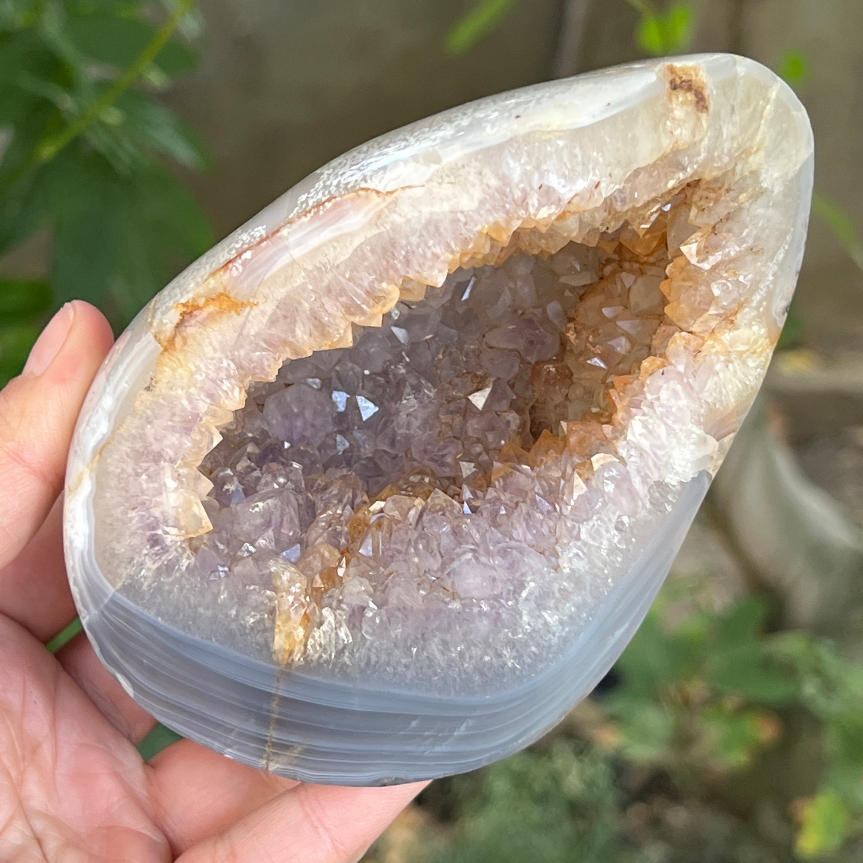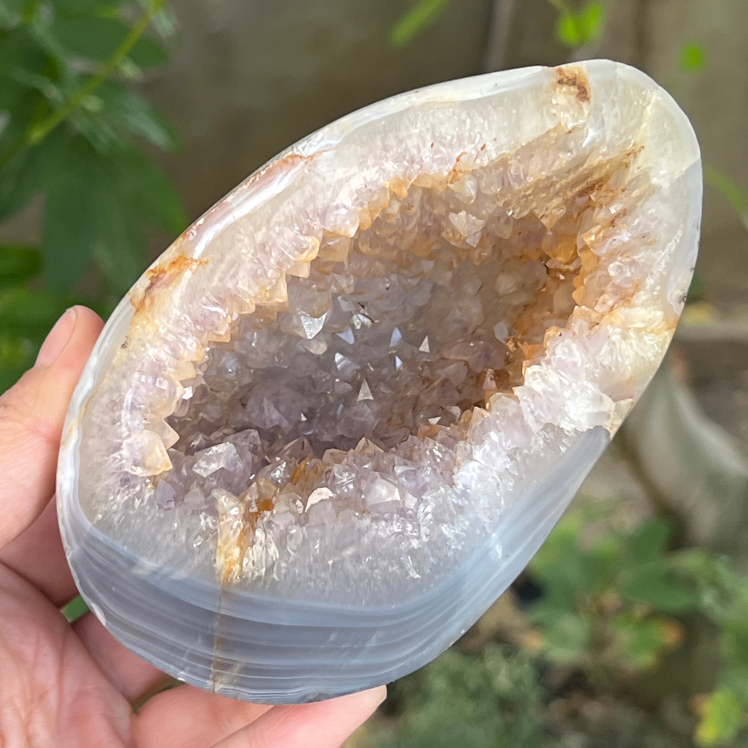 Esta espectacular geoda combina el profundo misterio de la amatista con la quietud estratificada de la ágata, revelando un tesoro de la naturaleza tallado por el tiempo y la energía. Cada detalle de su interior oculto —cristales de amatista brillantes en tonos púrpuras— se destaca por el contorno fino y estable de la ágata, como un corazón protegido por una ladrada de sabiduría.