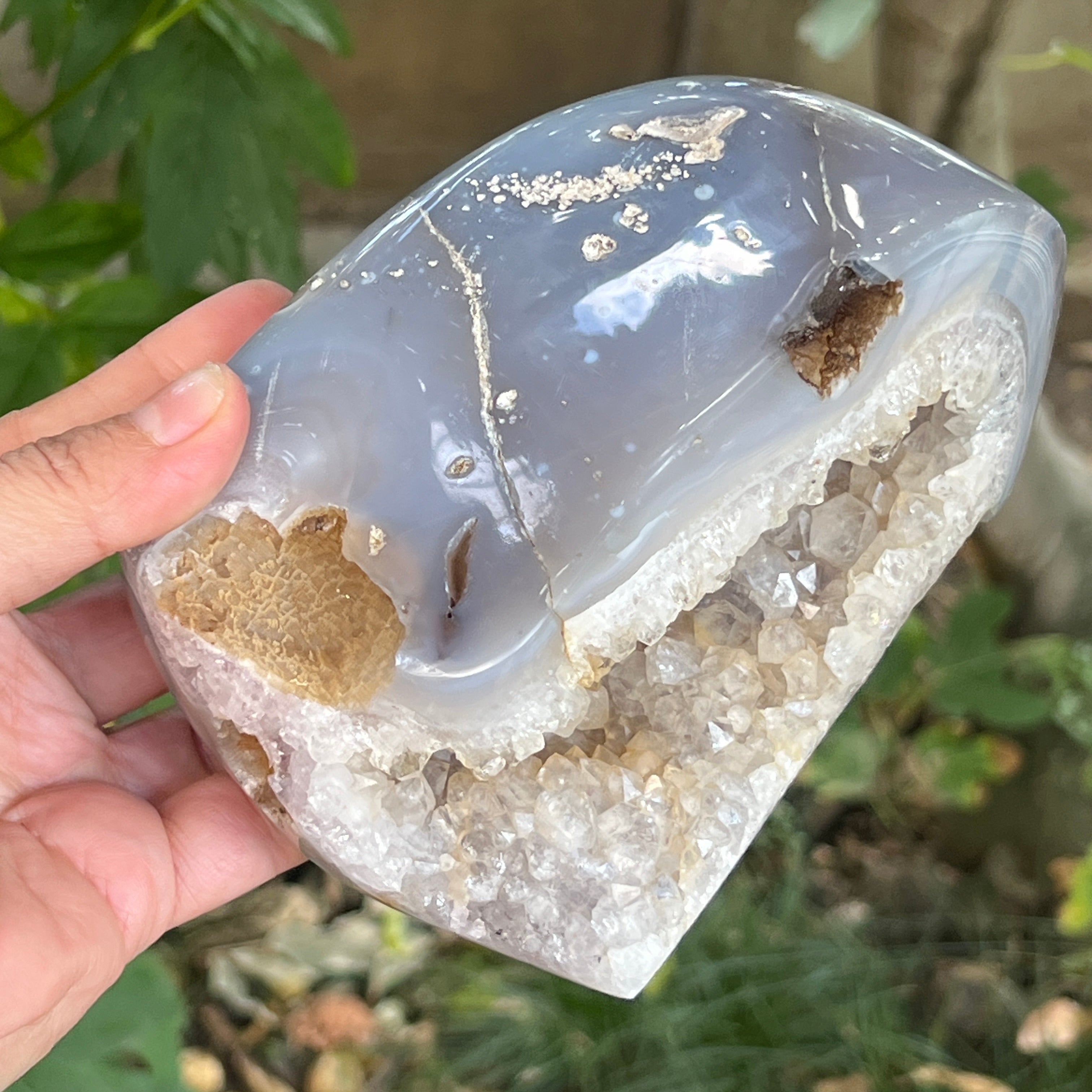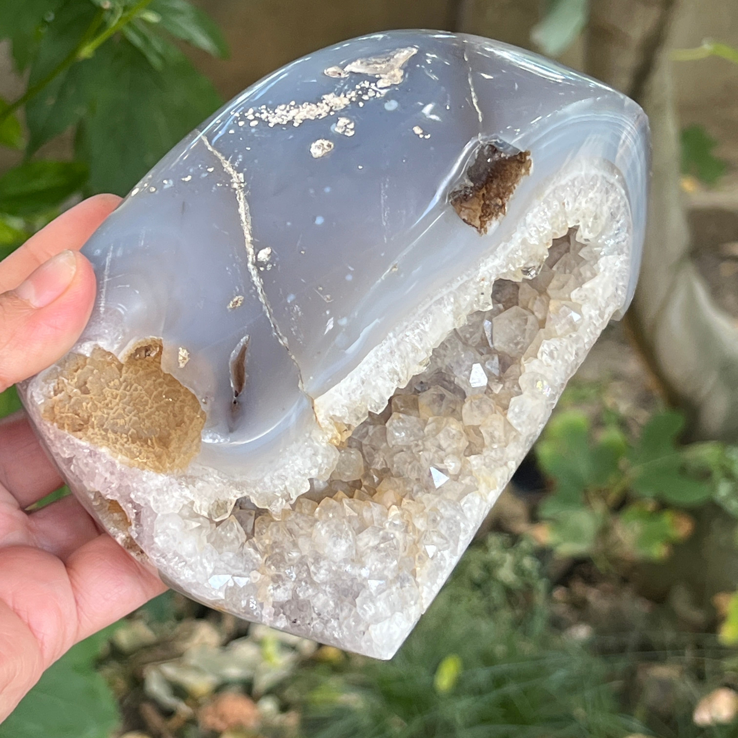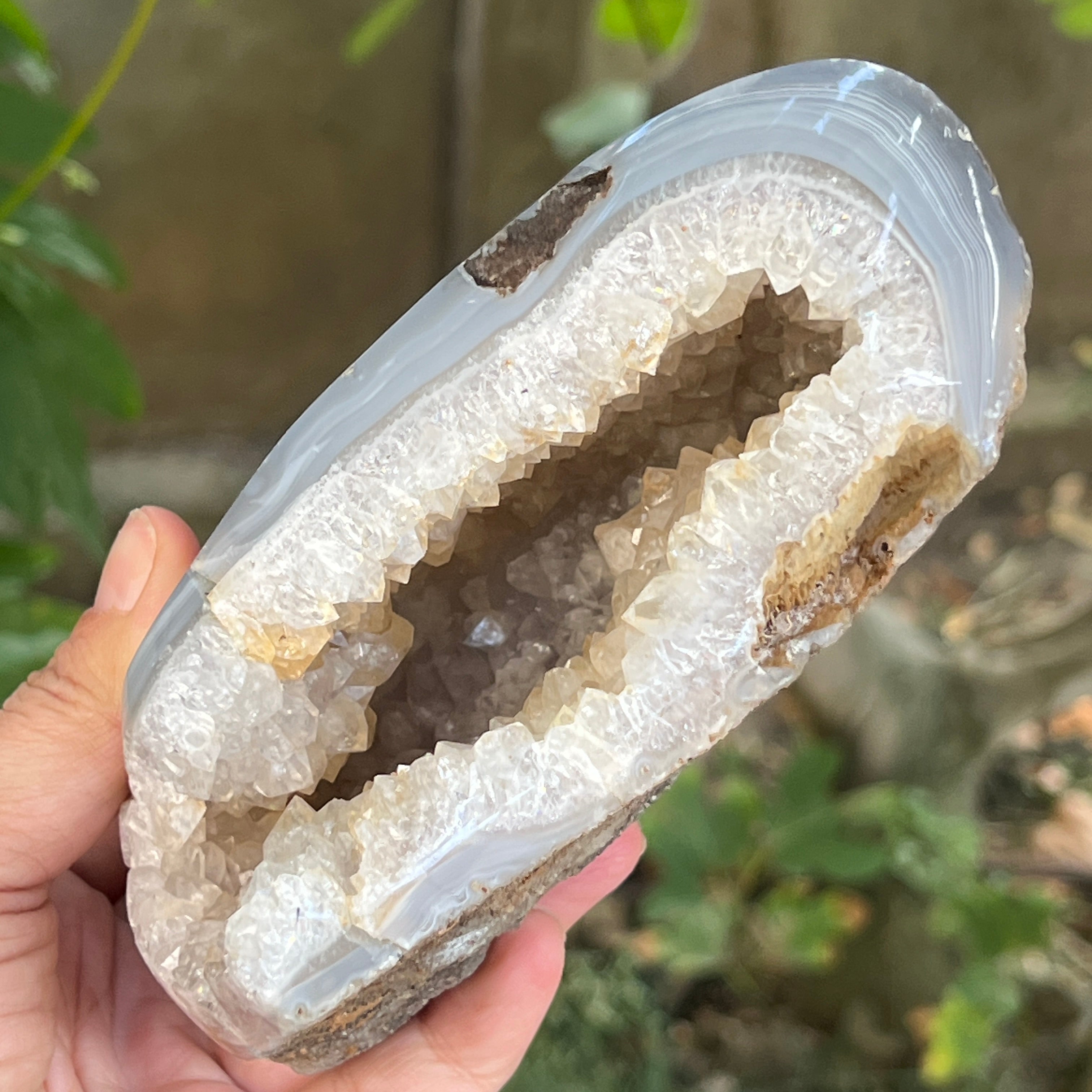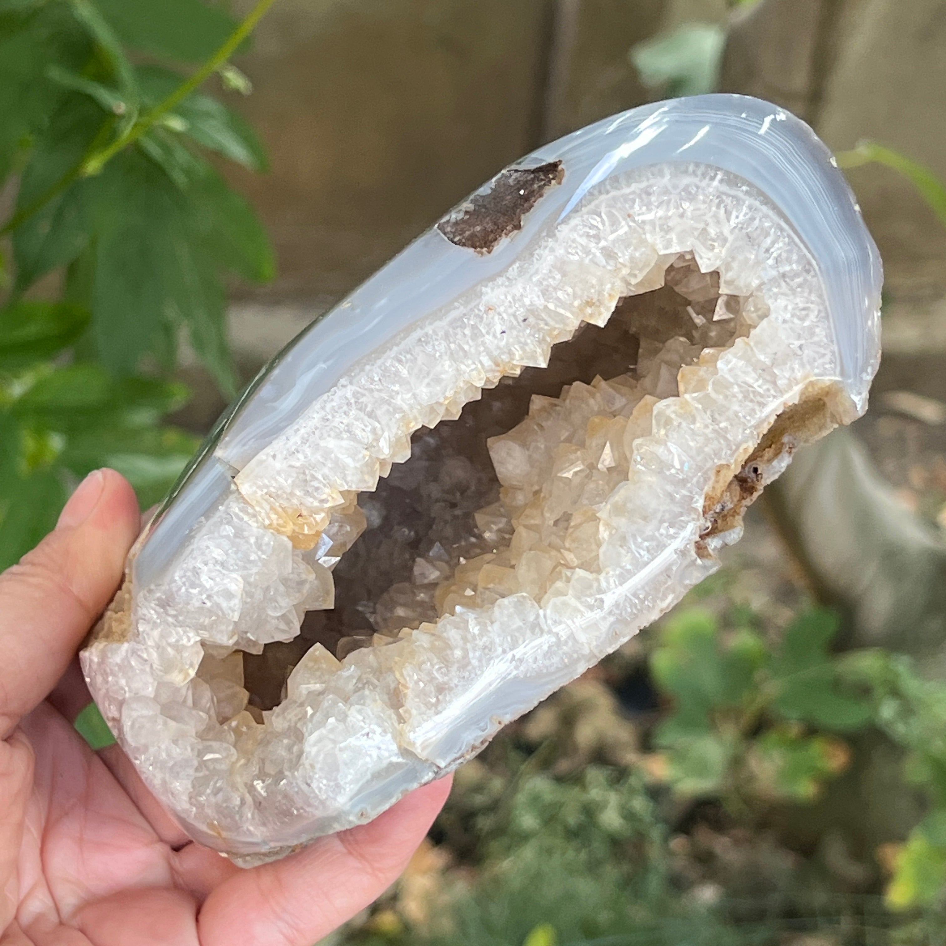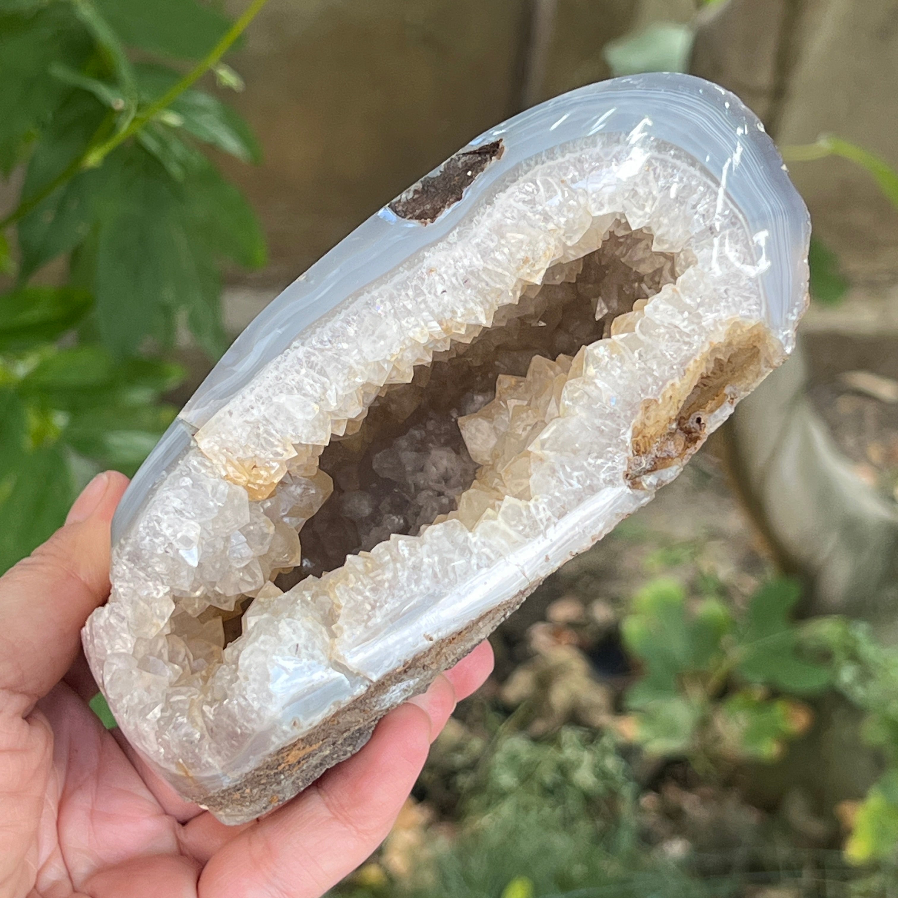 Esta espectacular geoda combina el profundo misterio de la amatista con la quietud estratificada de la ágata, revelando un tesoro de la naturaleza tallado por el tiempo y la energía. Cada detalle de su interior oculto —cristales de amatista brillantes en tonos púrpuras— se destaca por el contorno fino y estable de la ágata, como un corazón protegido por una ladrada de sabiduría.
