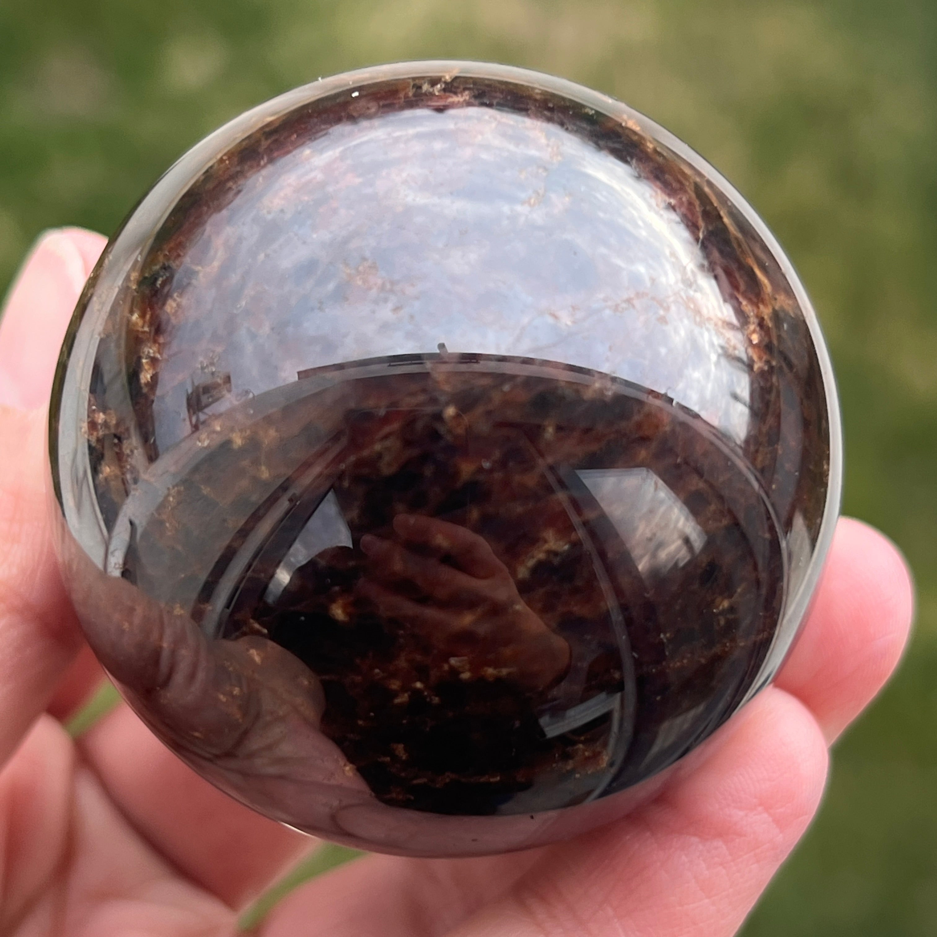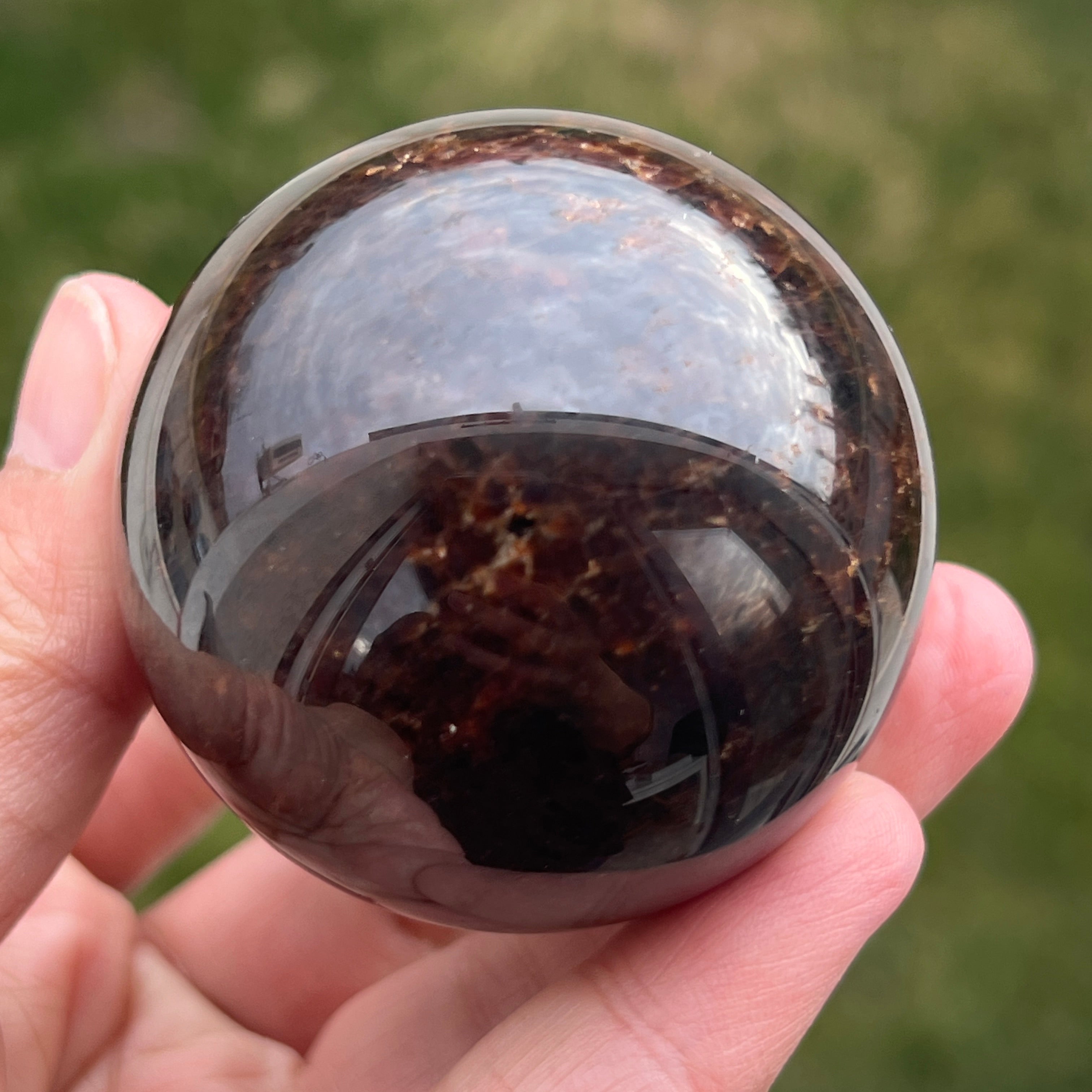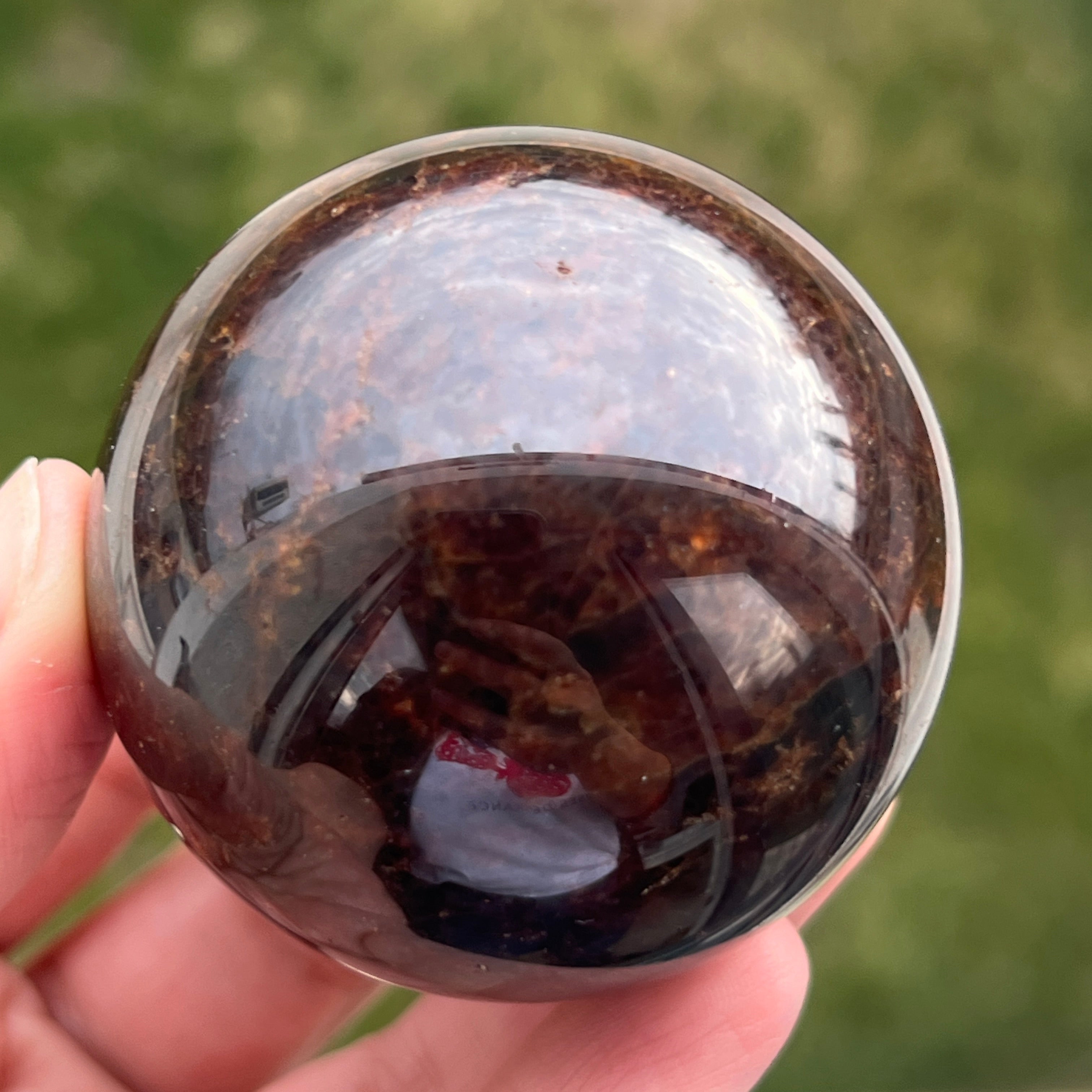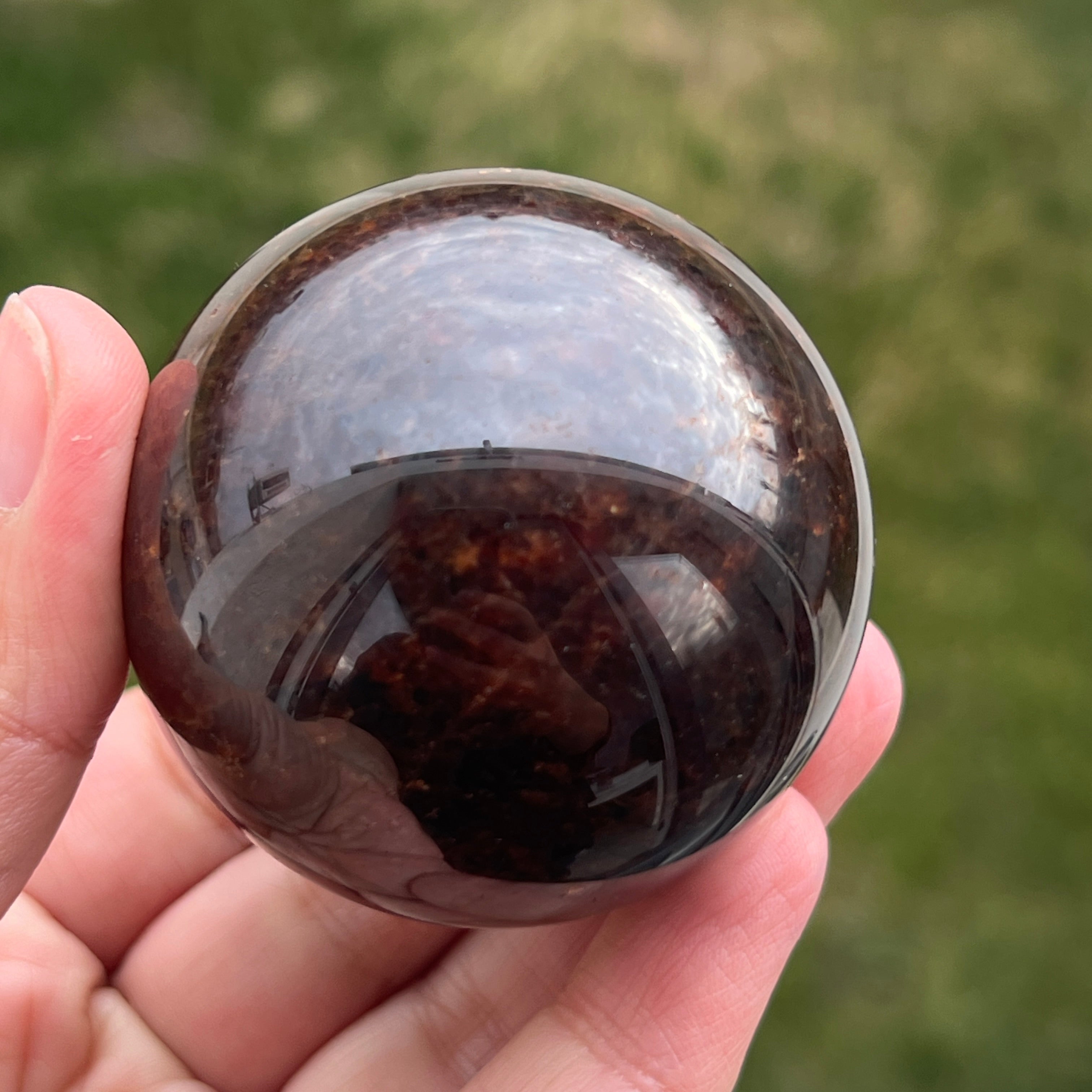 La esfera de granate está hecha de un mineral del grupo de los silicatos, conocido por su estructura cristalina compacta y por sus tonos intensos, desde el rojo oscuro hasta los matices profundos de cereza. Gracias a su composición, el granate es un material duro y estable, lo que lo hace adecuado para trabajar en formas como la esfera, donde la textura y el color pueden observarse de manera uniforme desde todos los ángulos.