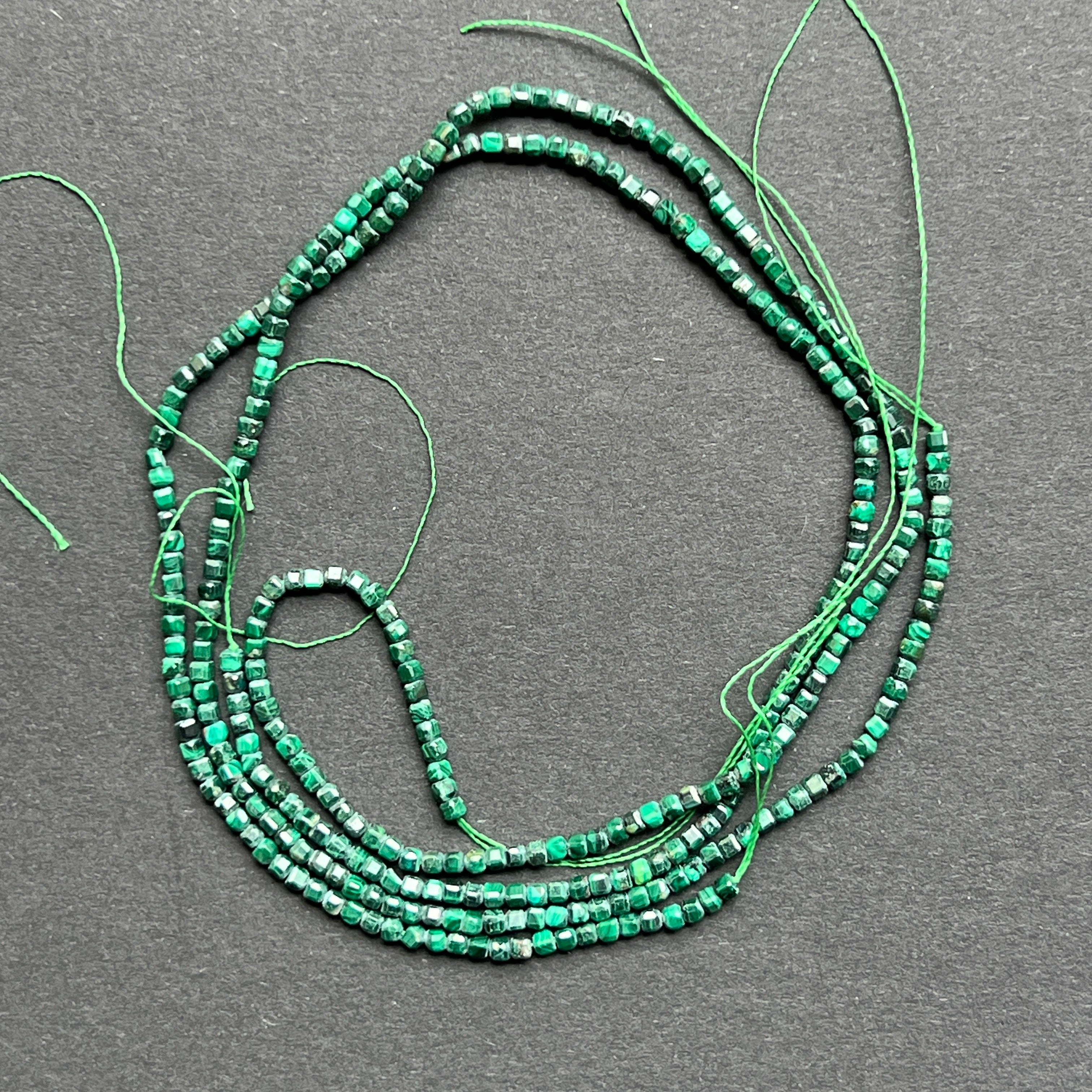Hilo de malaquita, compuesto por cubos esféricos facetados naturales, perfecto para collares, pulseras u otras joyas hechas a mano.