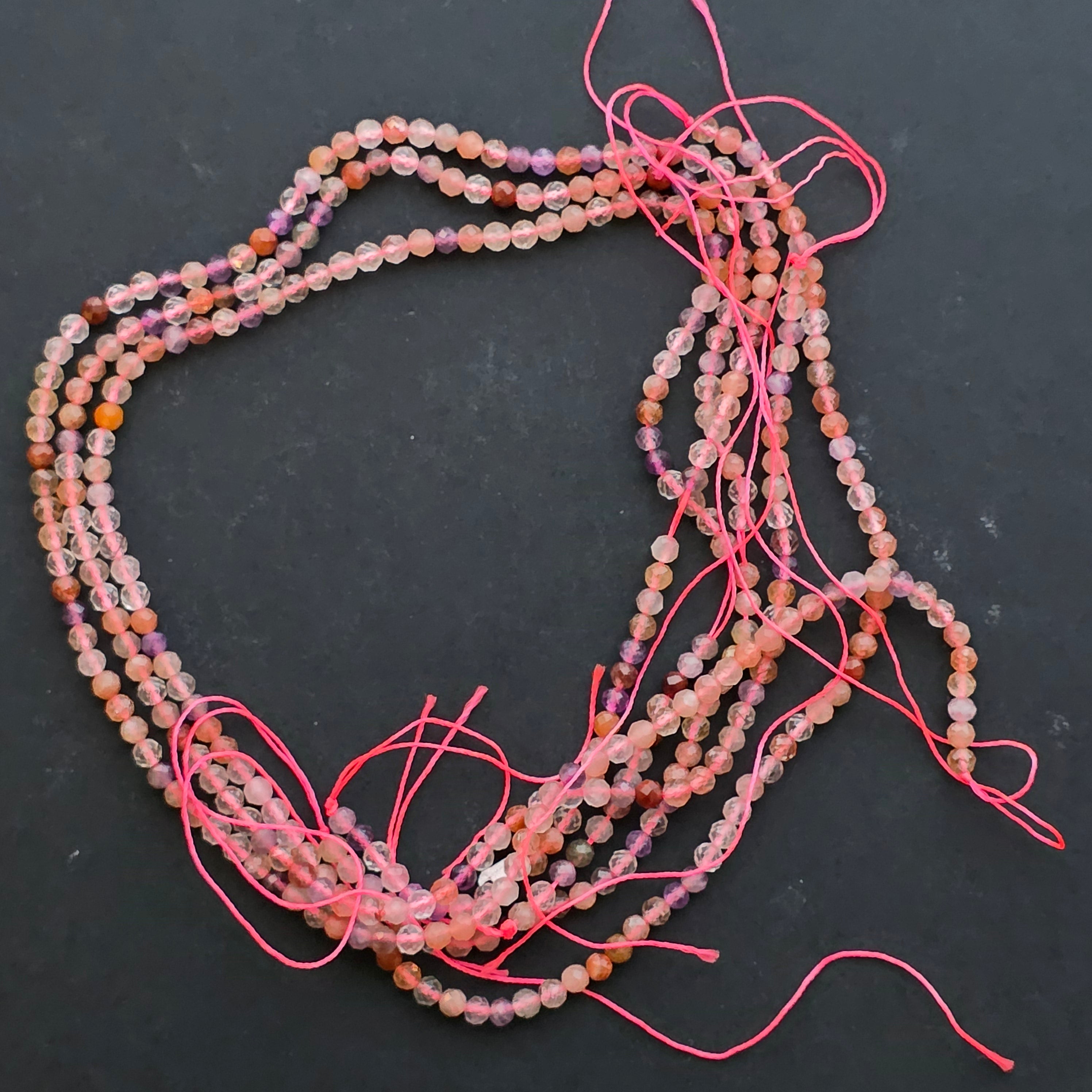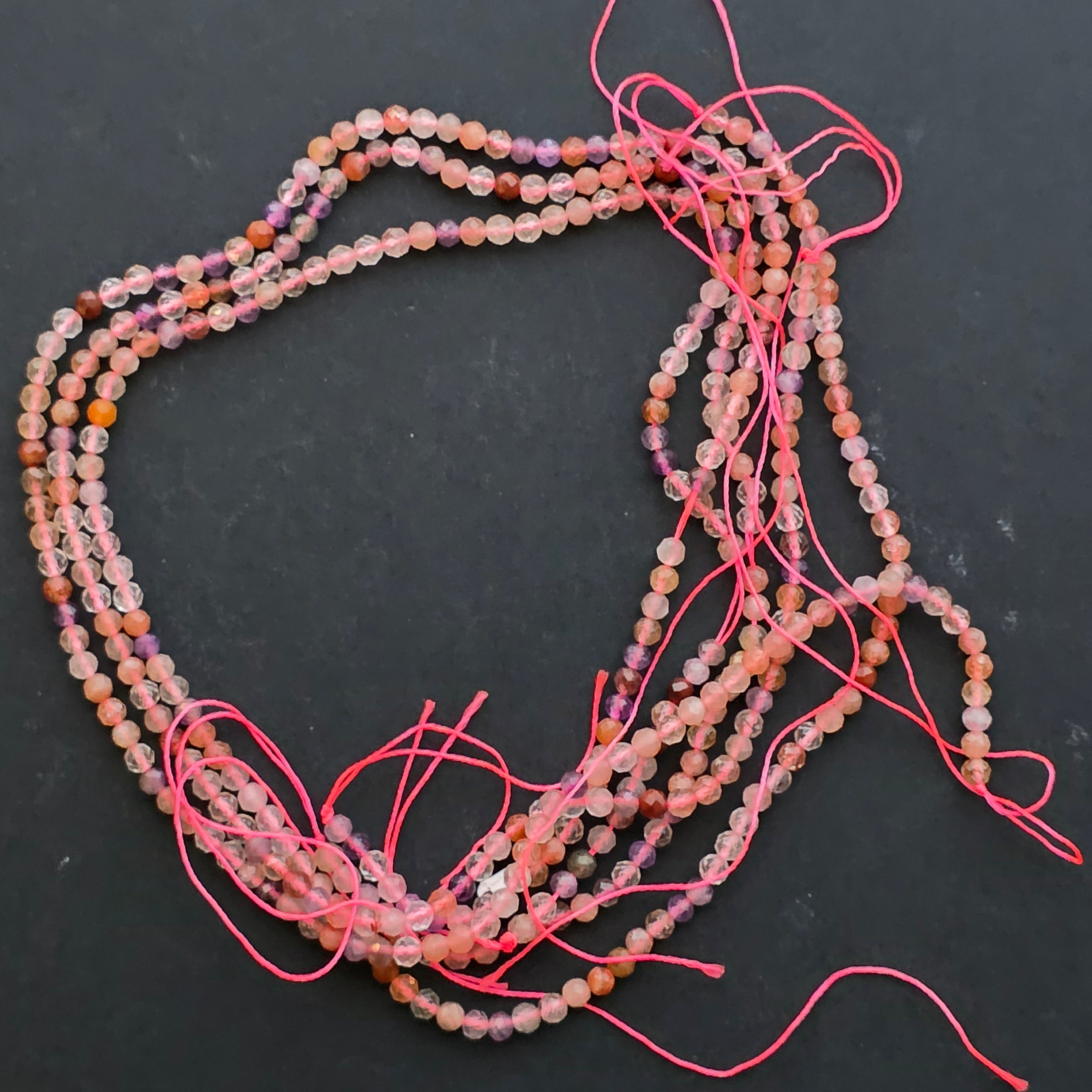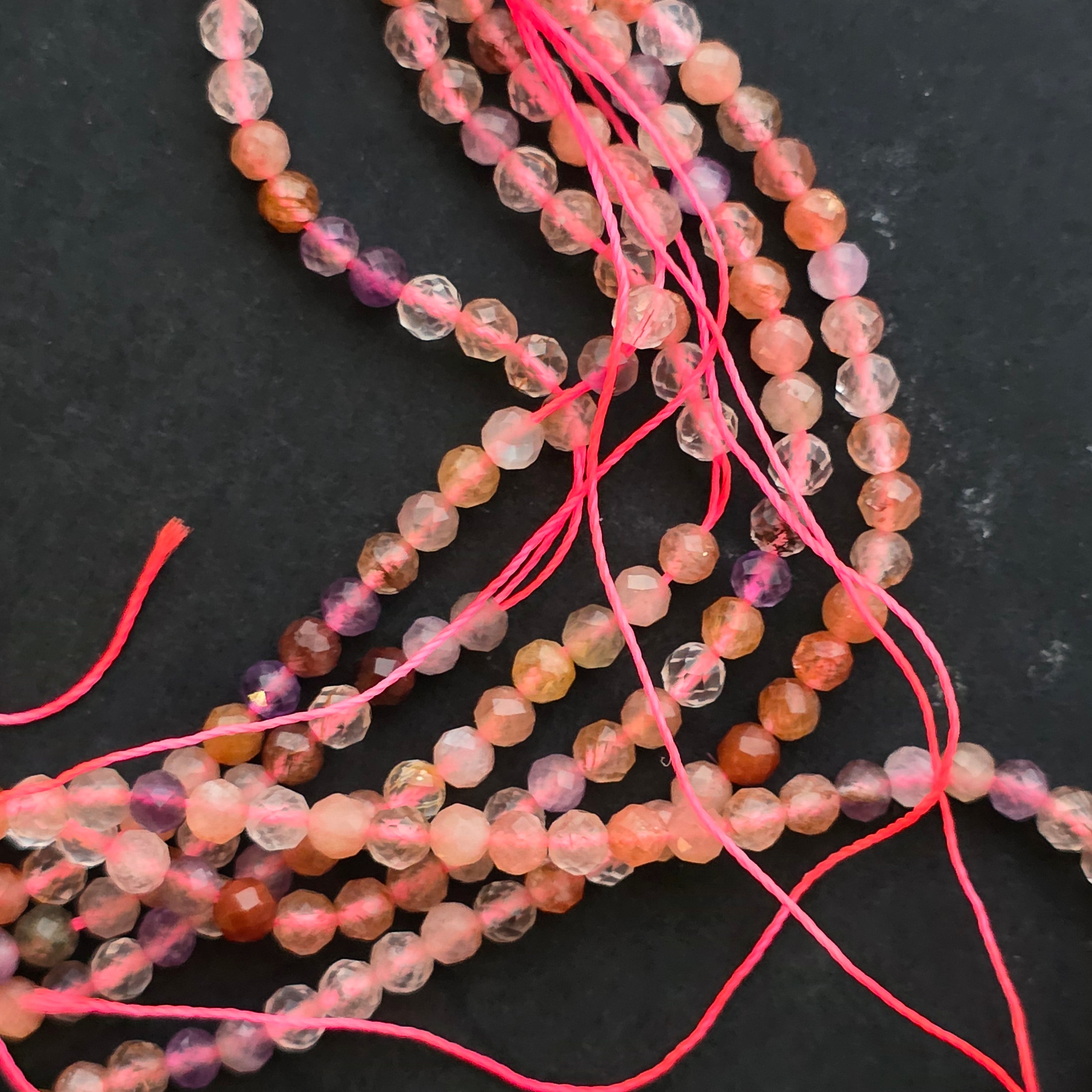 Hilo MIX AMATISTA, CUARZO ROSA, CORNALINA compuesto por cuentas esféricas naturales FACETADAS, perfecto para collares, pulseras u otras joyas hechas a mano.