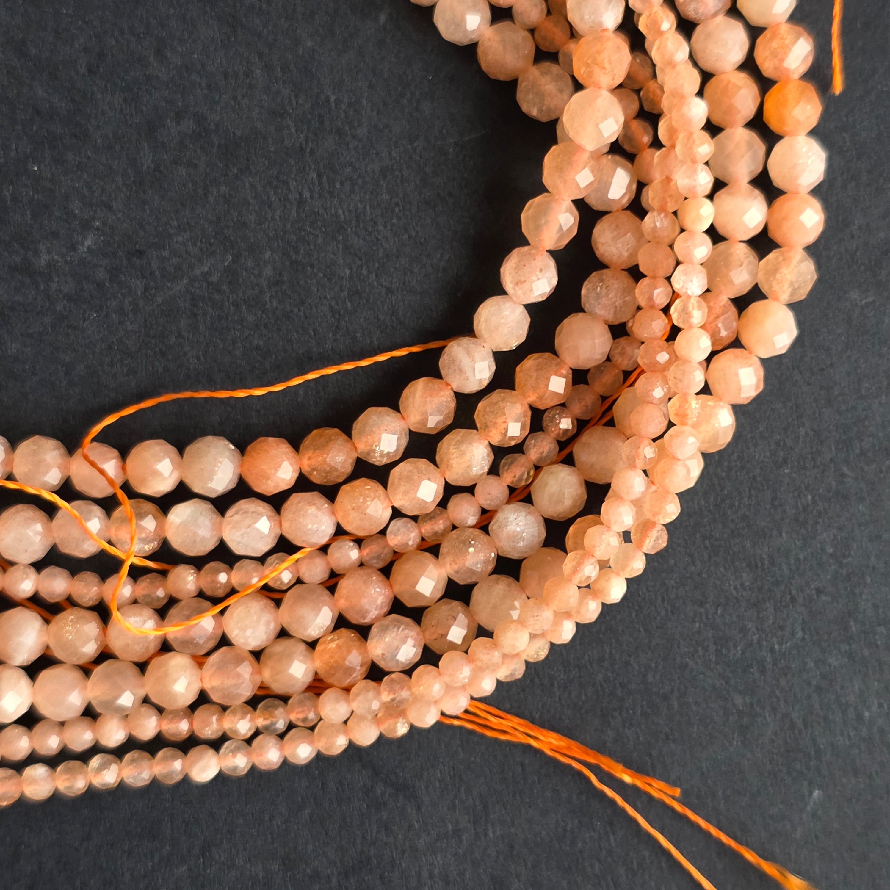 Hilo de PIEDRA DEL SOL compuesto por cuentas esféricas facetadas naturales, perfecto para collares, pulseras o cualquier otra joya artesanal.