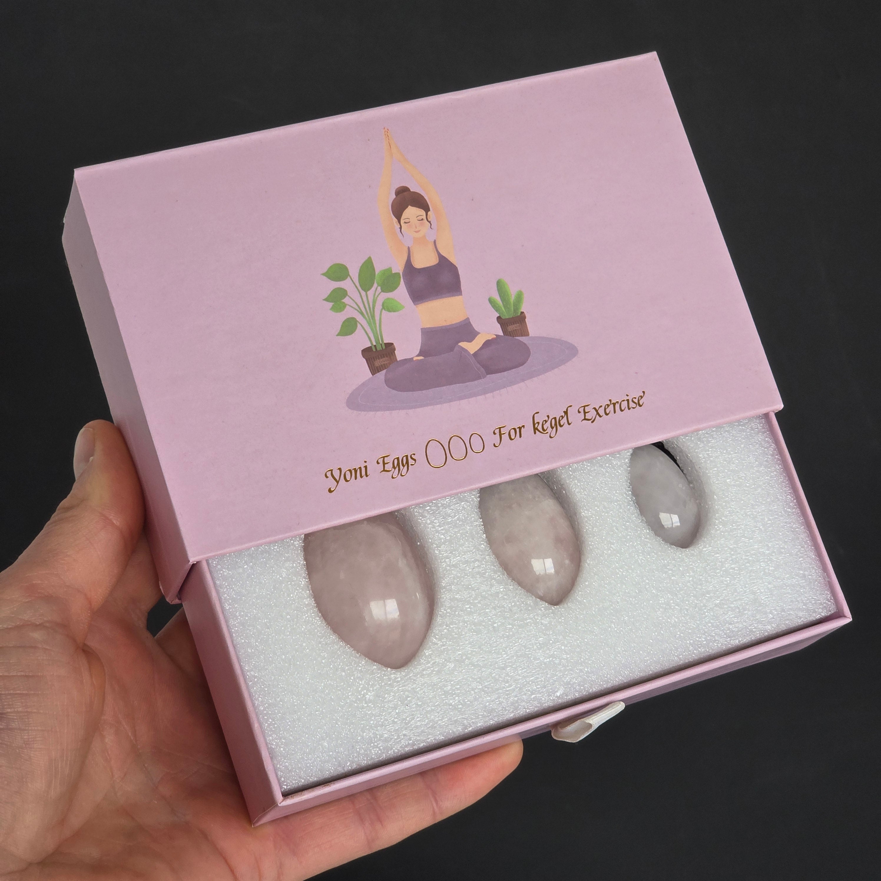 Huevos de cuarzo rosa Yoni - Juego de 3 piezas empaquetadas en una caja de regalo natural.