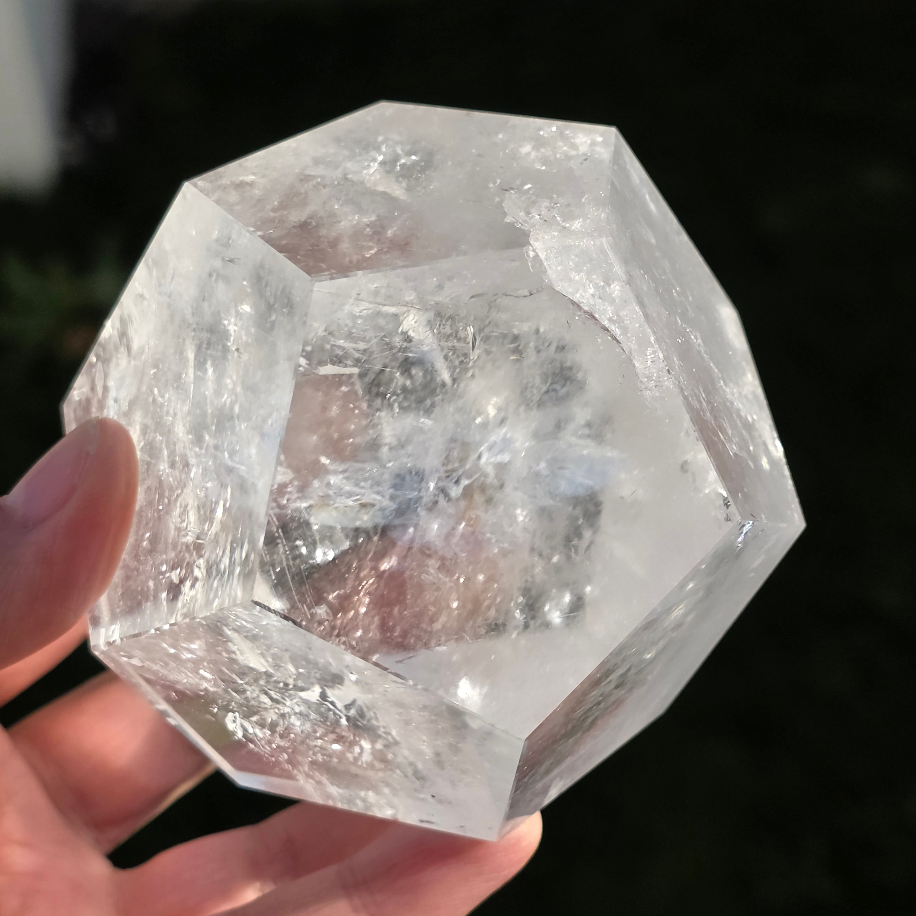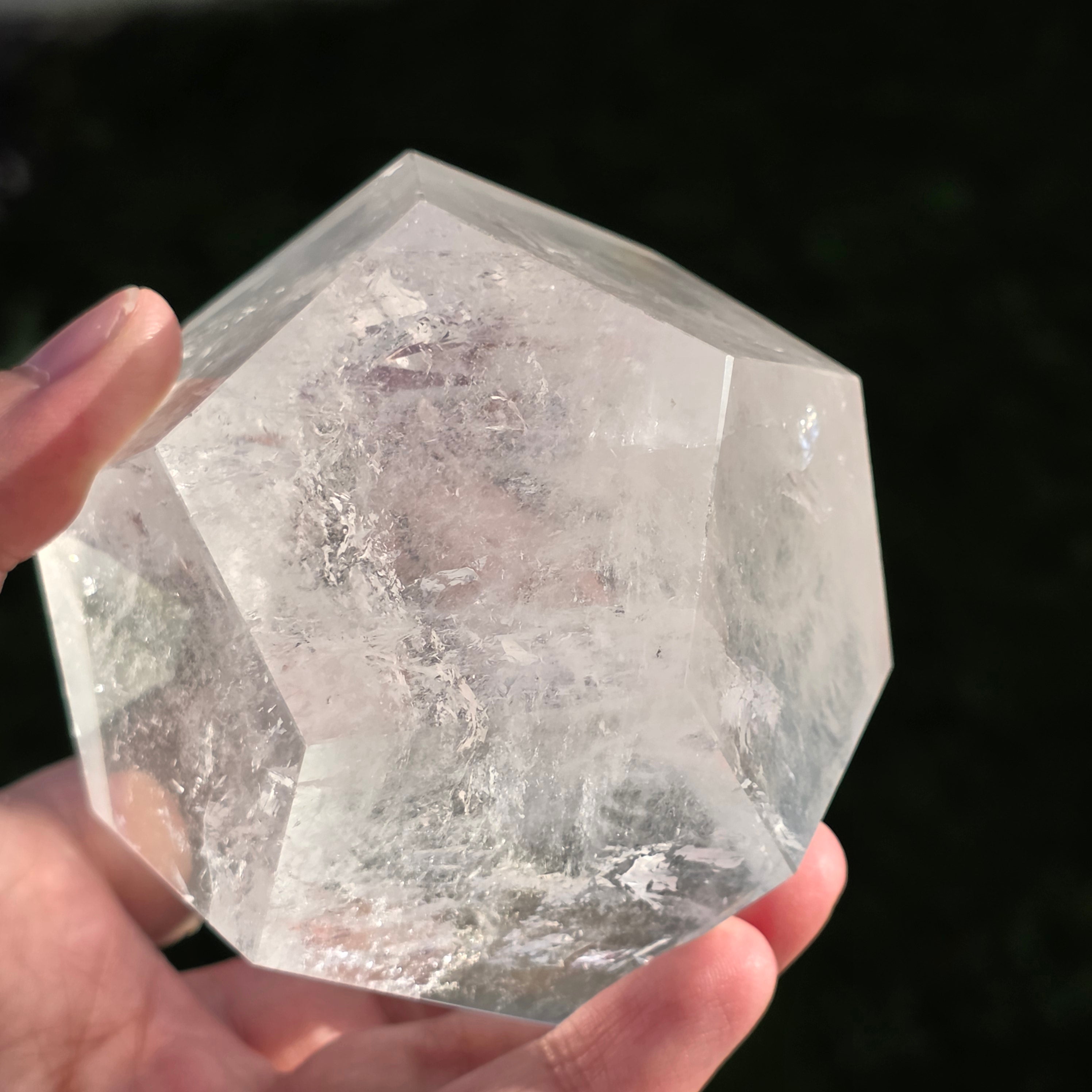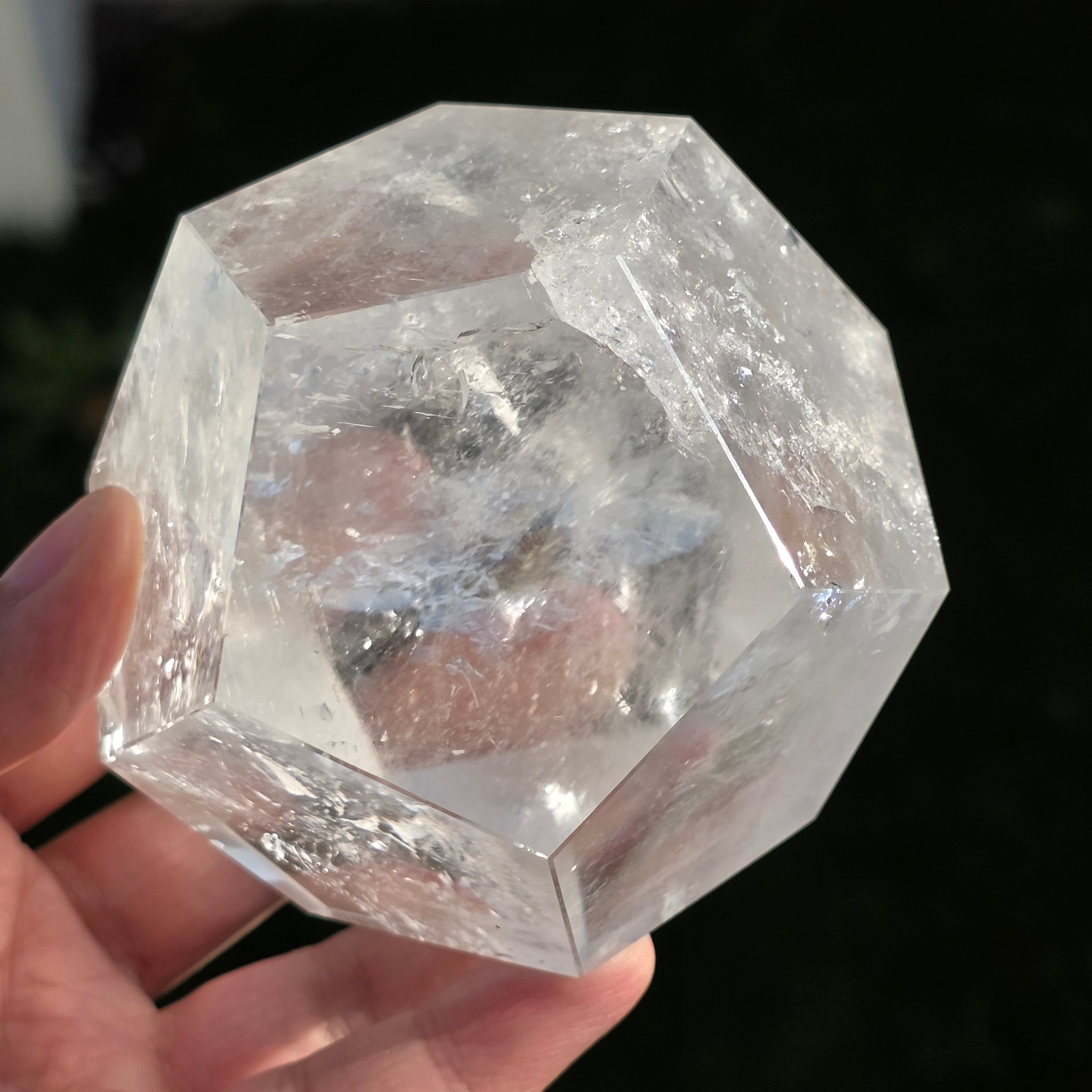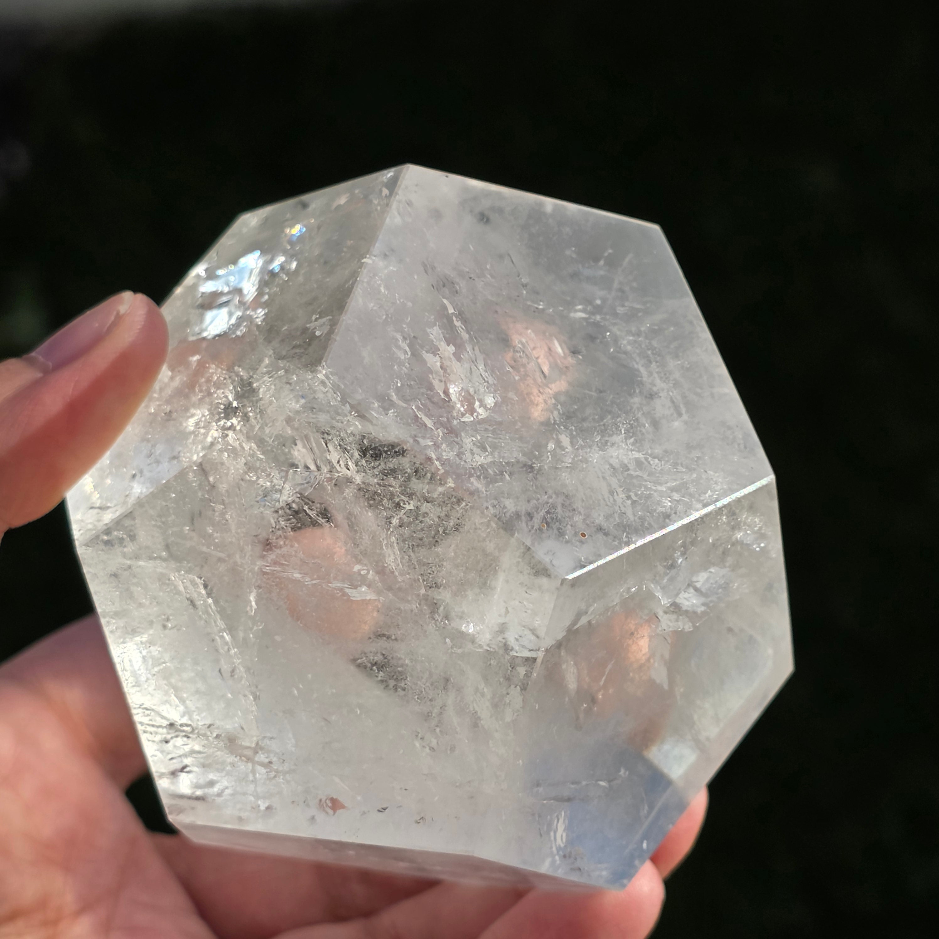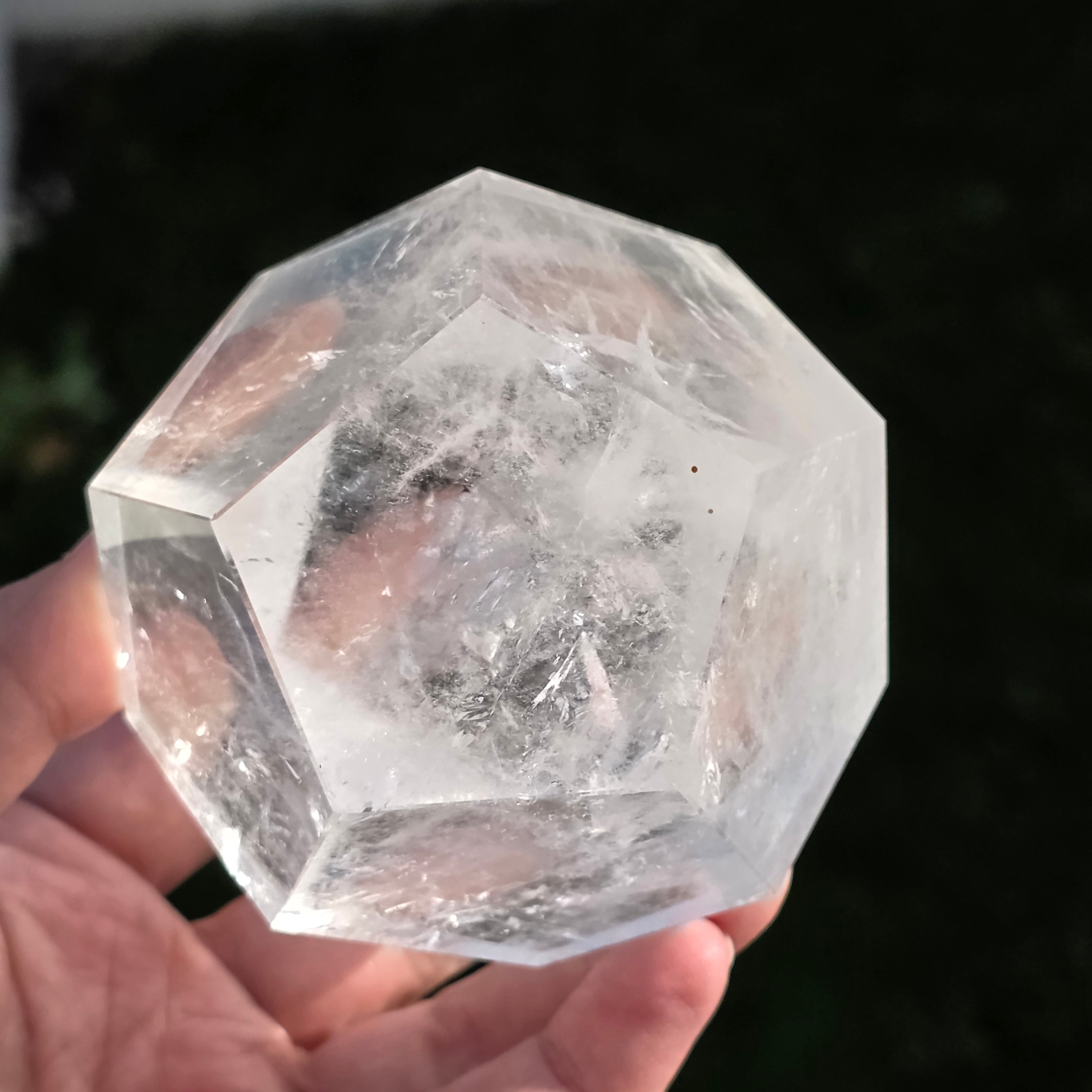 Icosaedro de cuarzo incoloro (cristal de roca), pulido a mano con precisión en forma de cuerpo platónico con 20 caras triangulares equiláteras.