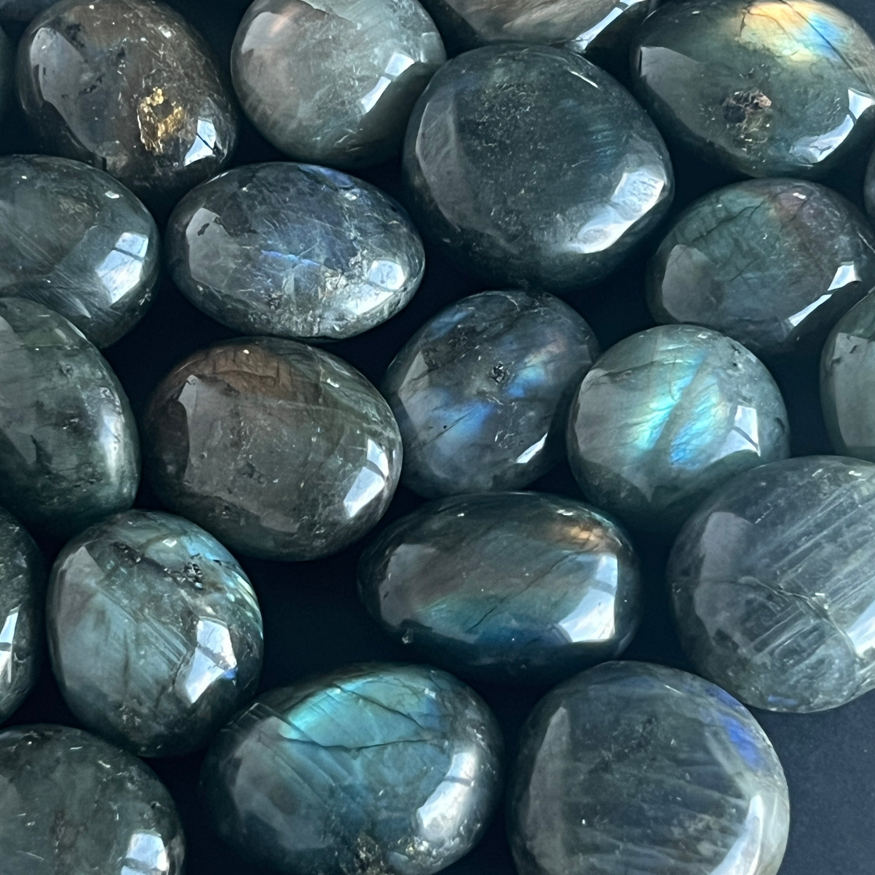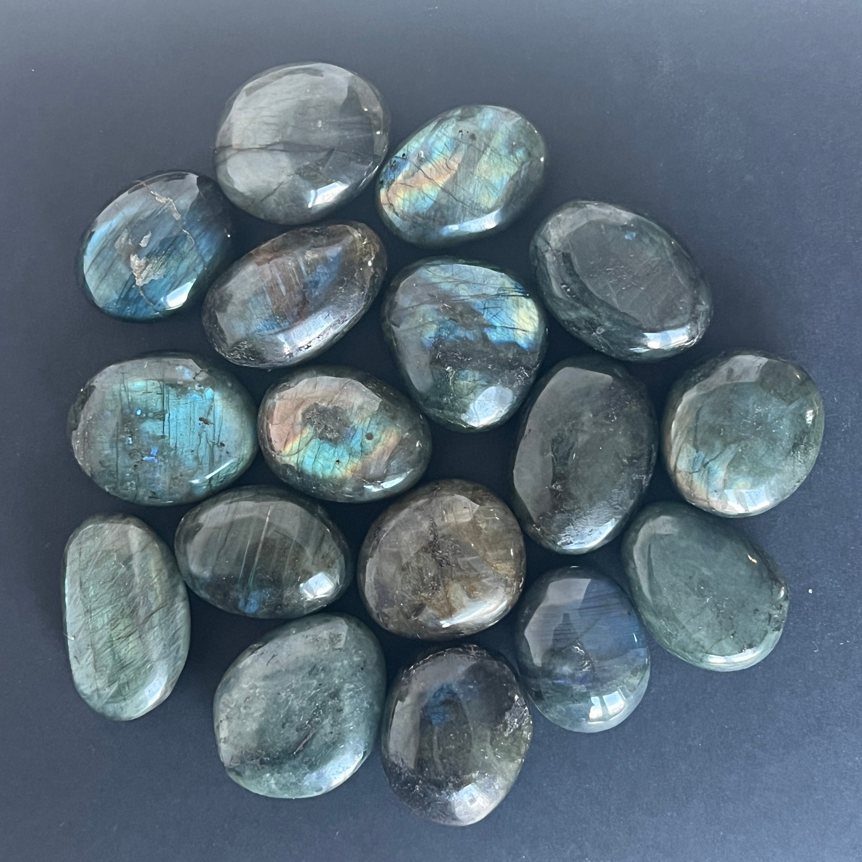 La piedra rodada de labradorita fascina por su labradorescencia única: reflejos azules y verdes que brillan a la luz. Considerada un cristal de transformación y protección energética, es ideal para la meditación, rejillas de cristales o uso diario como piedra de bolsillo.