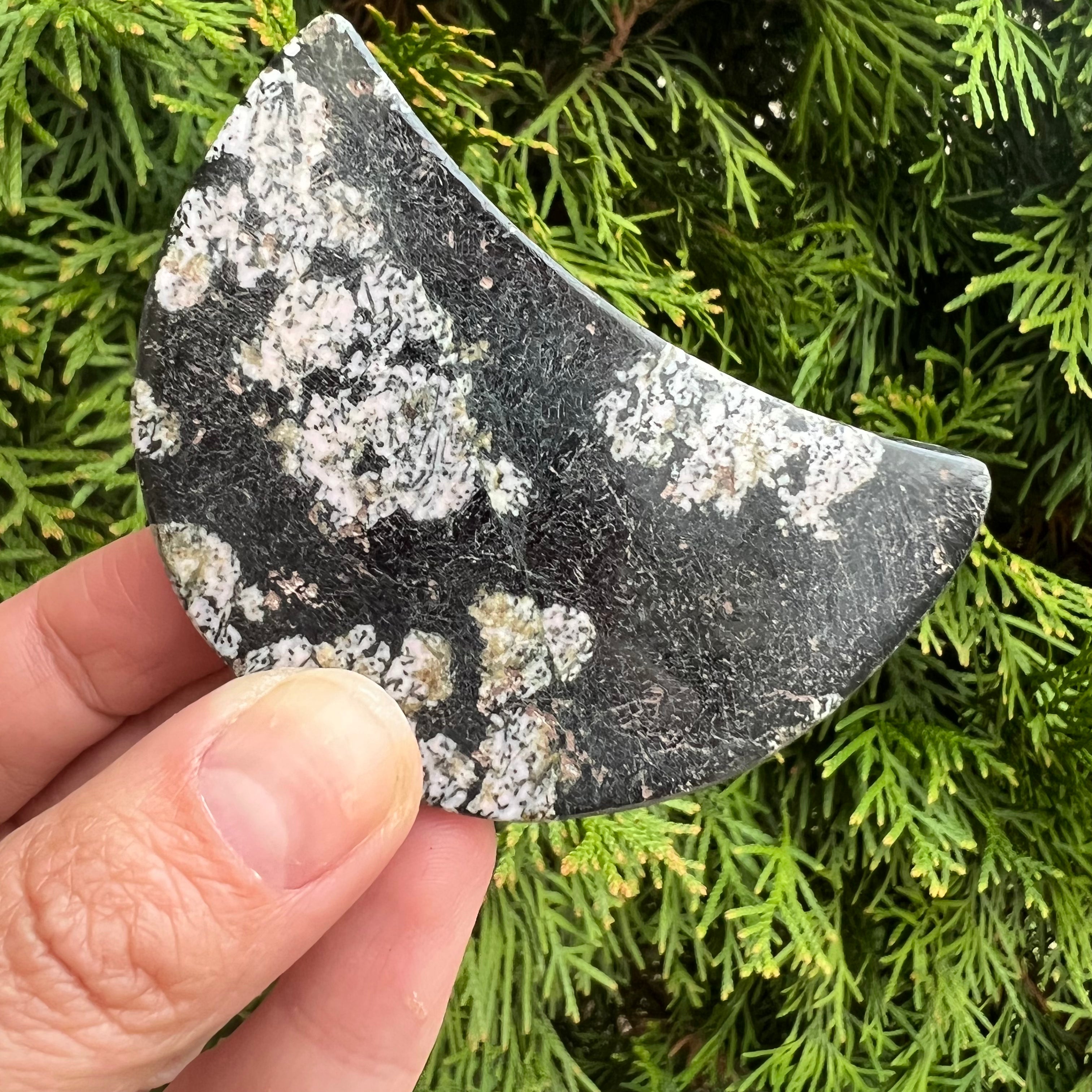 La obsidiana copo de nieve es una variedad de obsidiana formada por cristales de felspato blancos que se forman en el interior de la piedra, formando patrones de copos de nieve blancos o grises.