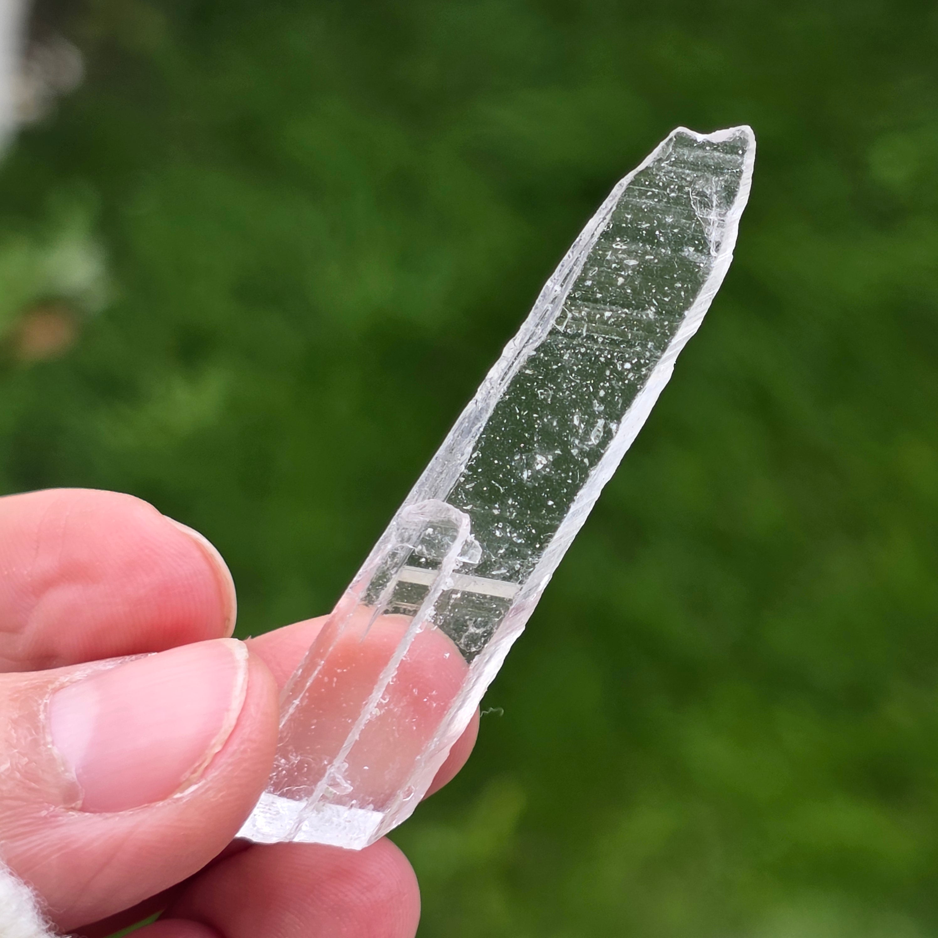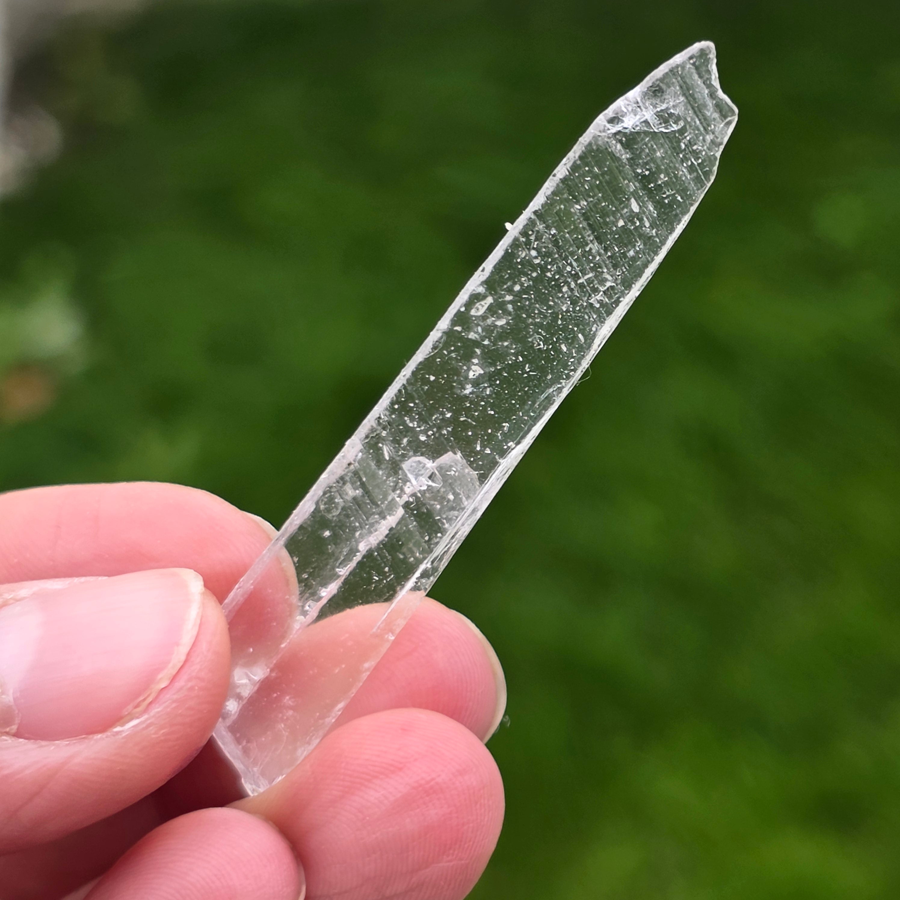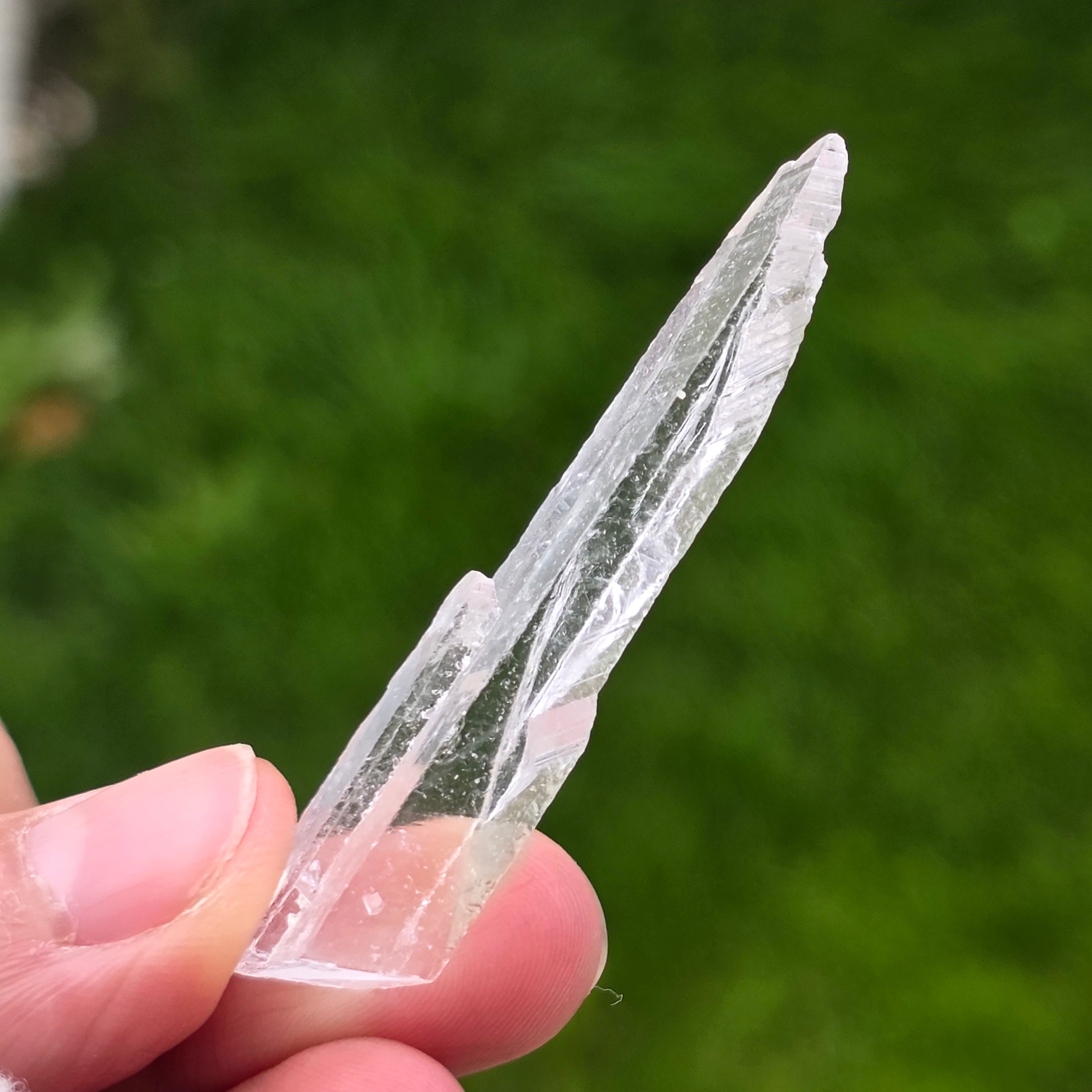 Los cristales se presentan en forma prismática, delgada, con terminaciones claras, teniendo una alta transparencia y un brillo discreto, casi vítreo. Su forma alargada y el modo de crecimiento confieren a cada ejemplar un carácter etéreo, visualmente frágil, pero bien definido mineralógicamente. Su aspecto limpio y uniforme hace que estas piezas sean extremadamente apreciadas en vitrinas de colección.