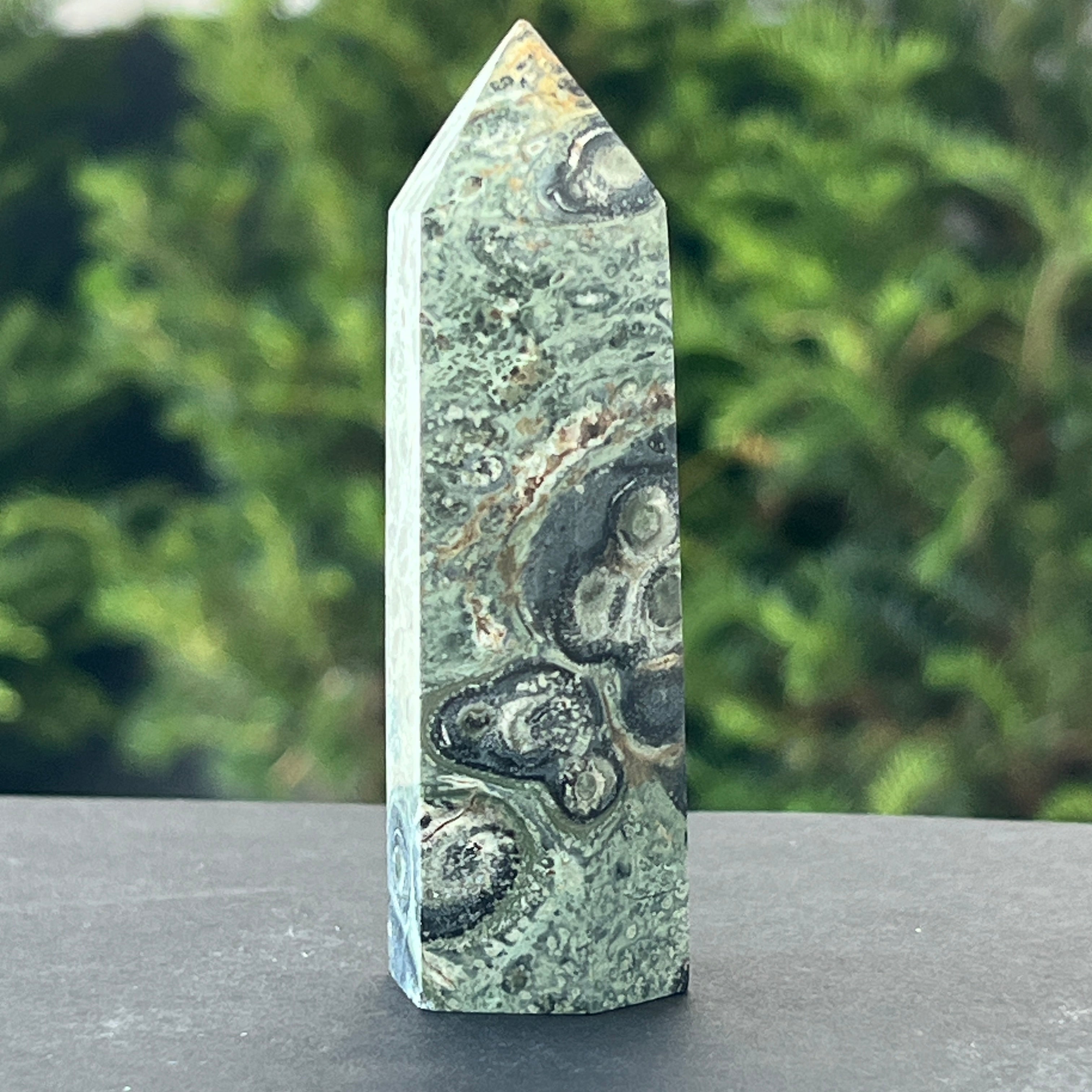 El jaspe Kambaba, también conocido como Jasper Kambala, es una variedad de jaspe de origen volcánico. Está compuesto por una combinación de cristales verdes y negros, creando un patrón hermoso y distintivo. Recibe su nombre de la región de Kambaba en Madagascar, donde se encuentra con frecuencia.