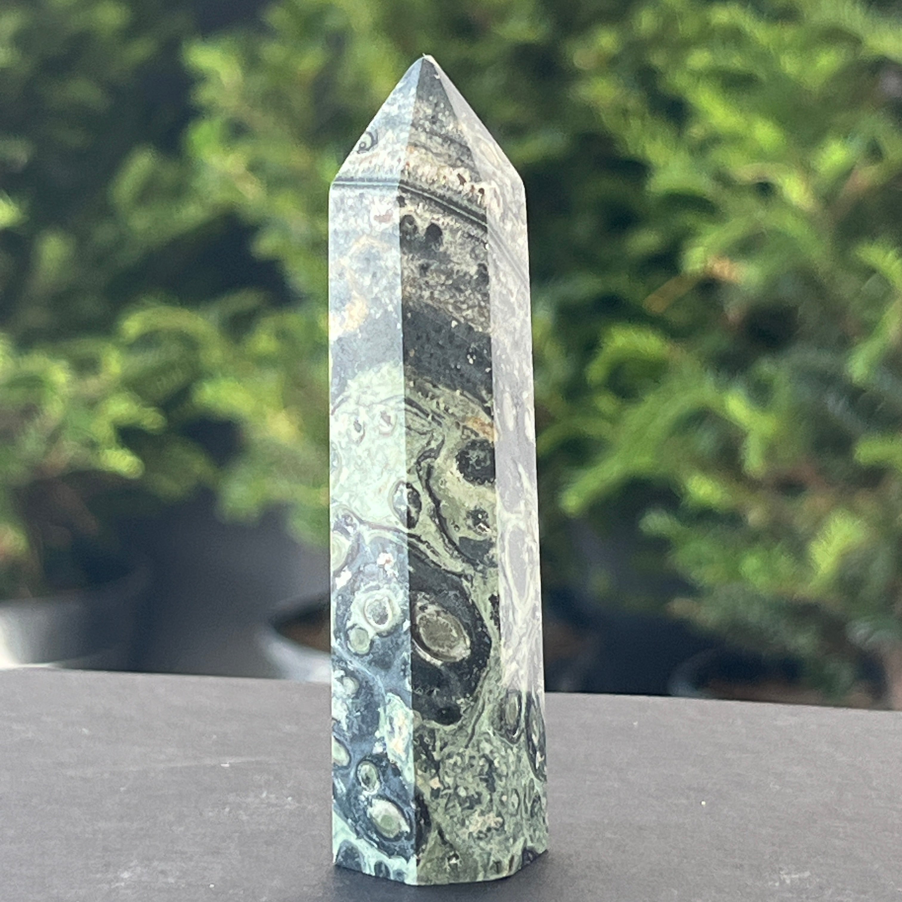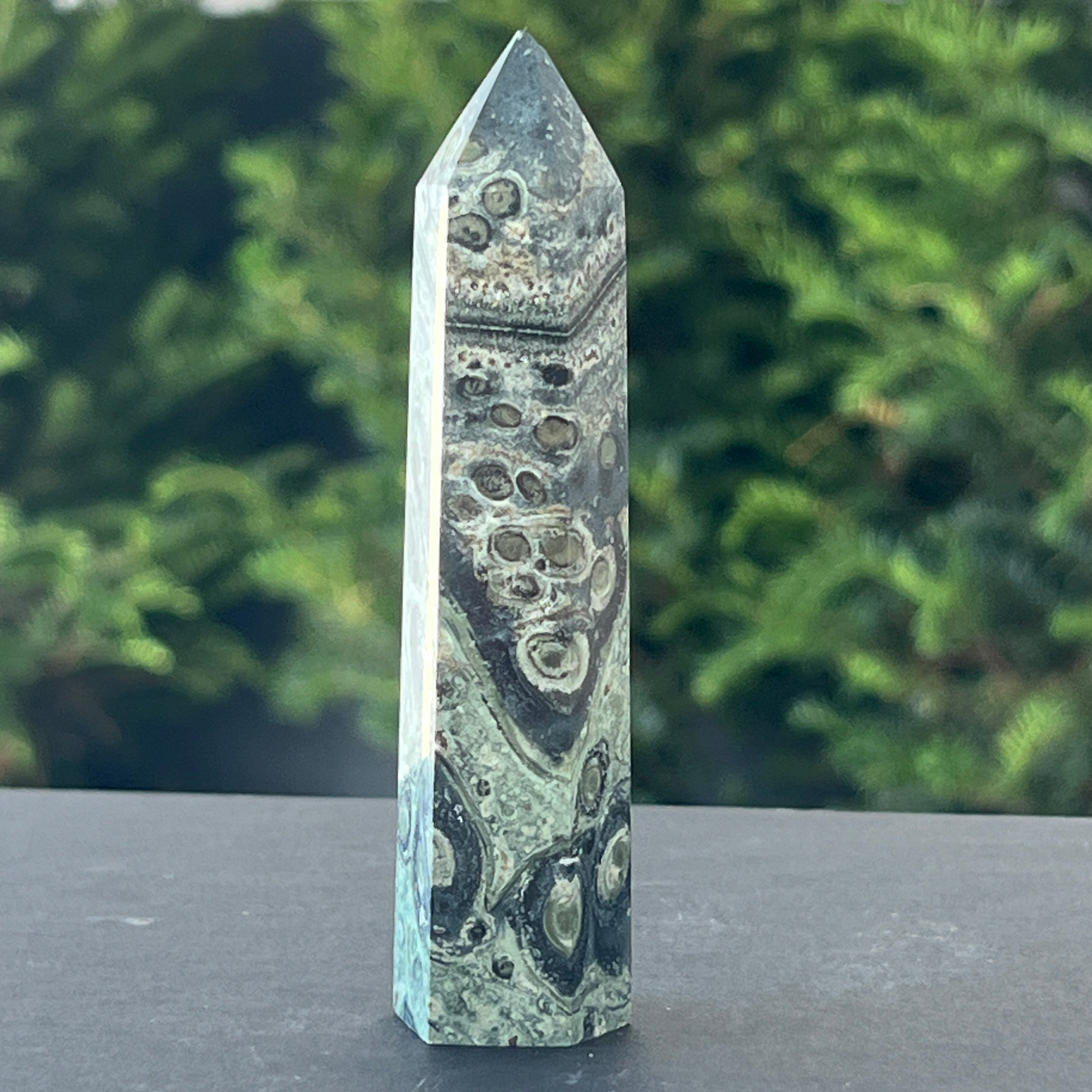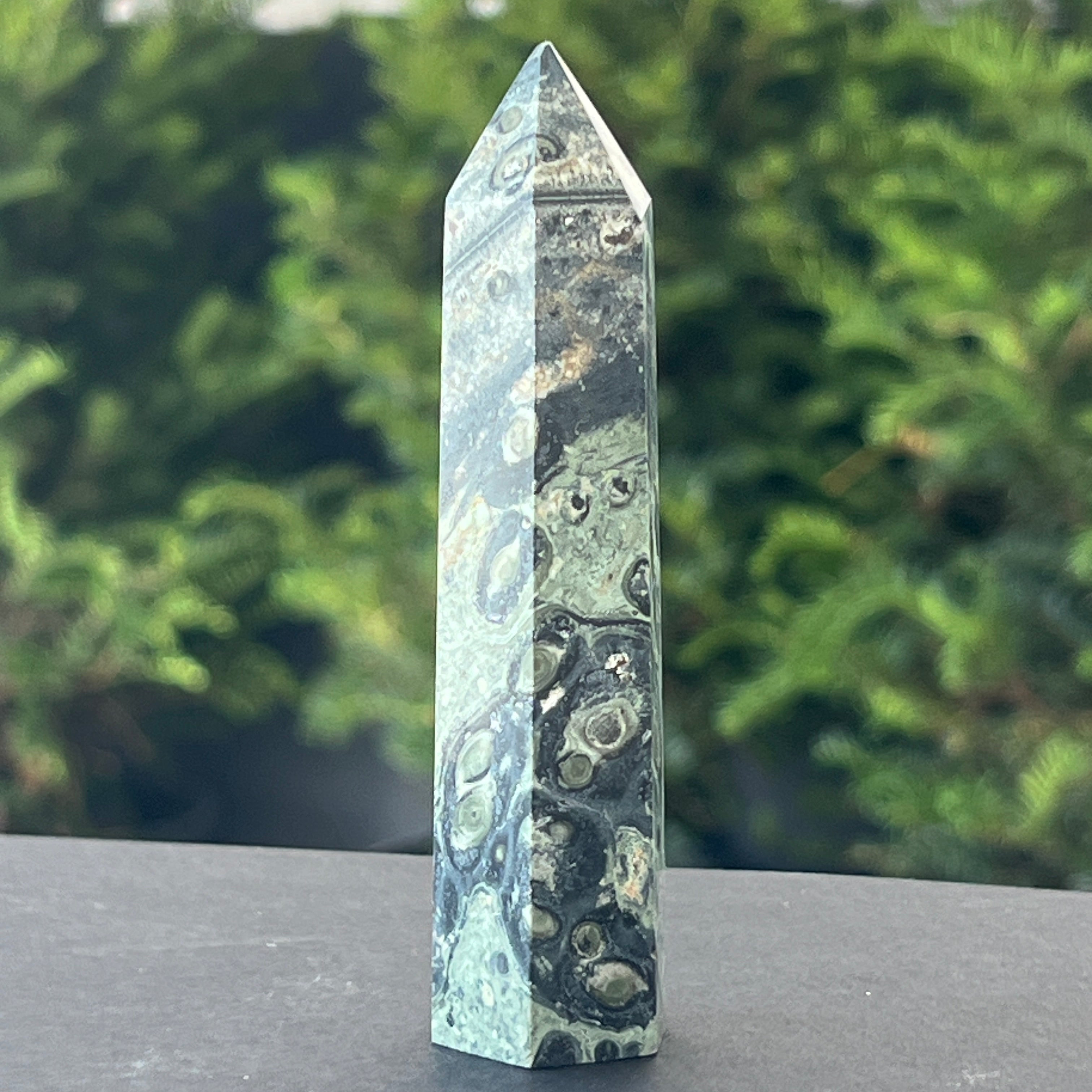 El jaspe Kambaba, también conocido como Jaspe Kambala, es una variedad de jaspe de origen volcánico. Está compuesto por una combinación de cristales verdes y negros, creando un patrón bello y distintivo. Recibe su nombre de la región de Kambaba en Madagascar, donde se encuentra con frecuencia.