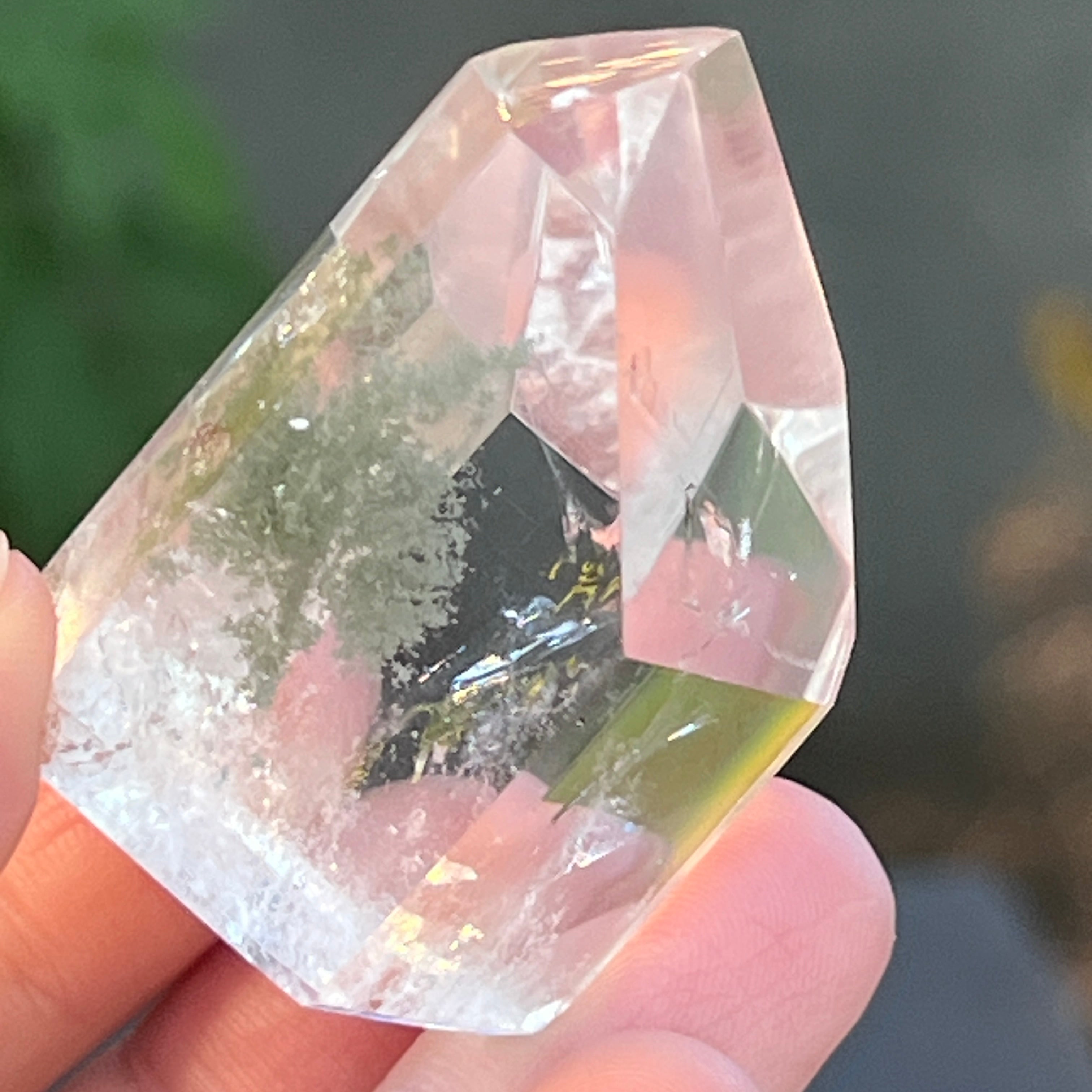 El cuarzo con clorita es una fascinante variedad de cuarzo incoloro que presenta inclusiones verdes, debidas al mineral clorita. Estas inclusiones varían desde formas delicadas y finas, como filamentos, hasta formas más densas y dispersas, dependiendo de cómo se haya capturado la clorita en la masa de cuarzo durante su formación.