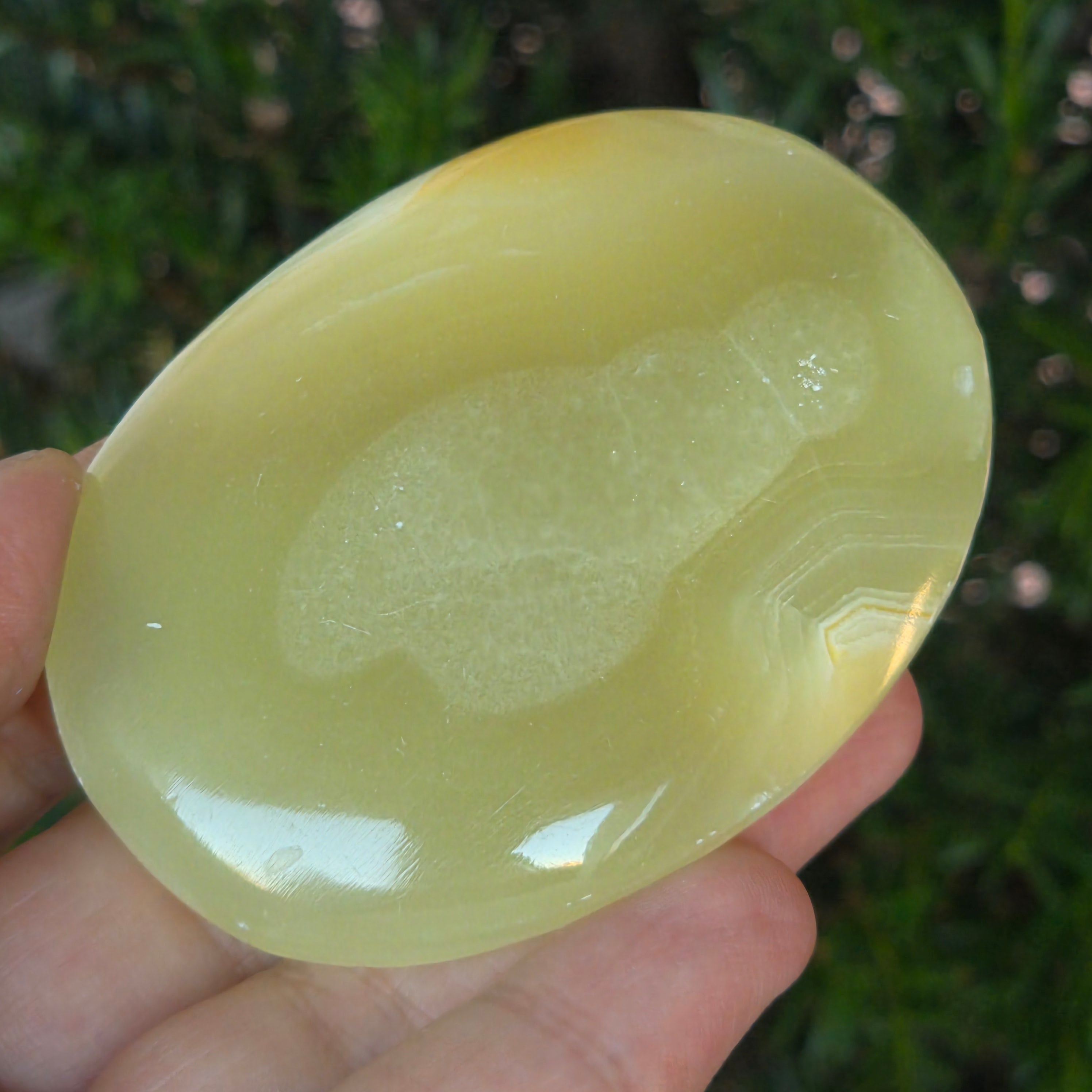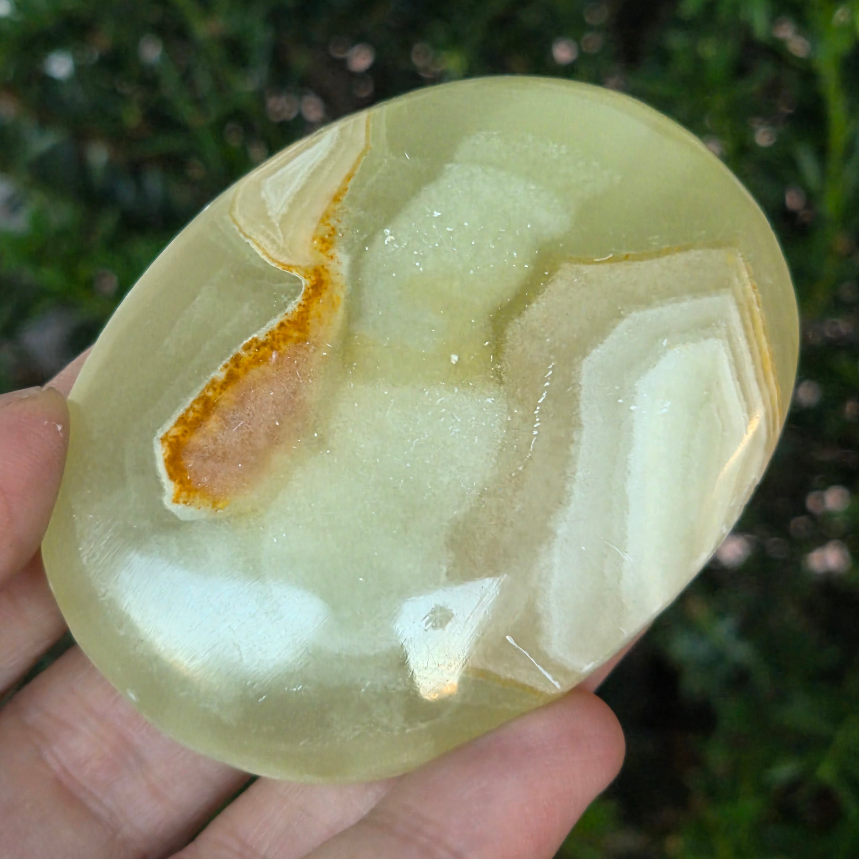 Sostenida entre las palmas, esta palmstone de ónix verde natural se convierte en un aliado del equilibrio, un recordatorio silencioso de la armonía entre cuerpo y espíritu. Es ideal para meditación, relajación o simplemente como objeto decorativo con energía suave y refinada.
