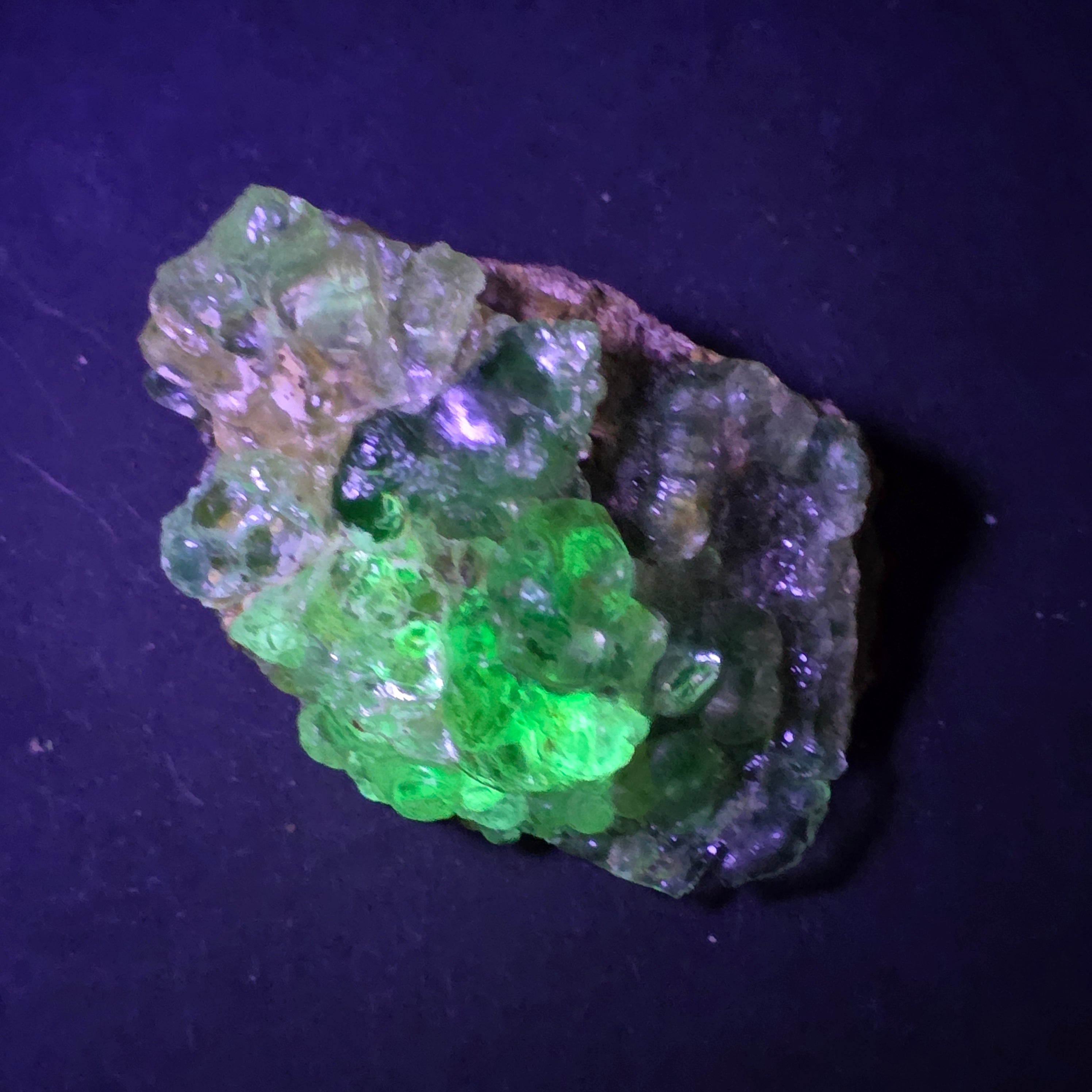 Con luz natural aparece el ópalo hialita. de incoloro a blanco translúcido, de apariencia discreta y elegante. Sin embargo, bajo la luz ultravioleta, el mineral se transforma completamente, emitiendo una resplandor verde neón, fuerte y uniforme, efecto que lo hace muy buscado por los coleccionistas. Esta fluorescencia se debe a las trazas naturales de uranio en su estructura, presentes en cantidades muy pequeñas y estables.