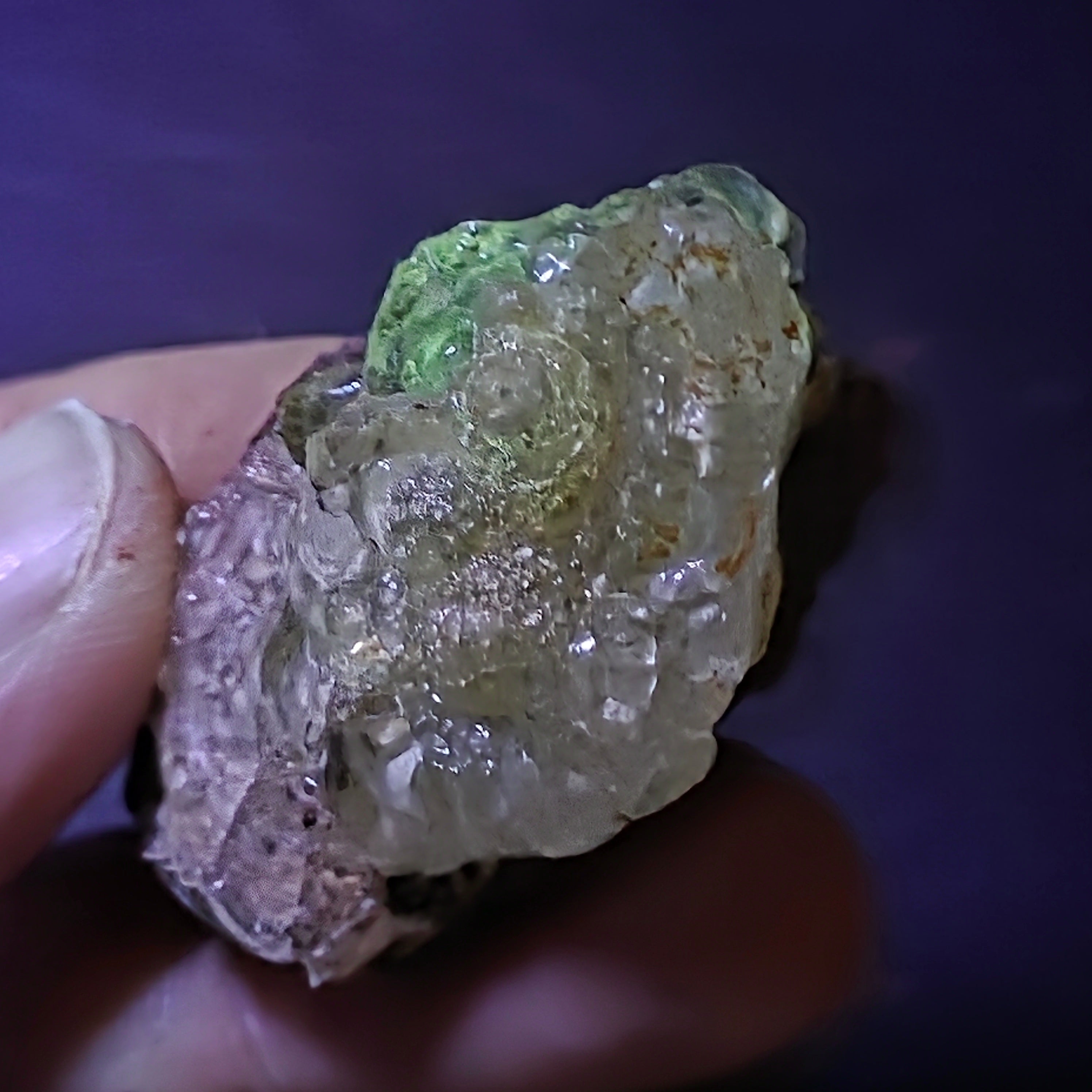 A la luz natural, el opalo hialito aparece incoloro hasta blanco translúcido, con un aspecto discreto y elegante. Sin embargo, bajo luz ultravioleta, el mineral se transforma por completo, emitiendo un resplandor verde neón, fuerte y uniforme, efecto que lo hace extremadamente buscado por coleccionistas. Esta fluorescencia se debe a las trazas naturales de uranio en su estructura, presentes en cantidades muy pequeñas y estables.