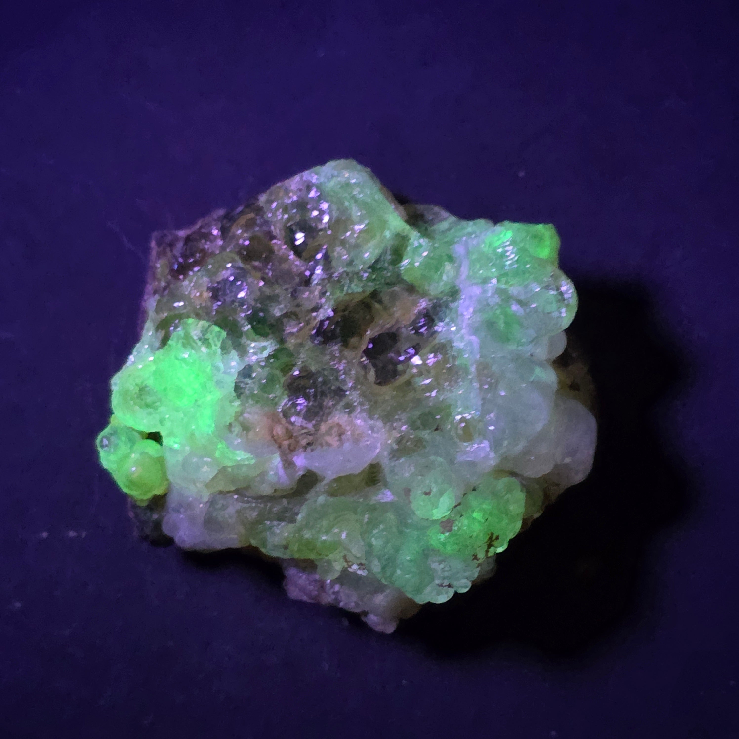 A la luz natural, el ópalo hialito aparece incoloro hasta blanco translúcido, con un aspecto discreto y elegante. Sin embargo, bajo luz ultravioleta, el mineral se transforma por completo, emitiendo un resplandor verde neón, fuerte y uniforme, efecto que lo hace muy buscado por coleccionistas. Esta fluorescencia se debe a rastros naturales de uranio en su estructura, presentes en cantidades muy pequeñas y estables.