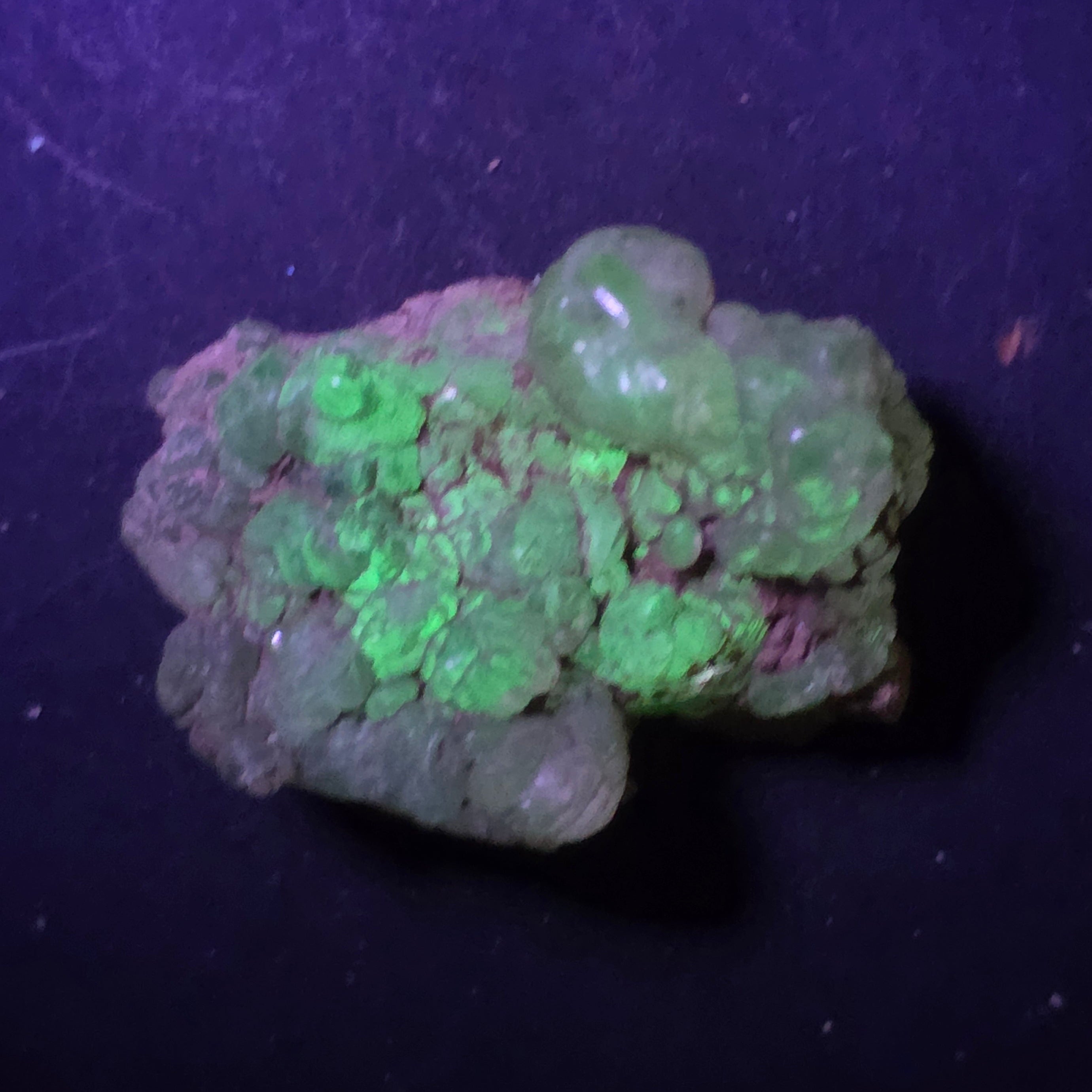 A la luz natural, el ópalo hialito aparece incoloro hasta blanco translúcido, con un aspecto discreto y elegante. Sin embargo, bajo luz ultravioleta, el mineral se transforma por completo, emitiendo un resplandor verde neón, fuerte y uniforme, efecto que lo hace muy buscado por coleccionistas. Esta fluorescencia se debe a rastros naturales de uranio en su estructura, presentes en cantidades muy pequeñas y estables.