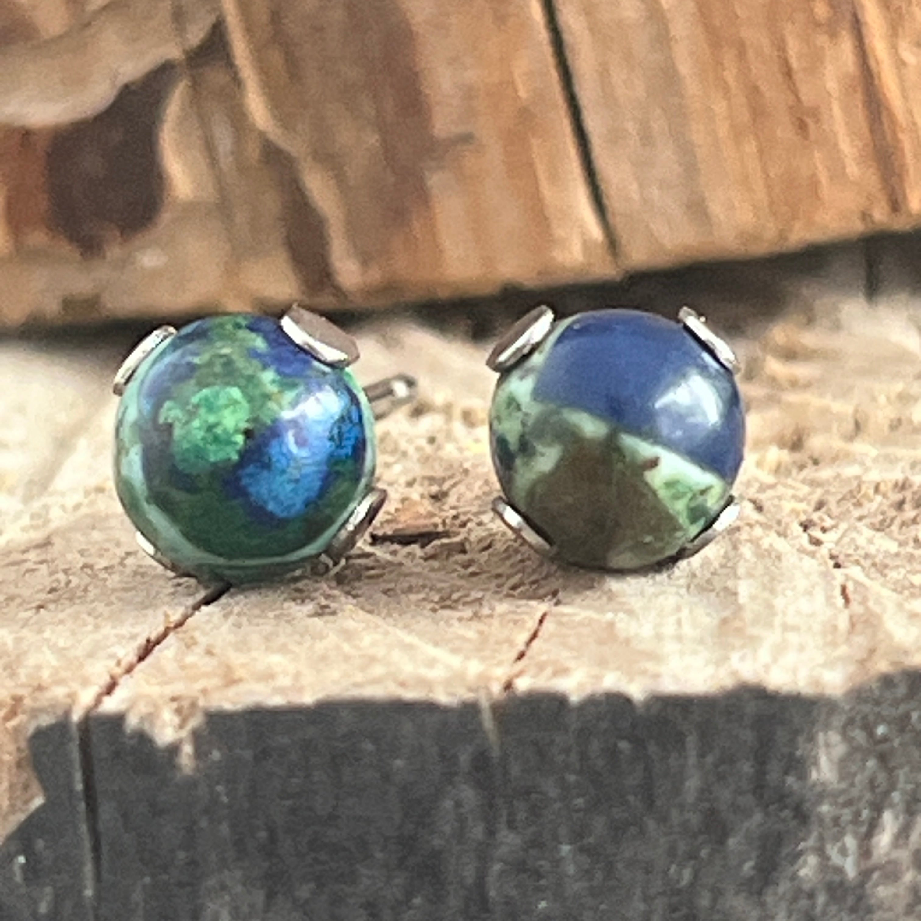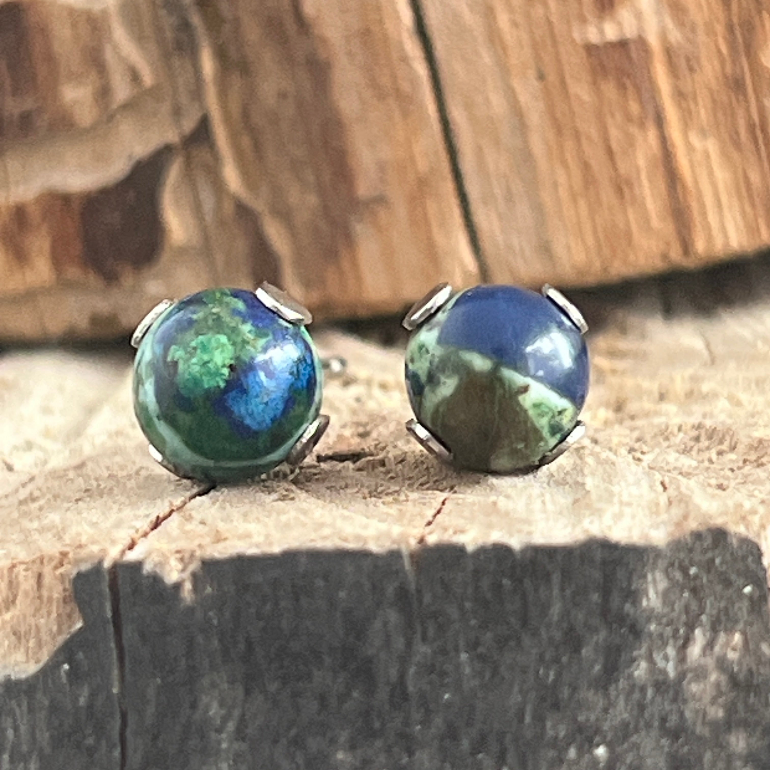 Estos aretes de crisocola natural parecen fragmentos de océano solidificados en el tiempo. Sus tonalidades se entrelazan en tonos de azul intenso y verde turquesa, como una danza de aguas tranquilas y bosques tropicales.