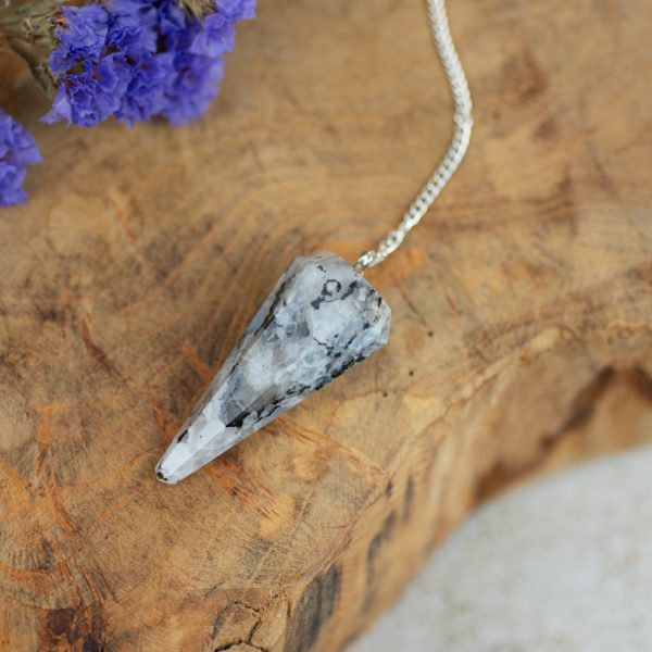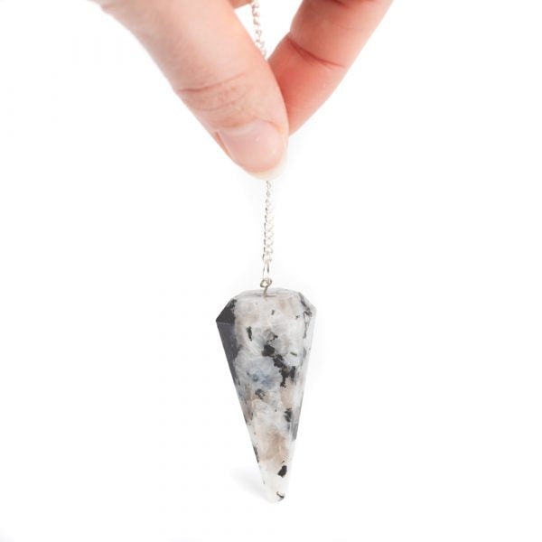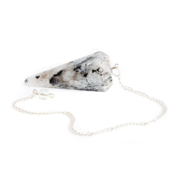 Péndulo de piedra de luna facetada con bola de cuarzo