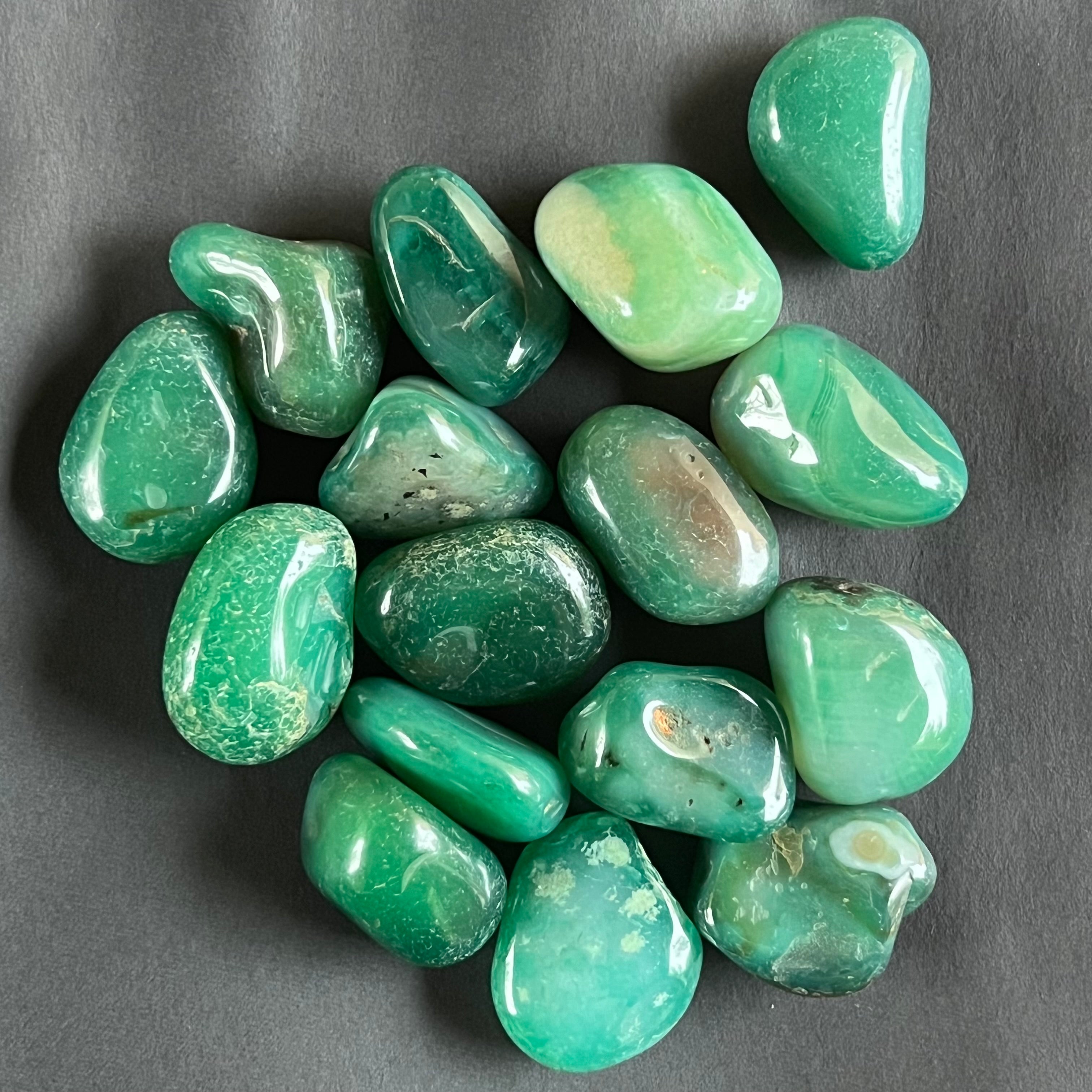 El ágata verde es una piedra semipreciosa popular, parte de la familia del cuarzo, apreciada por sus distintos tonos de verde, desde verde pálido hasta verde oscuro, a veces con bandas sutiles o patrones únicos. Es reconocido por su belleza natural y propiedades beneficiosas.