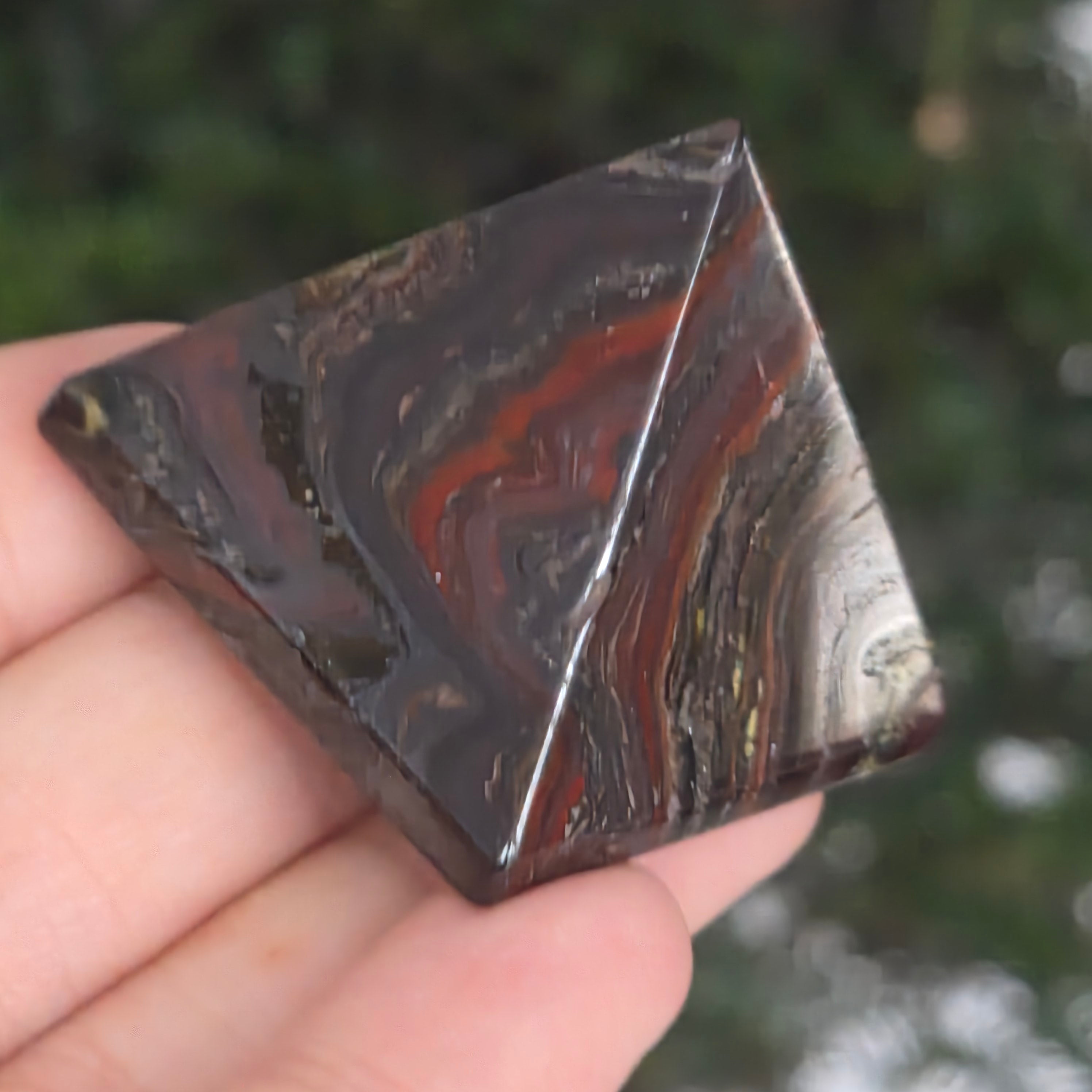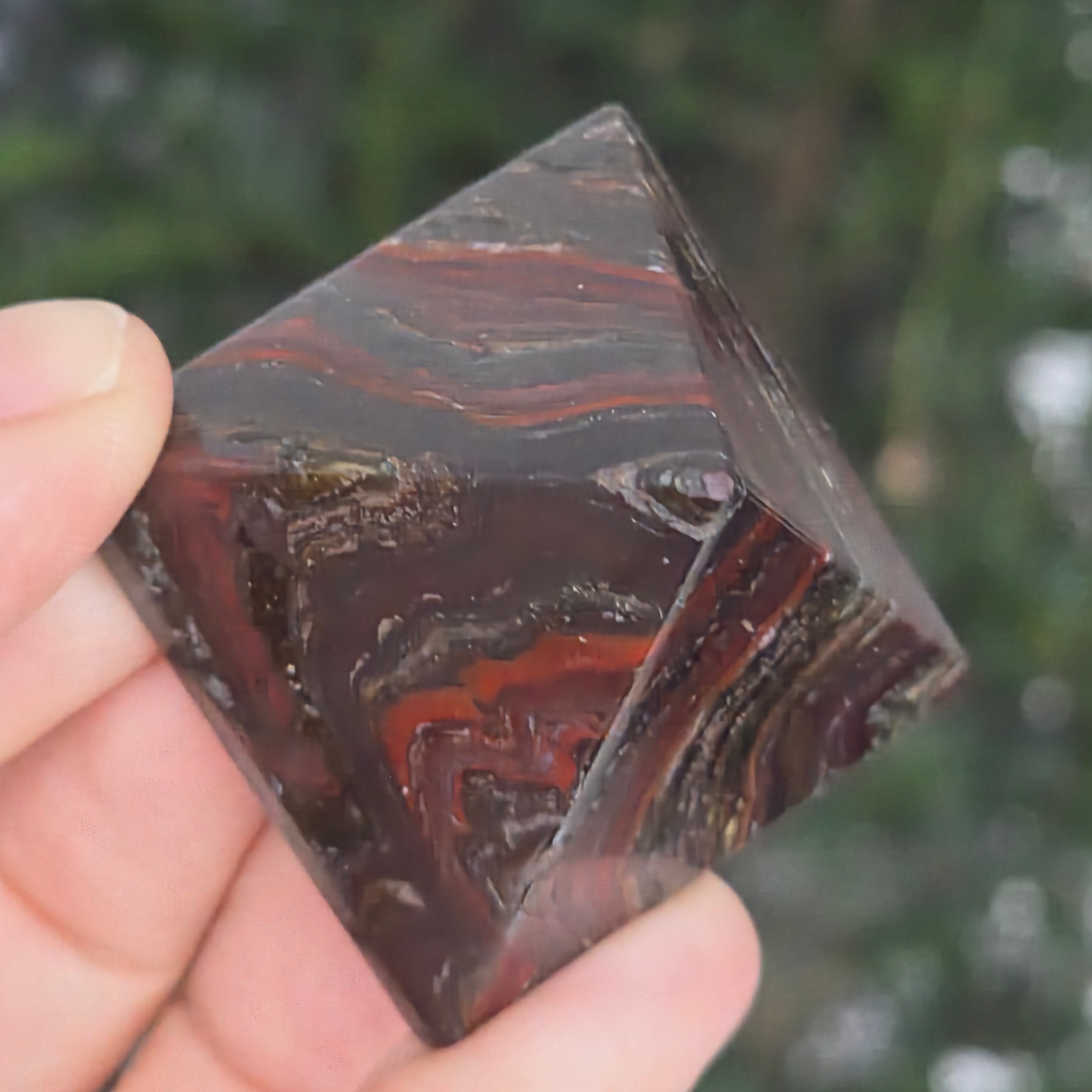 Una pirámide que lleva los colores del fuego interior y la tierra ancestral. Esto pieza de jaspe rojo natural con inclusiones de hematita, revela un espectáculo de tonos cálidos (rojo ladrillo, marrón y gris metalizado) atravesados por rayas naturales y reflejos brillantes. La superficie perfectamente pulida resalta los contrastes y la rica textura, dándole una presencia fuerte y noble.
