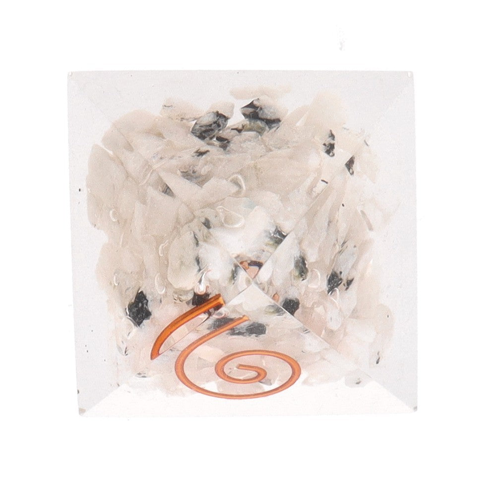 La pirámide de piedra lunar en resina fascina por sus reflejos iridiscentes, que parecen traer la luz de la luna a tus manos.