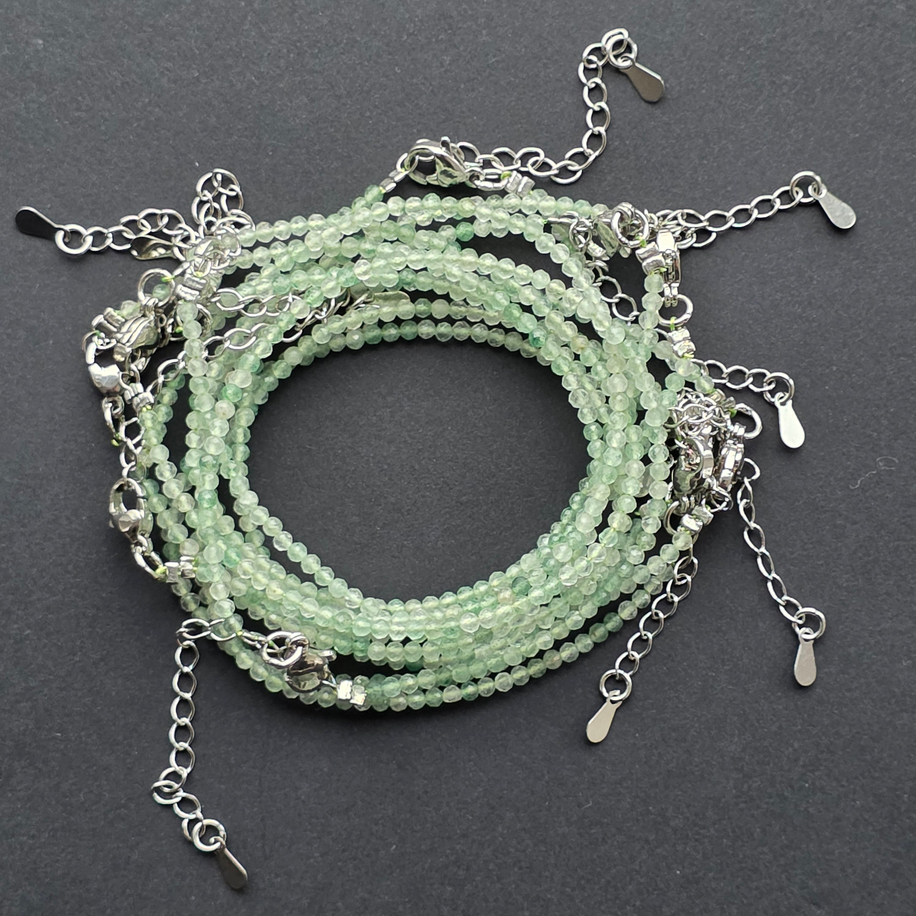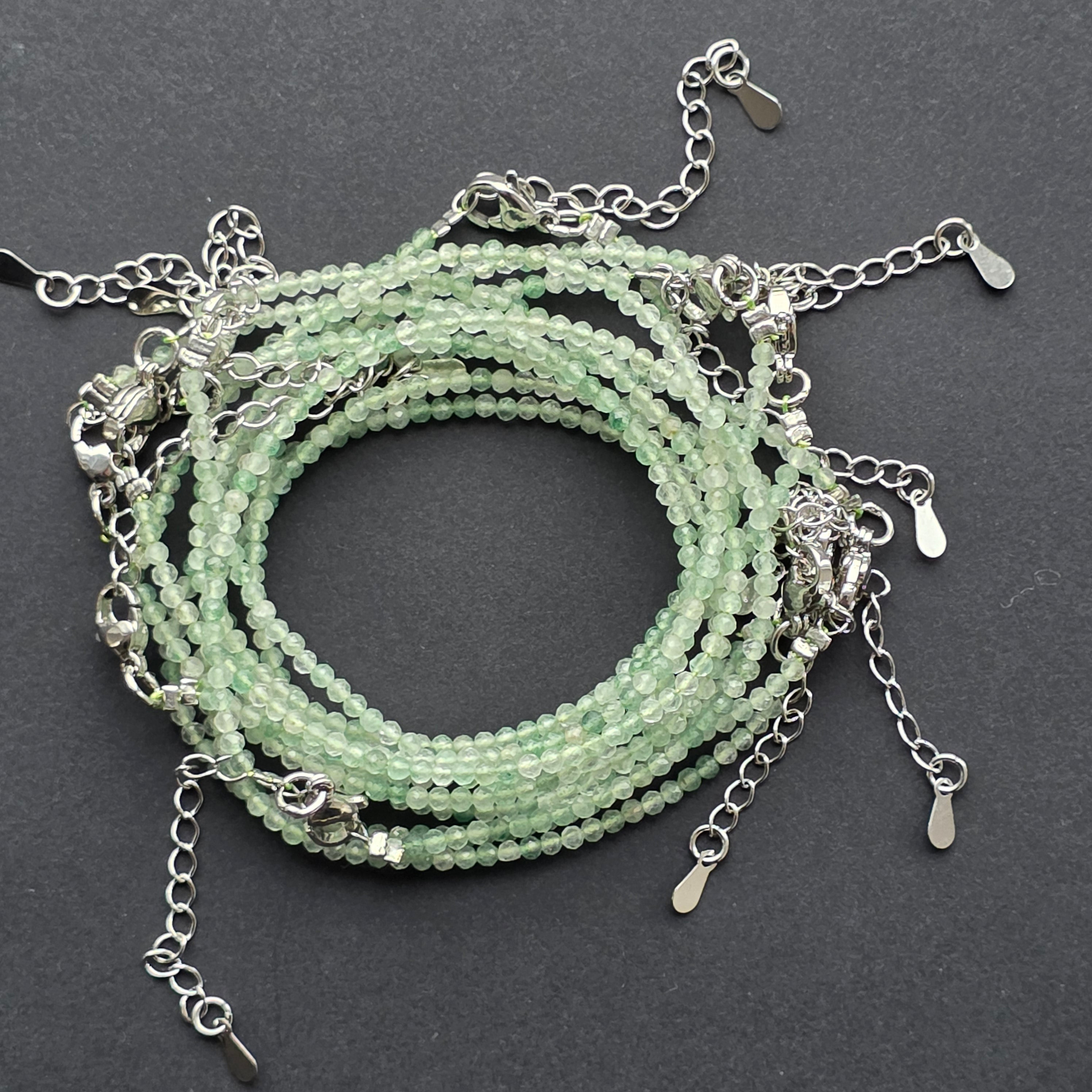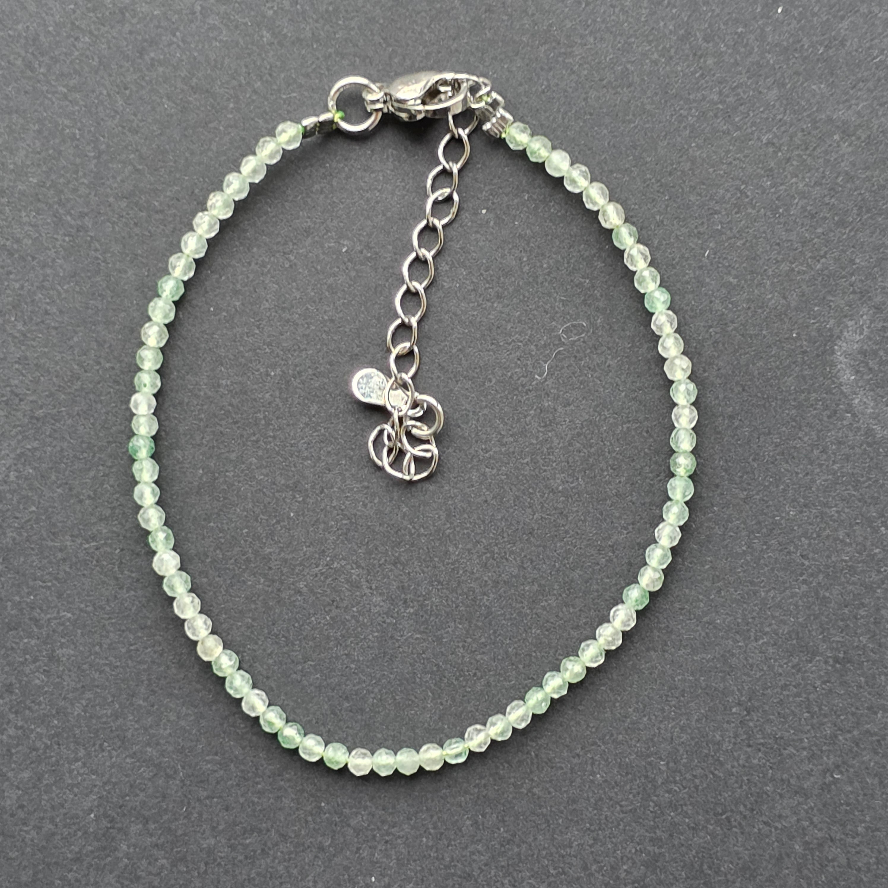 La aventurina, la piedra del optimismo y de la frescura del alma, revela su magia en sus diminutas cuentas de 2 mm, facetadas para capturar la luz en tonos verdes, finos como un comienzo de primavera. La pulsera parece casi pintada en tonalidades suaves — una respiración tranquila, una energía sutil, discreta, pero siempre presente.