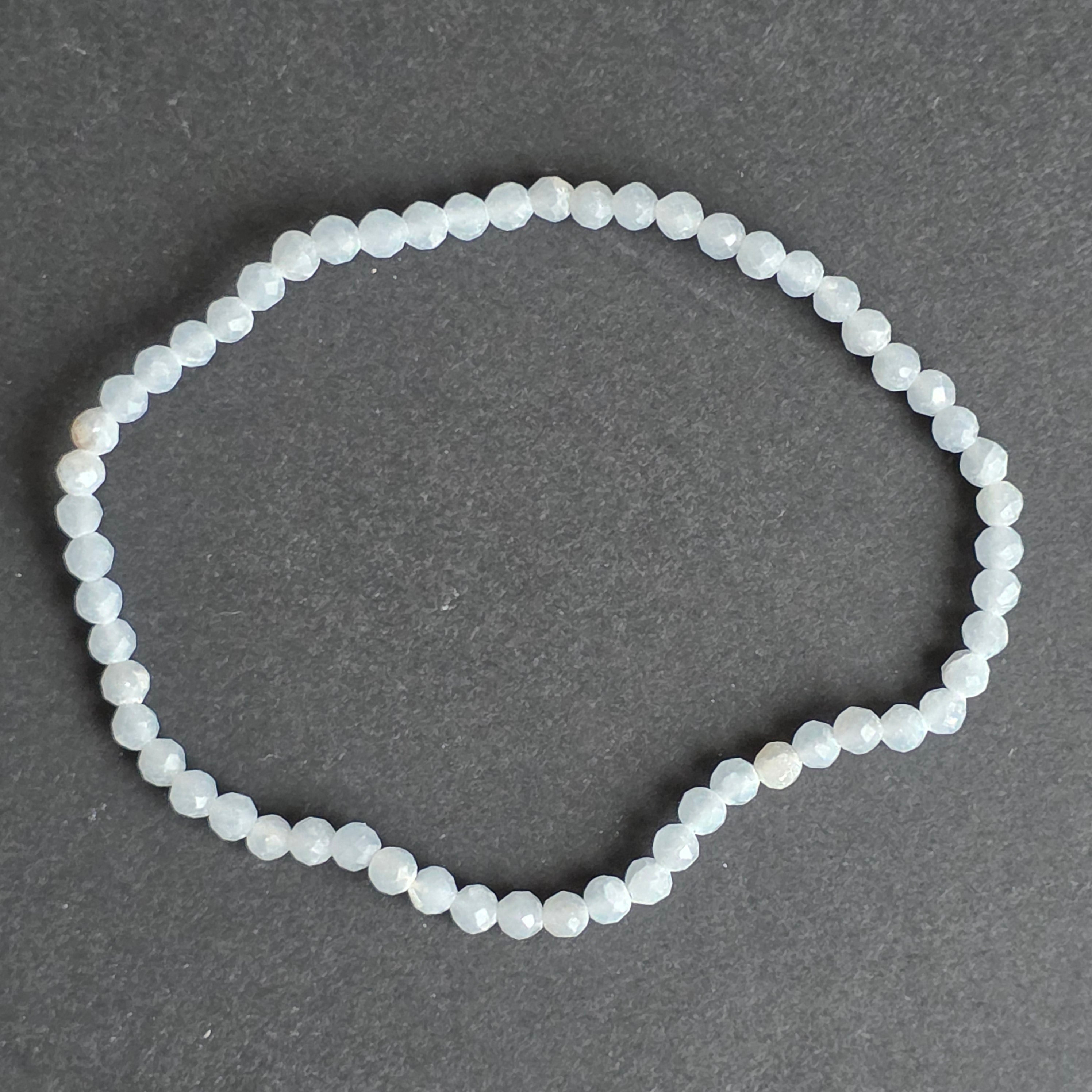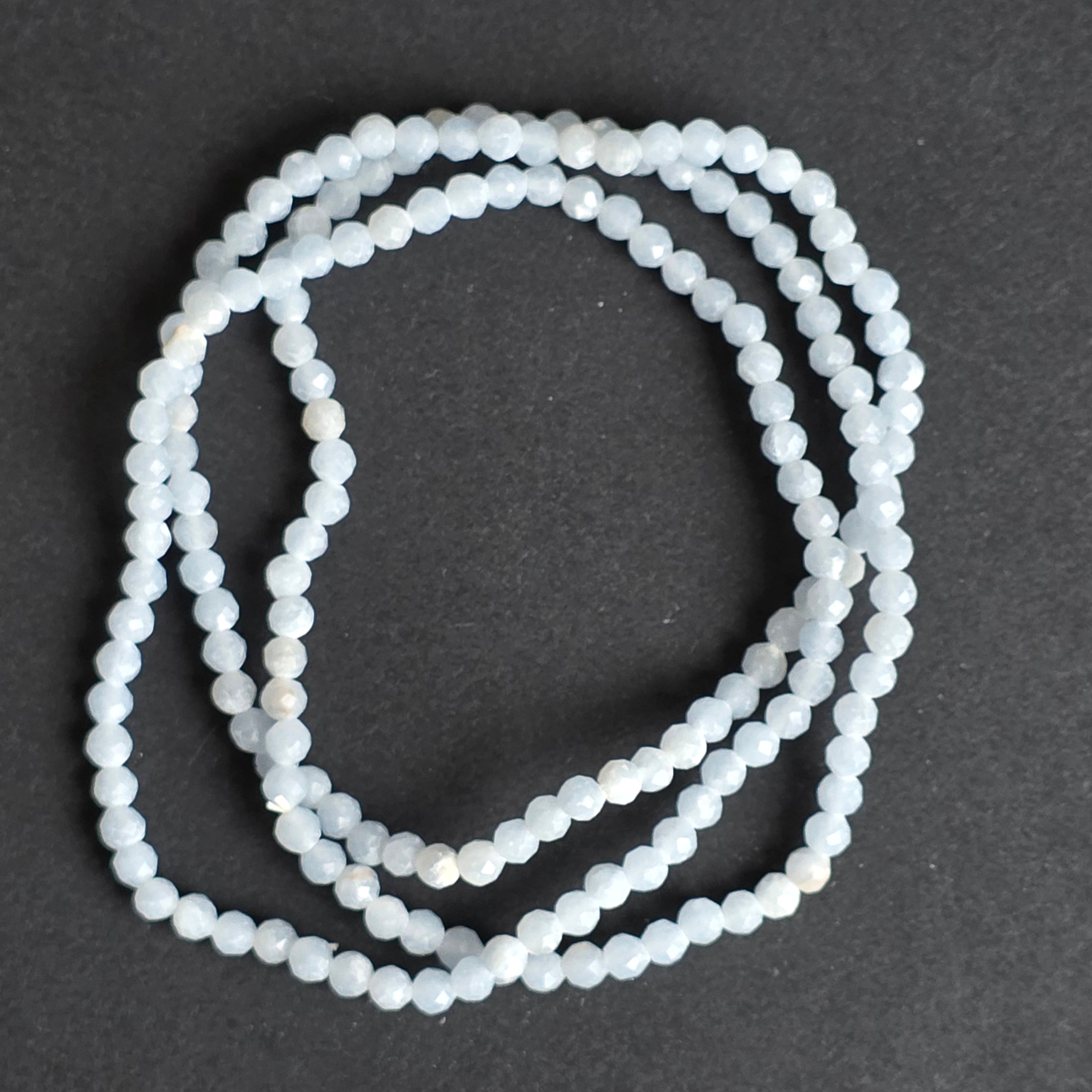 La angelita es una piedra con una suave vibración, como la luz que se filtra entre las nubes de la mañana. En esta delicada pulsera, las cuentas facetadas de 2 mm capturan suaves tonos de azul, otorgando a la pieza una sensación de calma, pureza y paz interior.