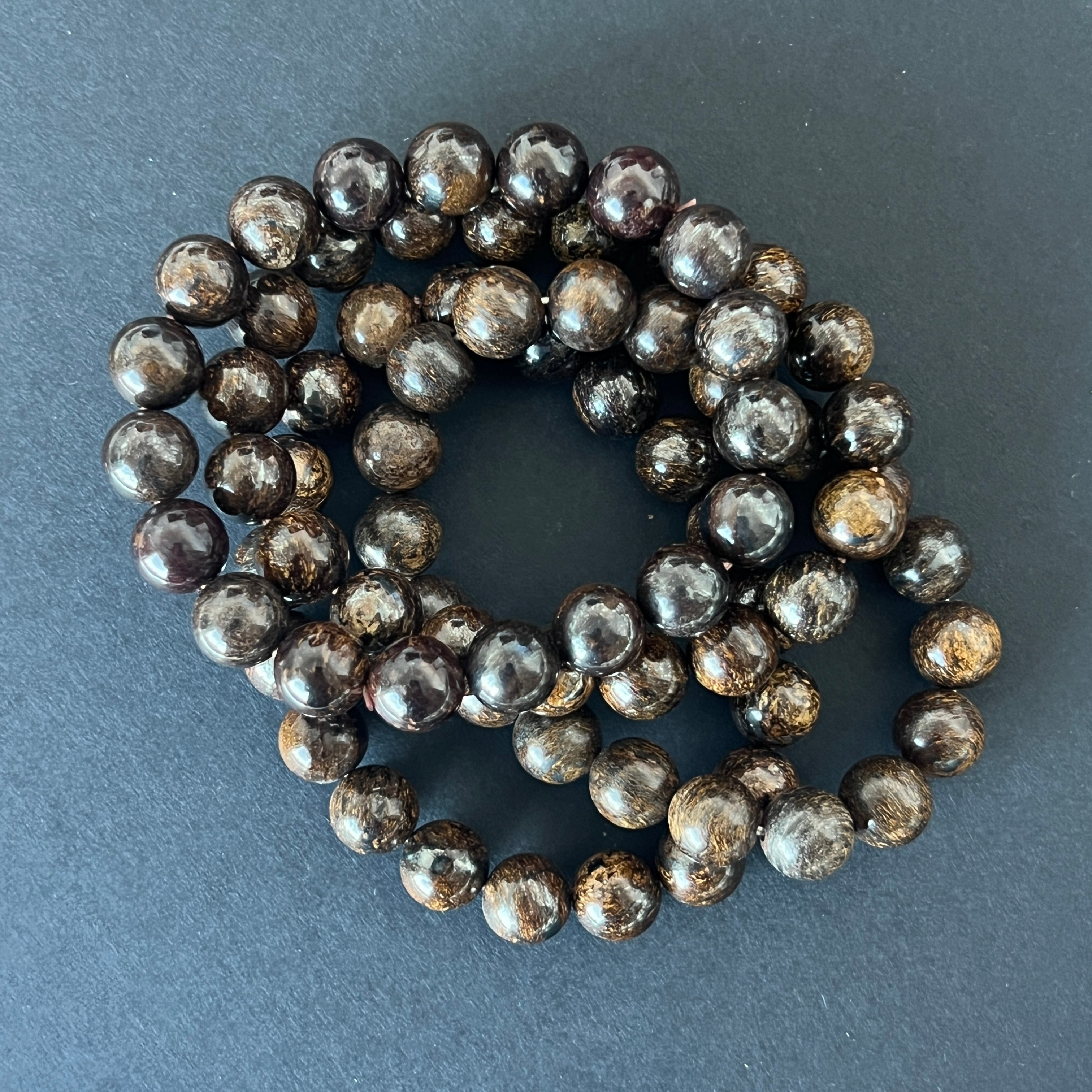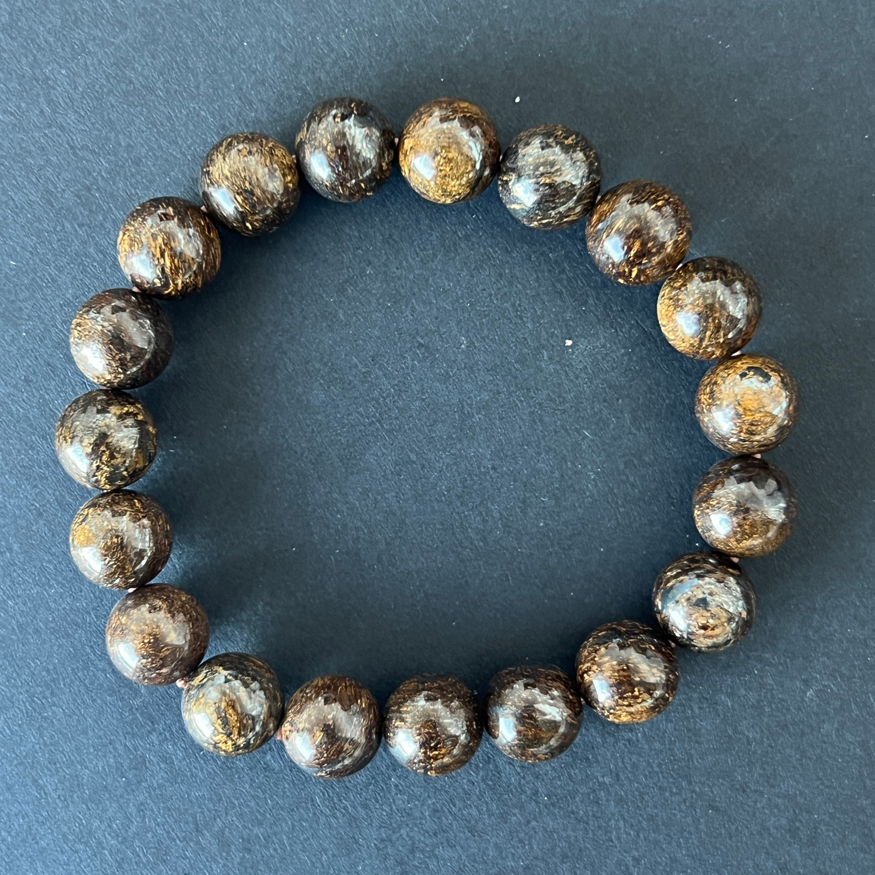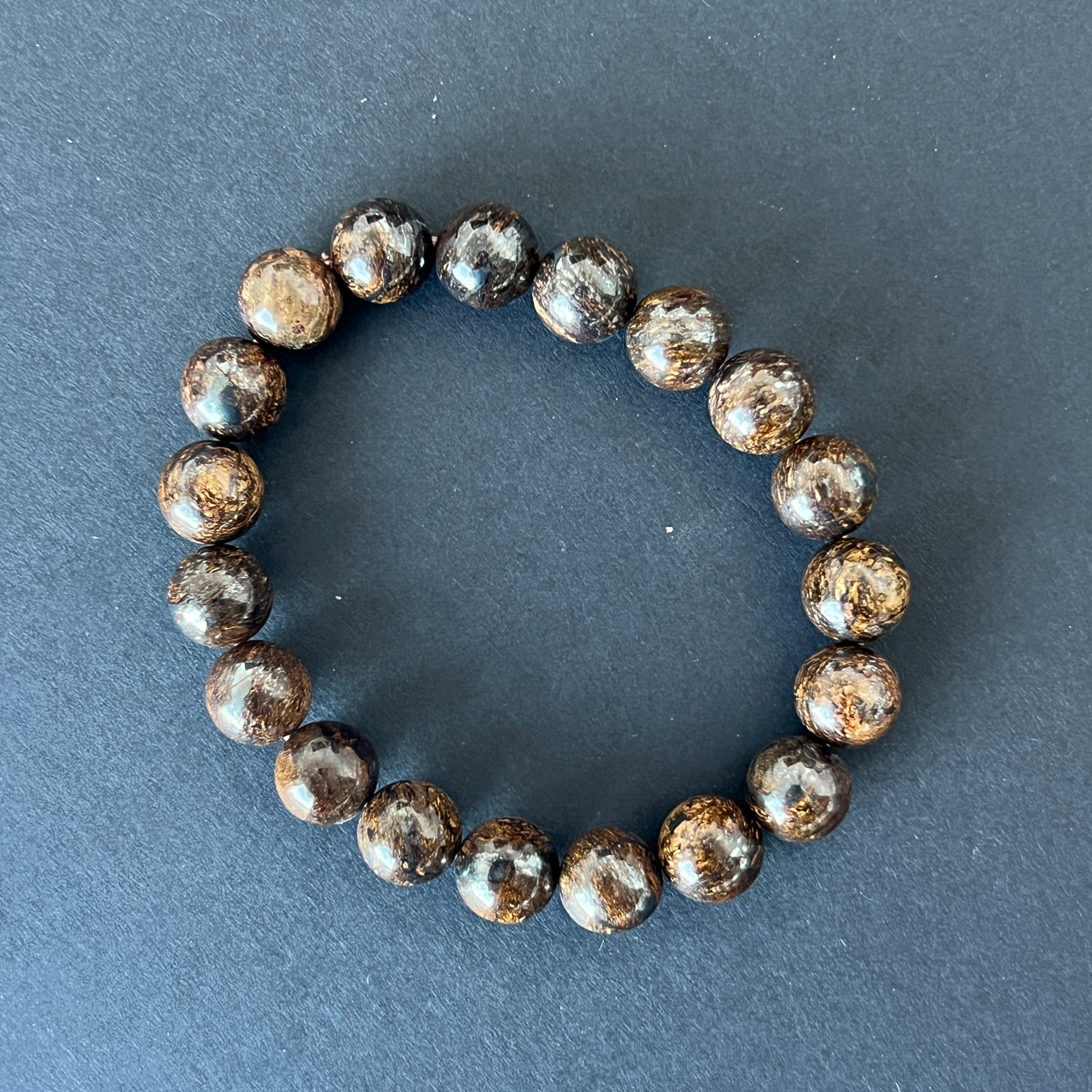 Esta pulsera de broncita, hecha de cuentas esféricas de 10 mm, se destaca por sus tonos cálidos de marrón oscuro y los reflejos metálicos que recuerdan al brillo del bronce. Los destellos dorados y las texturas naturales crean un juego visual elegante, convirtiendo la pulsera en un accesorio refinado y especial.