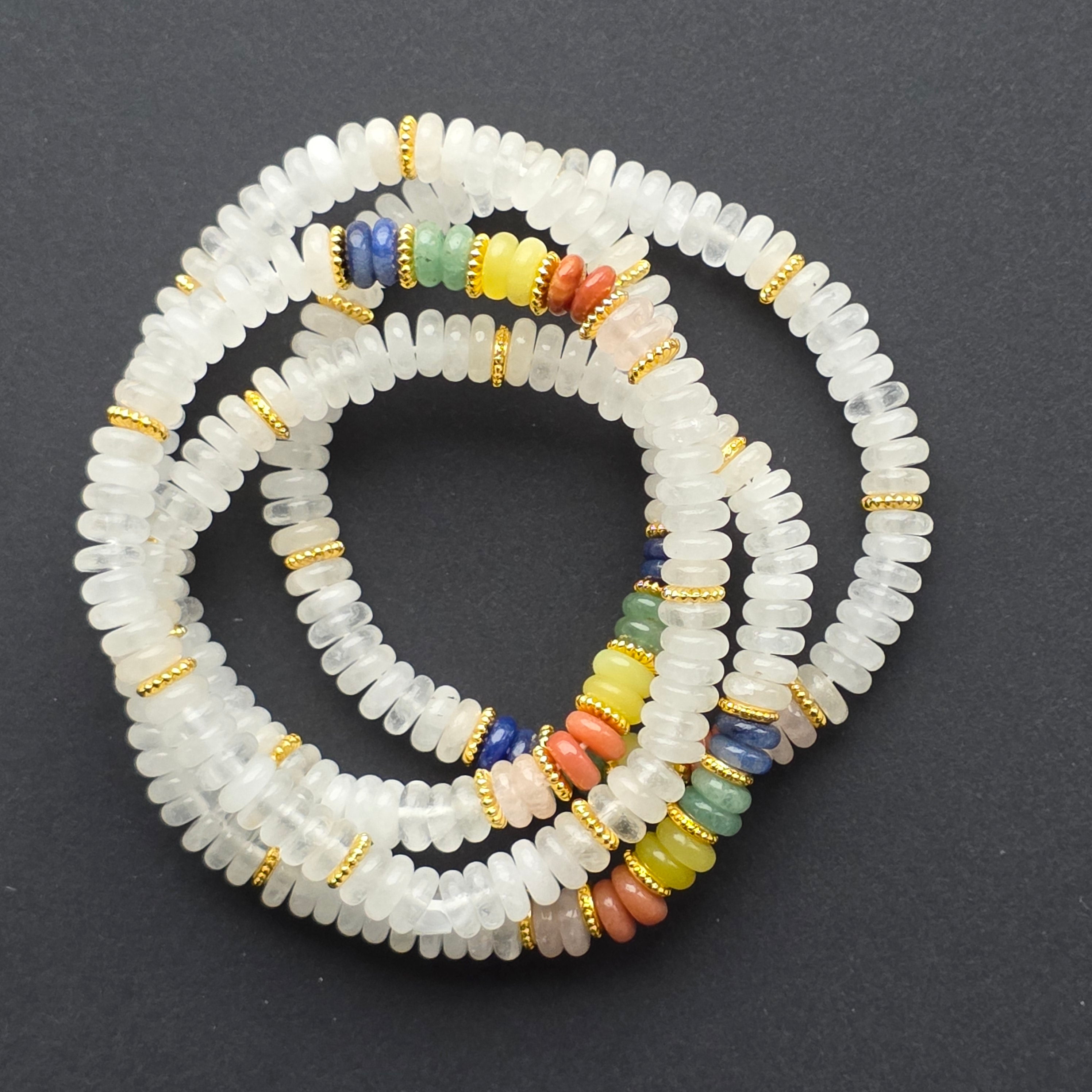 La pulsera de cuarzo blanco aporta a la muñeca una elegancia tranquila y limpia, con un blanco lechoso que parece irradiar una luz interior. Los discos cuidadosamente pulidos crean una textura fina y delicada, perfecta tanto para llevar sola como combinada con otras pulseras.