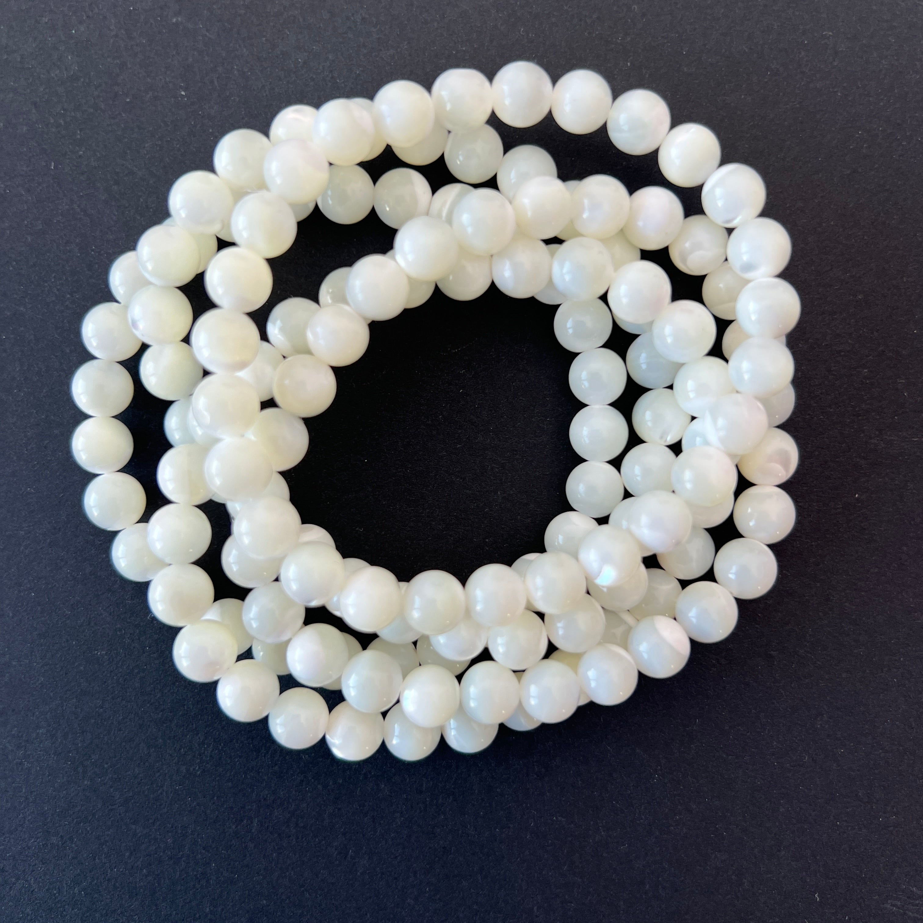 Esta pulsera de nácar, compuesta por cuentas esféricas de 6-7 mm, fascina por su delicado brillo y los reflejos perlados que evocan la belleza del mar. Cada pieza es única, con sutiles variaciones de tonos e iridiscencias.
