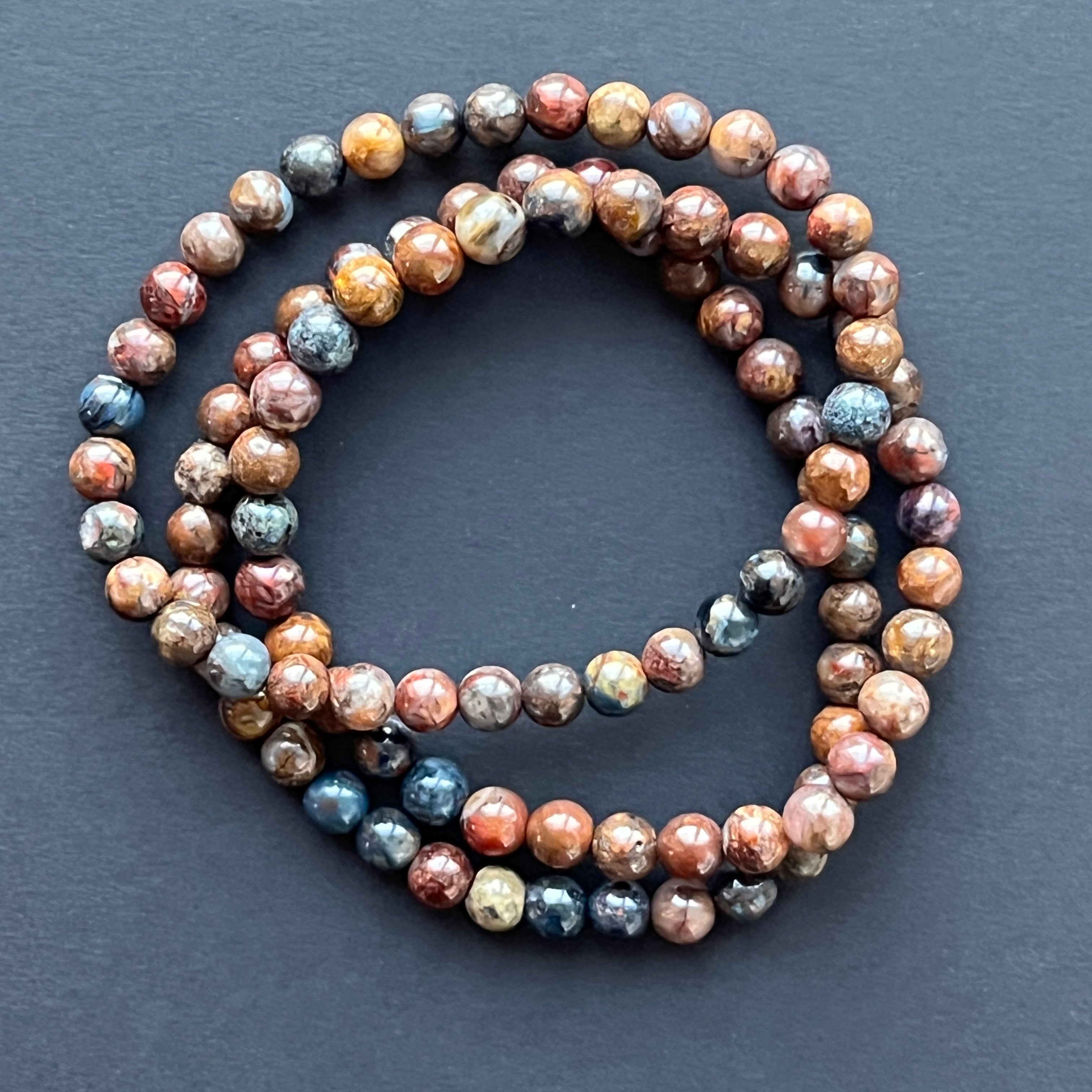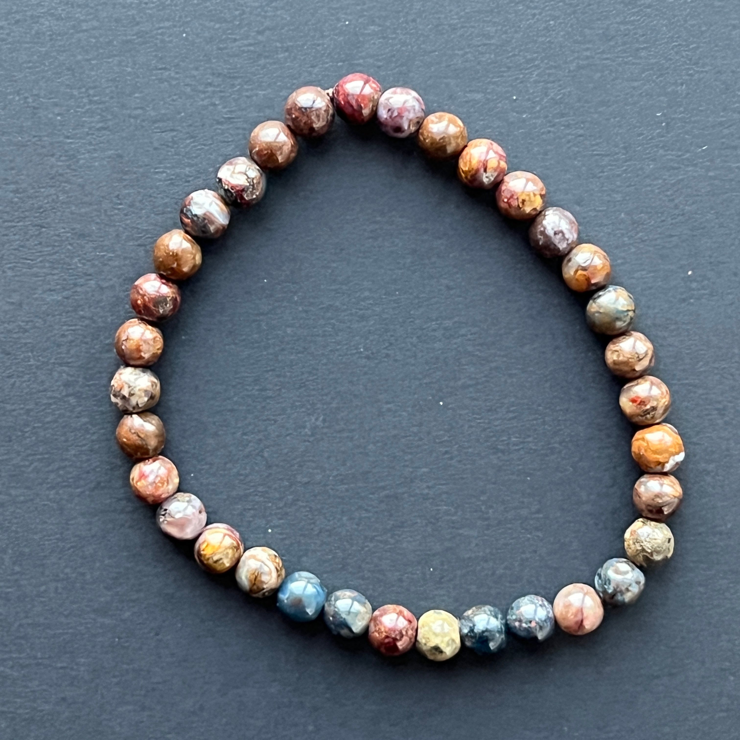 Esta pulsera de pietersita, hecha con cuentas esféricas de 6–7 mm, es una pieza verdaderamente rara, apreciada por su belleza única. Sus reflejos iridiscentes, que parecen capturar el movimiento de tormentas celestiales, hacen de cada pulsera una pequeña obra de arte natural.