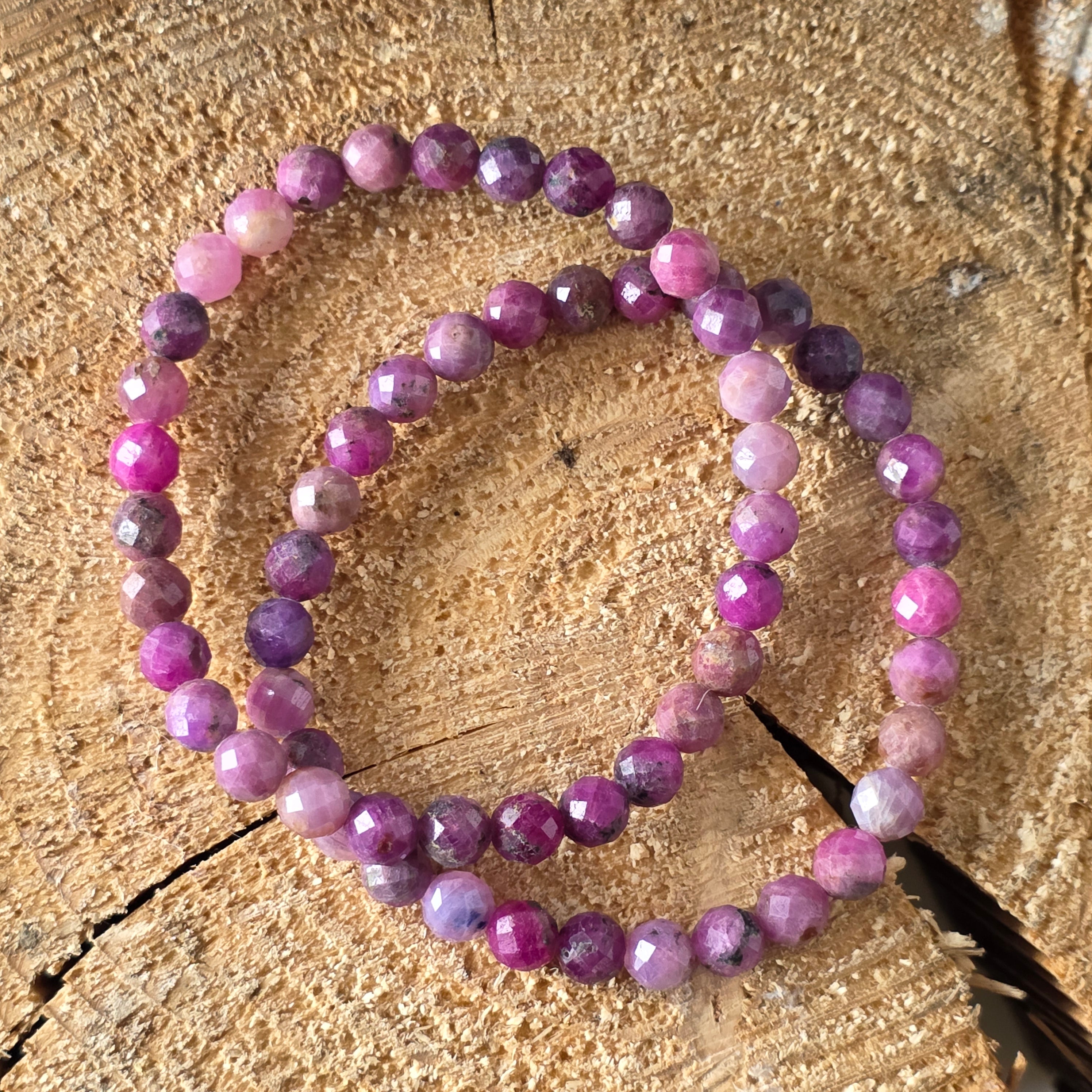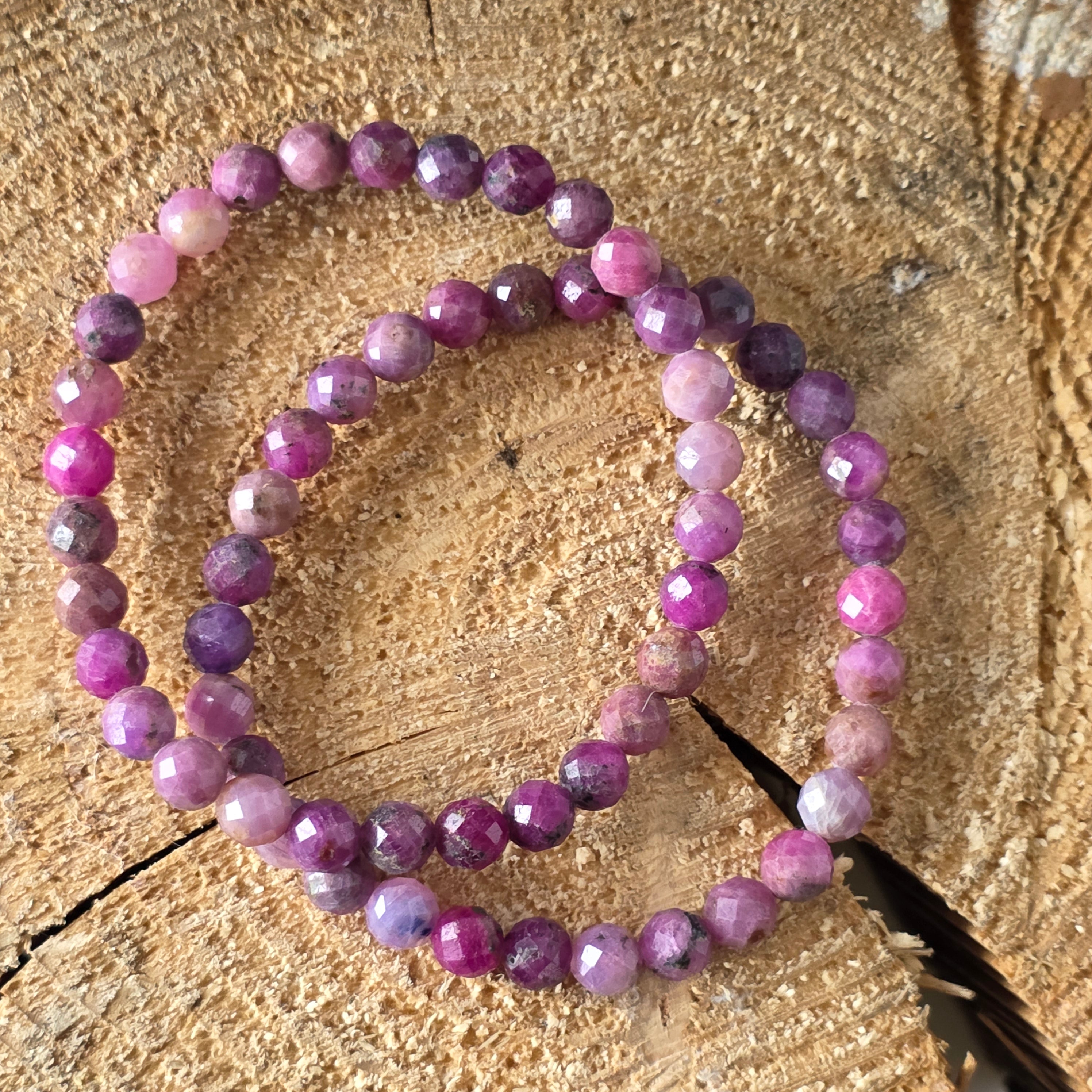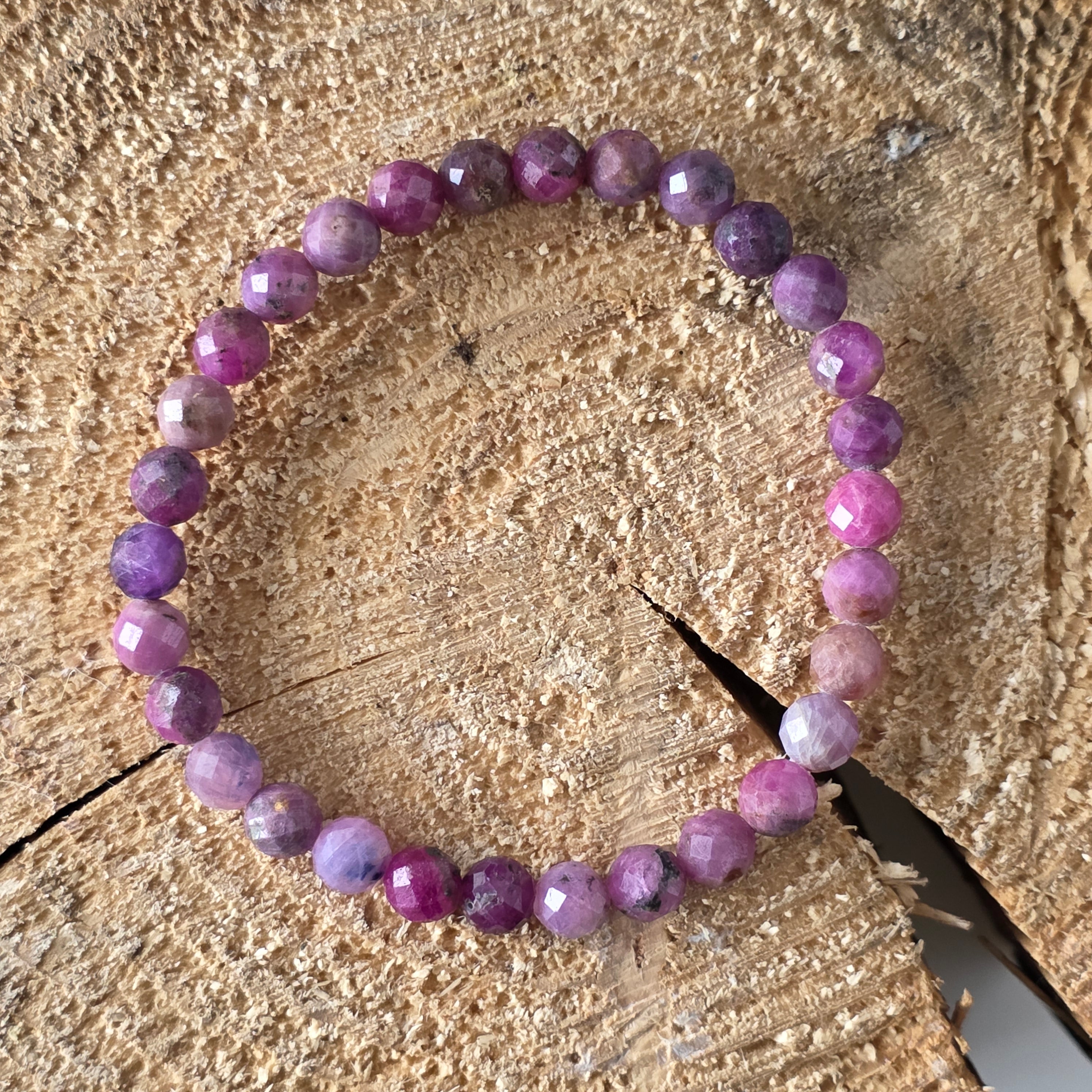 Una pulsera que lleva en sí la llama viva de la vida. Las cuentas facetas de rubí natural, con un diámetro de 6 mm, brillan en tonos ricos de rojo intenso, a veces con acentos púrpuras o reflejos profundos de cereza. Cada piedra parece palpitar con una energía cálida y vital, semejante a un corazón que late al ritmo de su propio llamado.