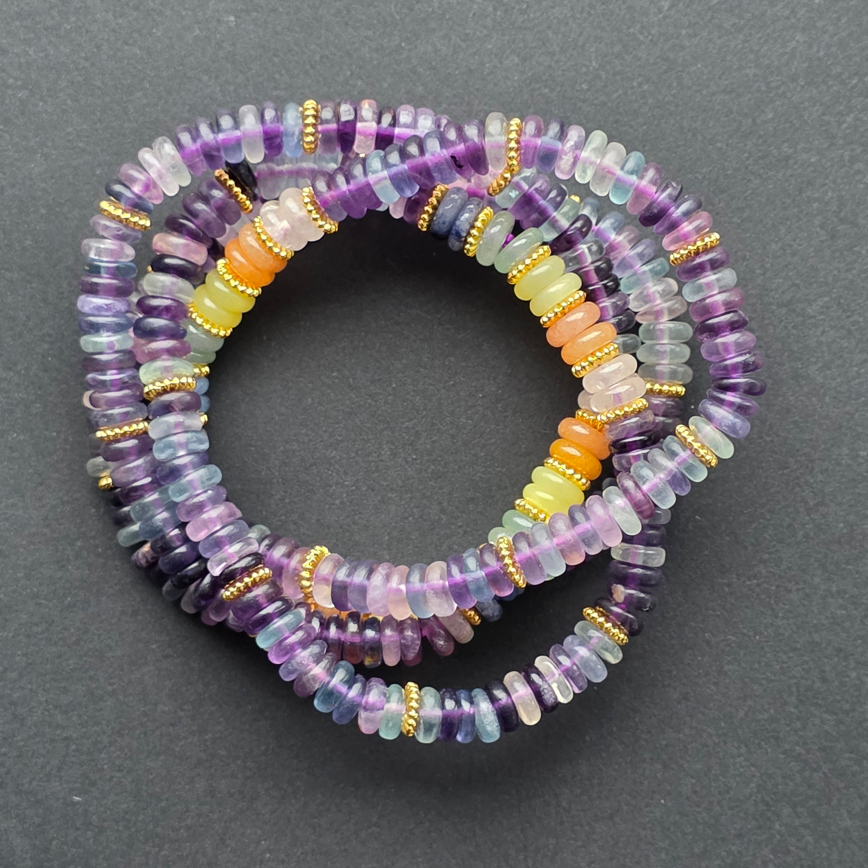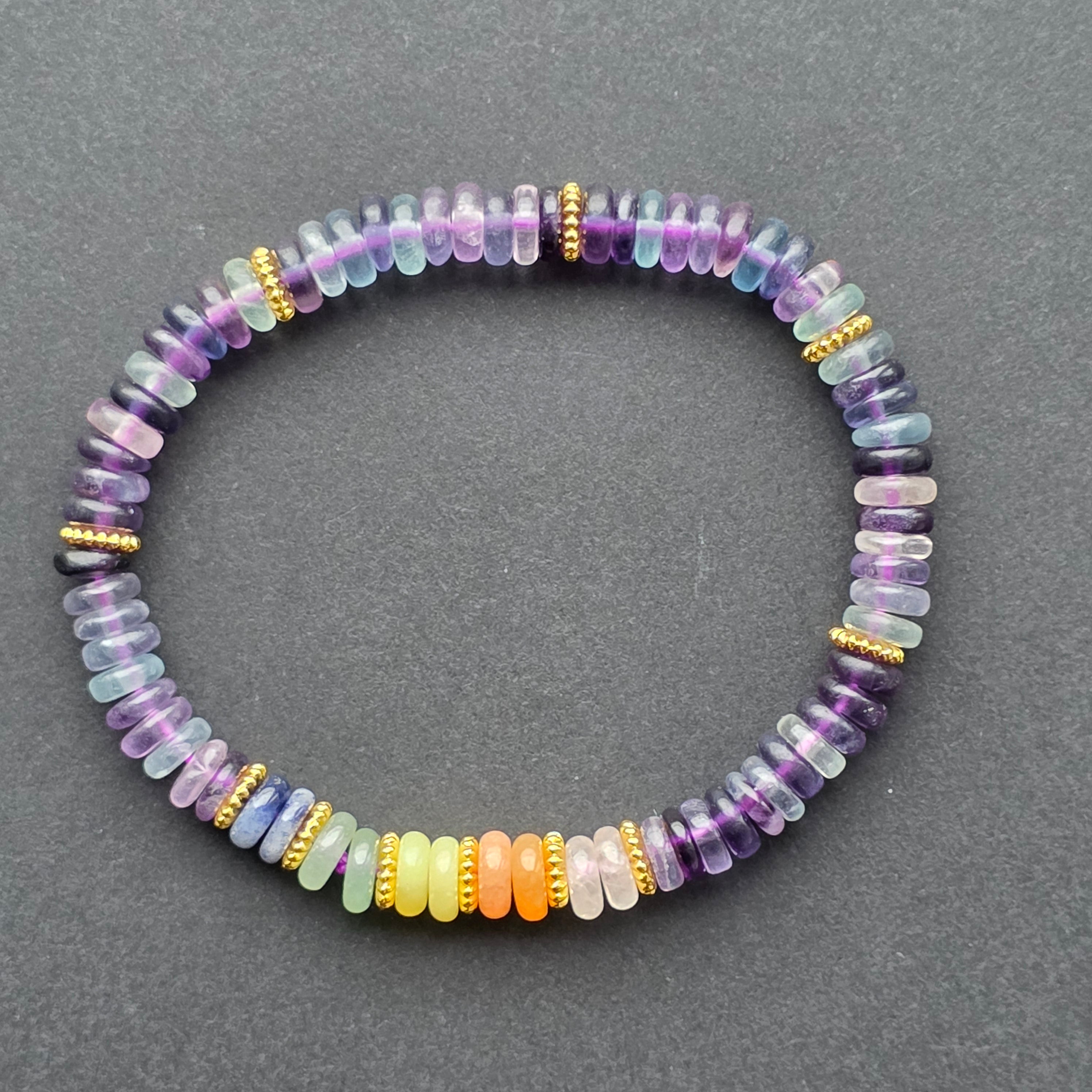La pulsera realizada con fluorita morada destaca por su transparencia ligeramente misteriosa, con matices que oscilan entre lila, violeta profundo y tonos fríos de amatista. Los discos finos forman una estructura elegante y delicada, que aporta a la muñeca una estética calmada y equilibrada.