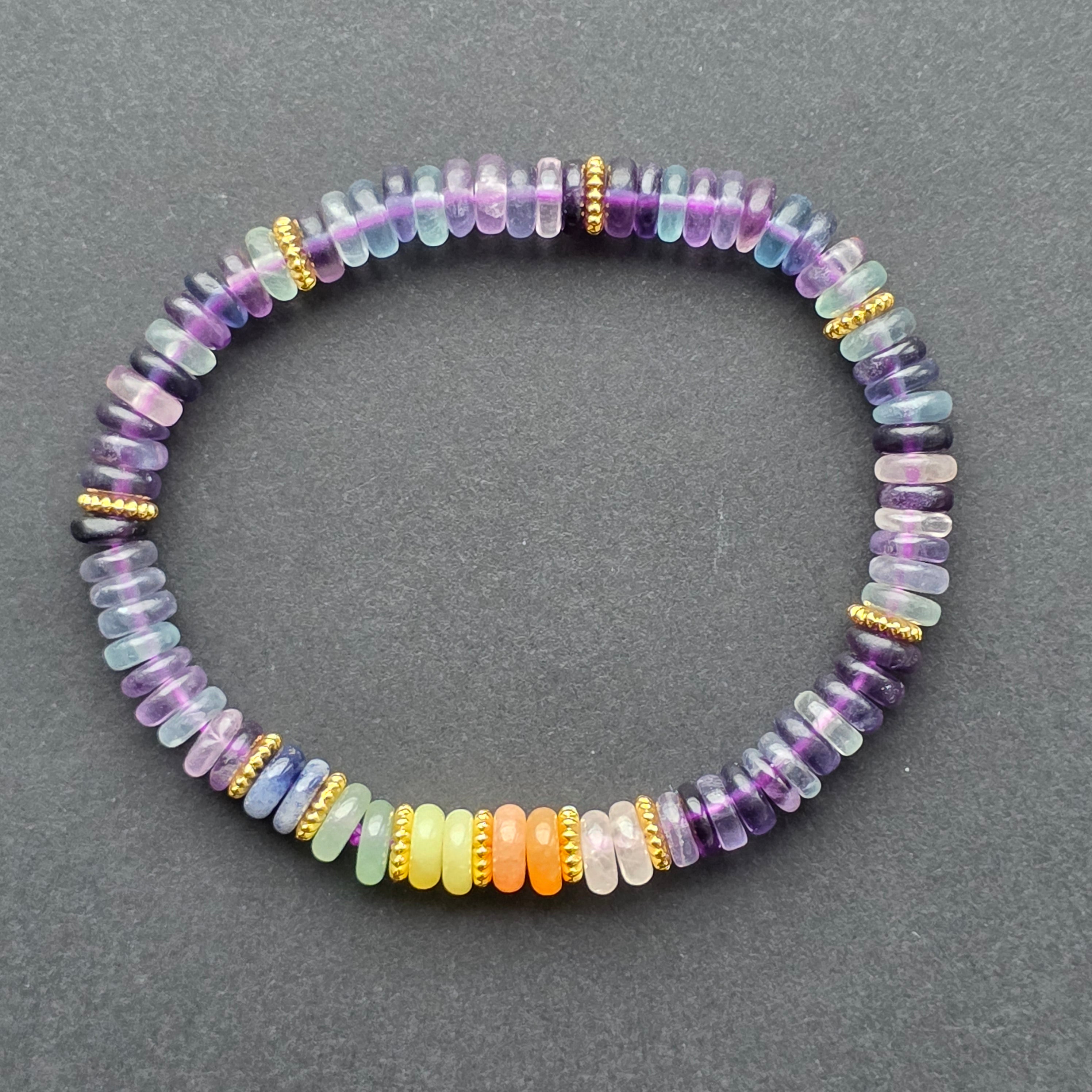 En la zona central se encuentra un segmento dedicado a los 7 chakras, creado con piedras multicolores que añaden un acento vibrante y simbólico. Este contraste entre el morado etéreo de la fluorita y los colores cálidos de los chakras crea una pulsera que irradia armonía, expresividad y sensibilidad visual.