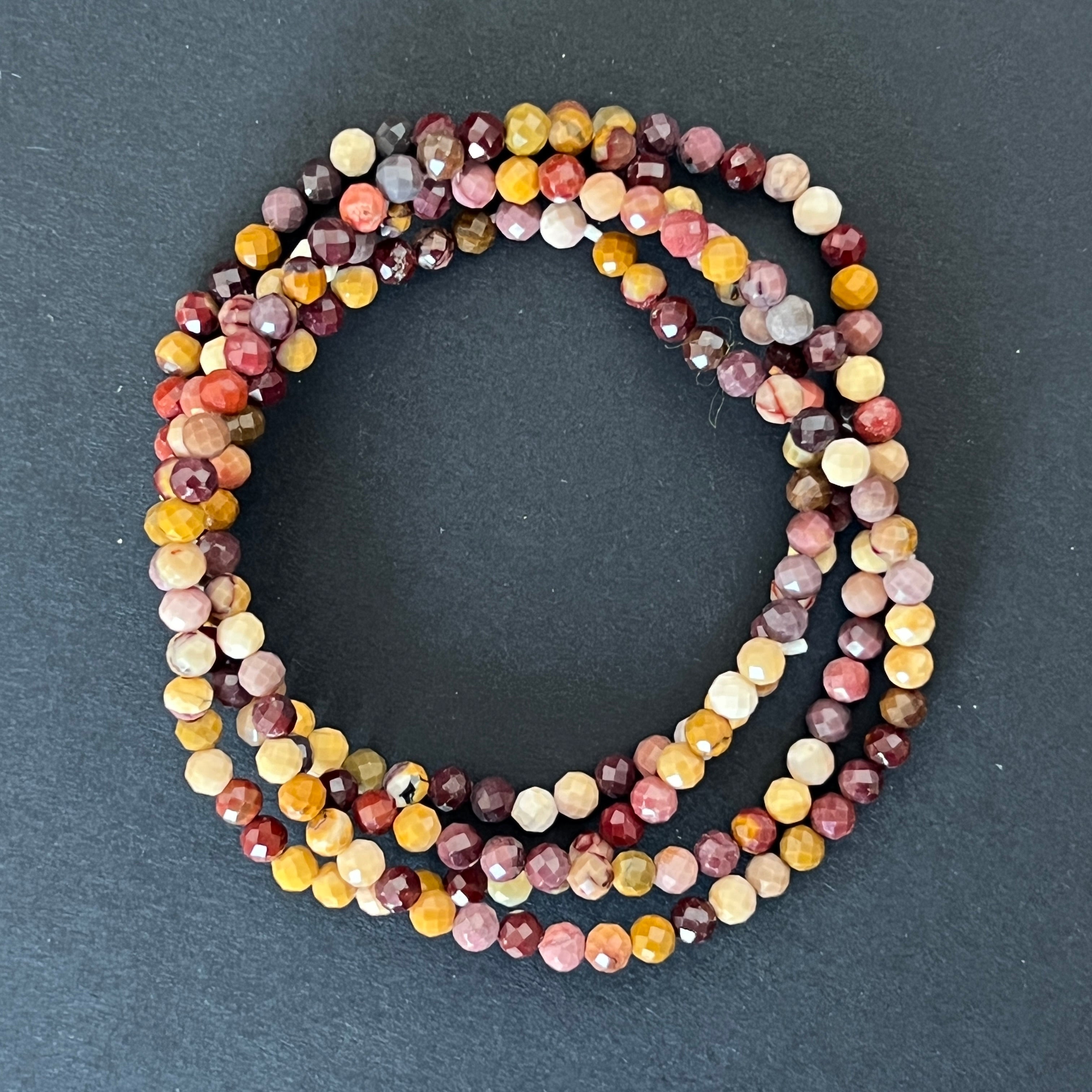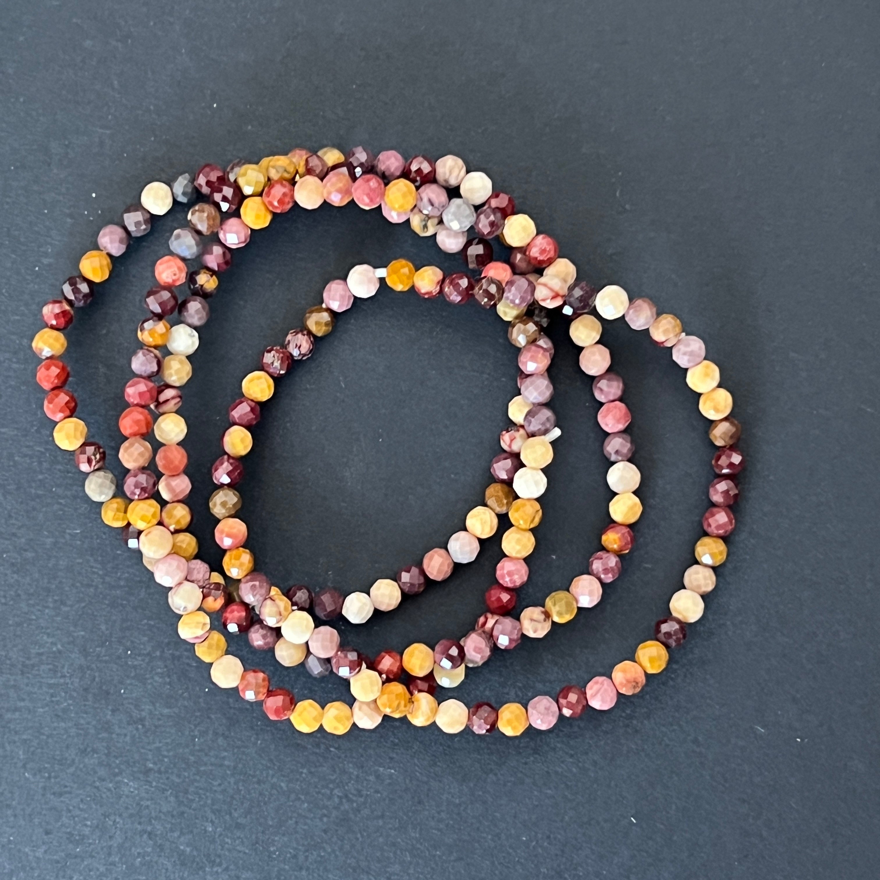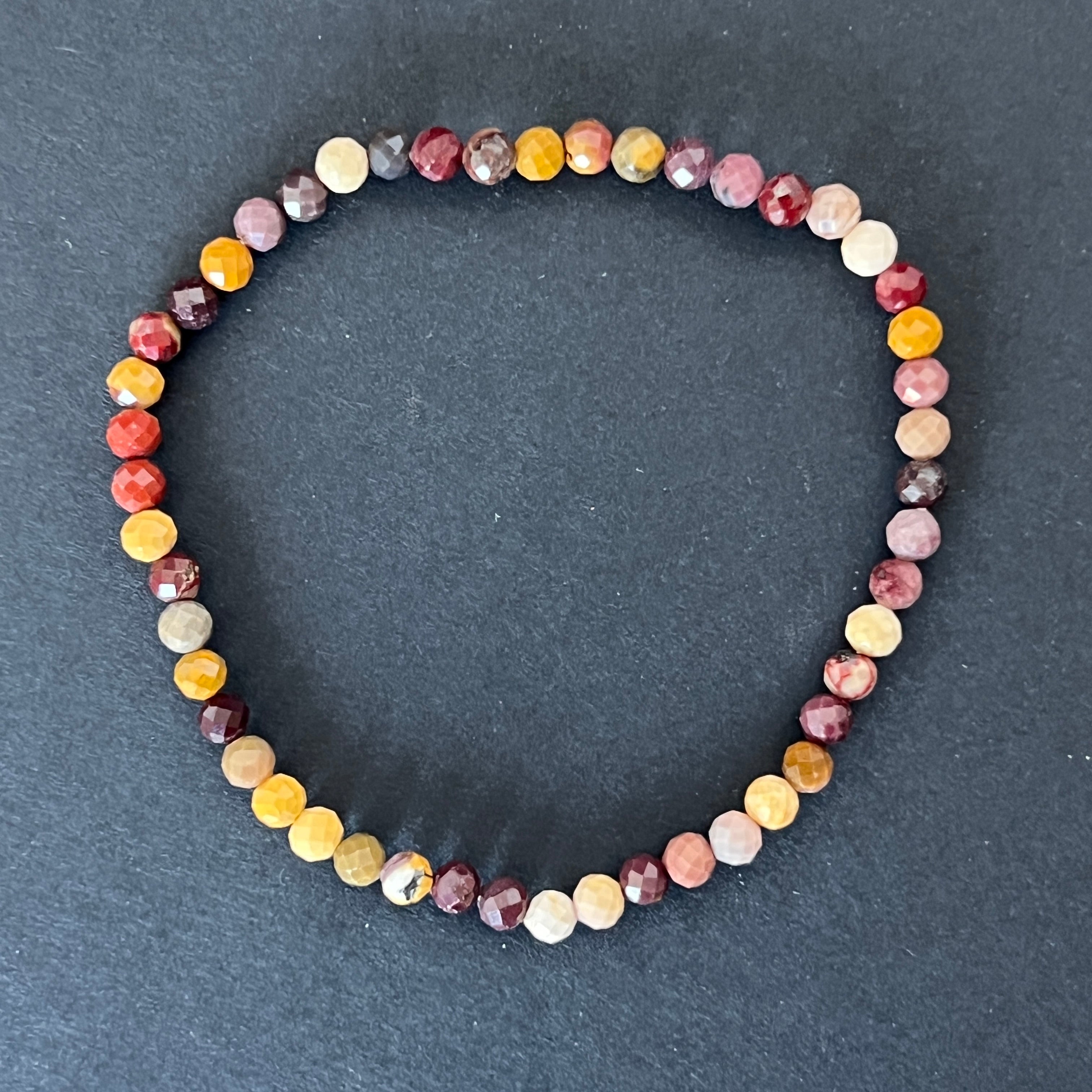 Esta pulsera facetada de mookaíta, compuesta por cuentas de 4 mm, es una joya delicada, pero llena de color y vitalidad. Los reflejos facetados realzan la belleza natural de la mookaíta, una piedra australiana reconocida por su variada paleta de tonos tierra y solares.