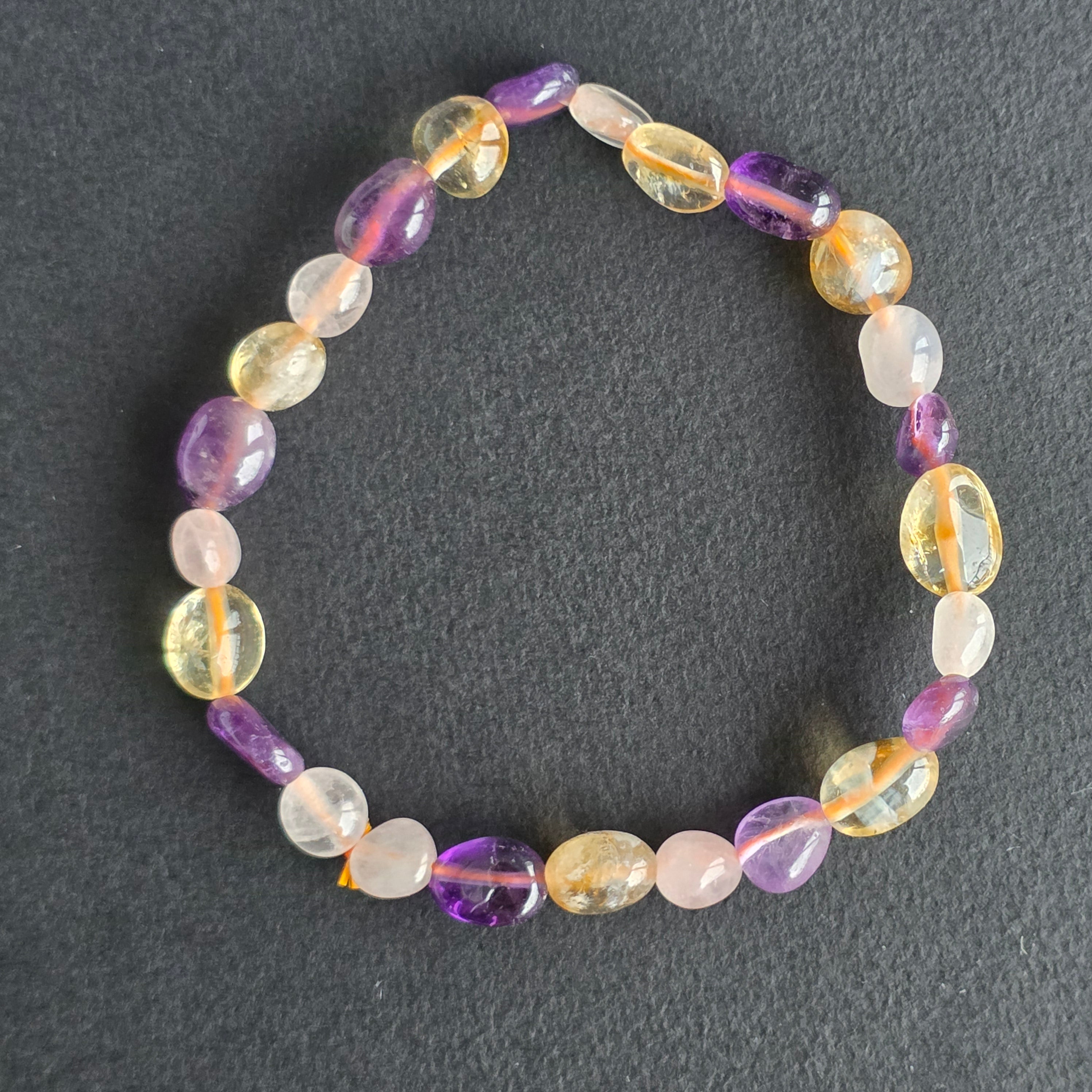 Pulsera Triple Armonía con cuarzo rosa, amatista, citrino pulido
