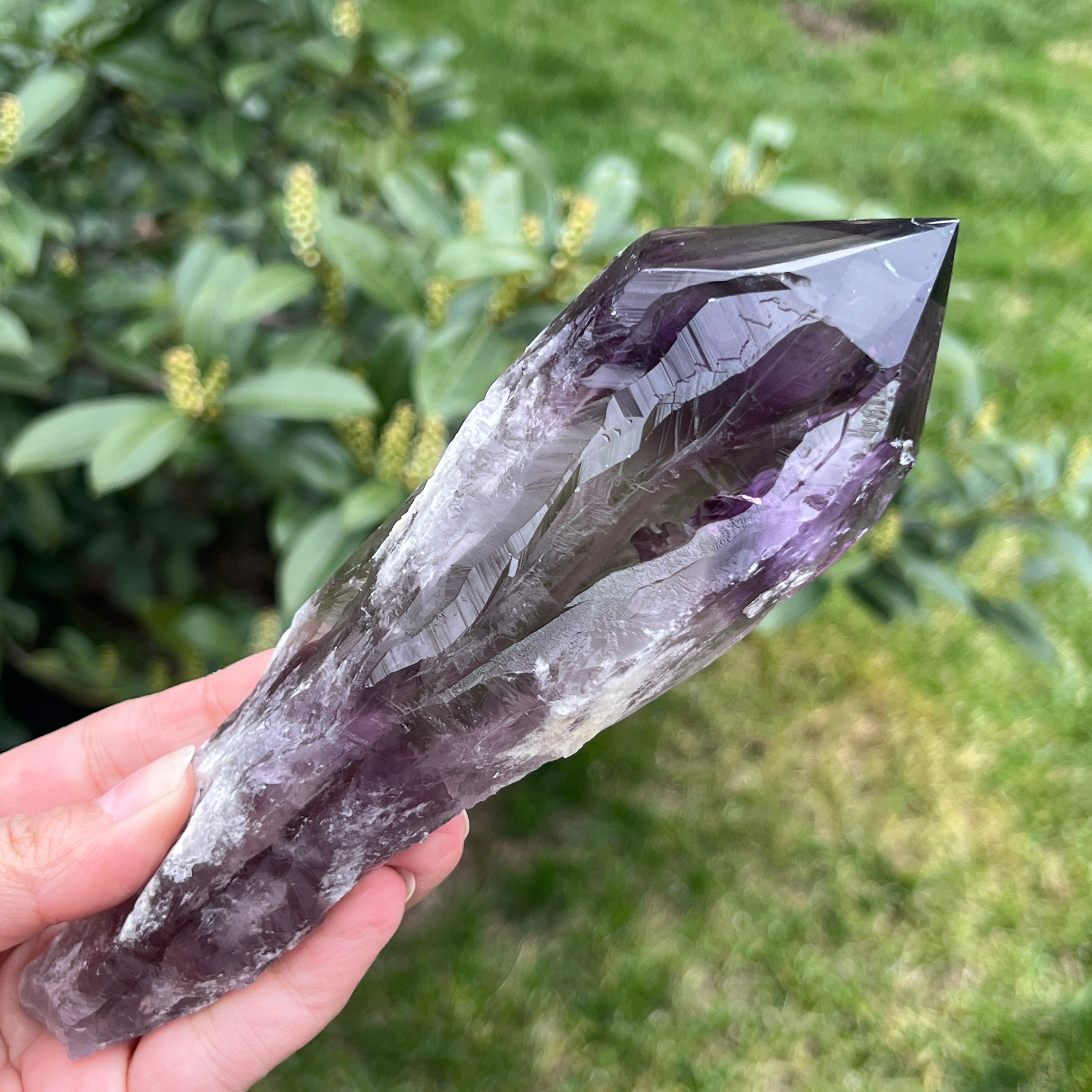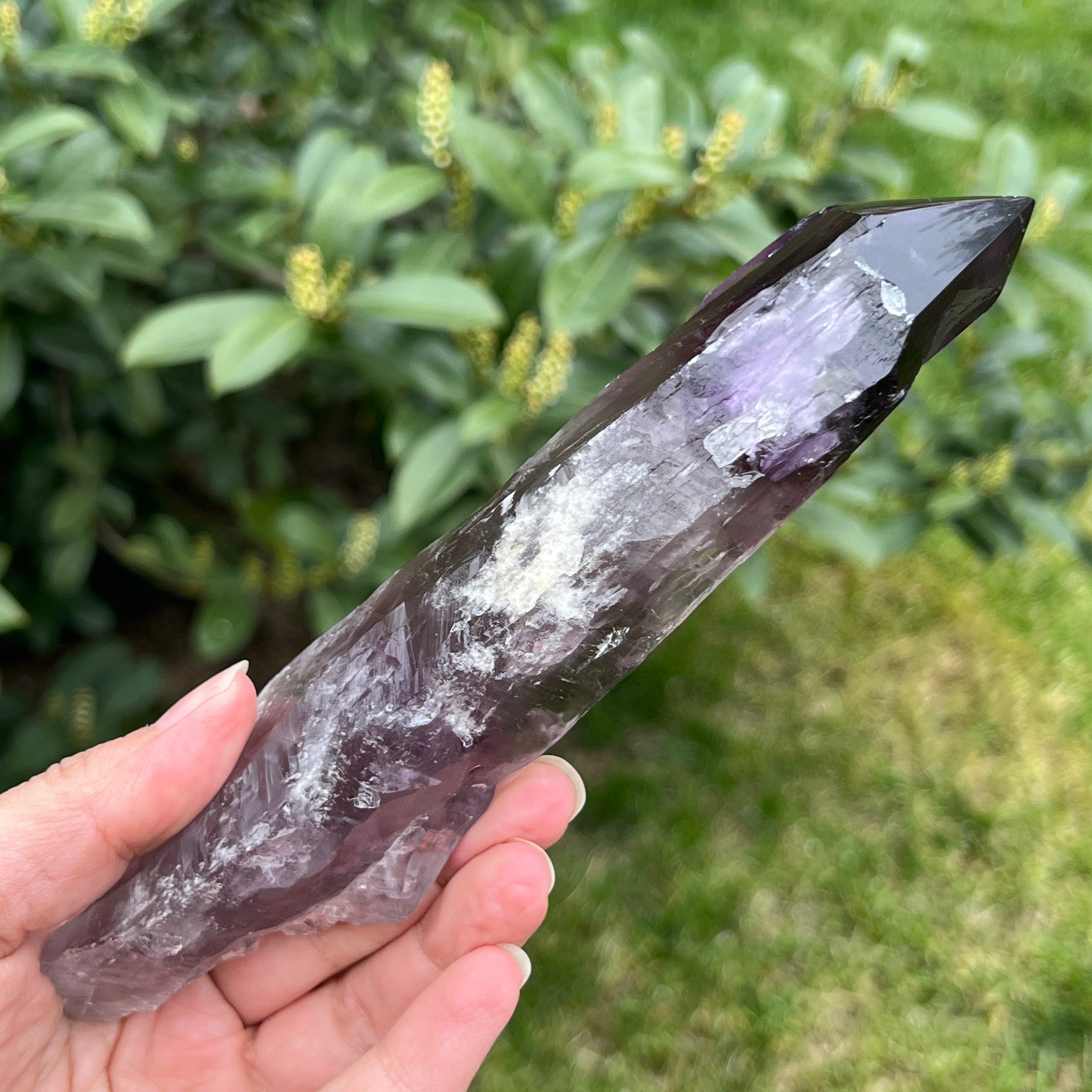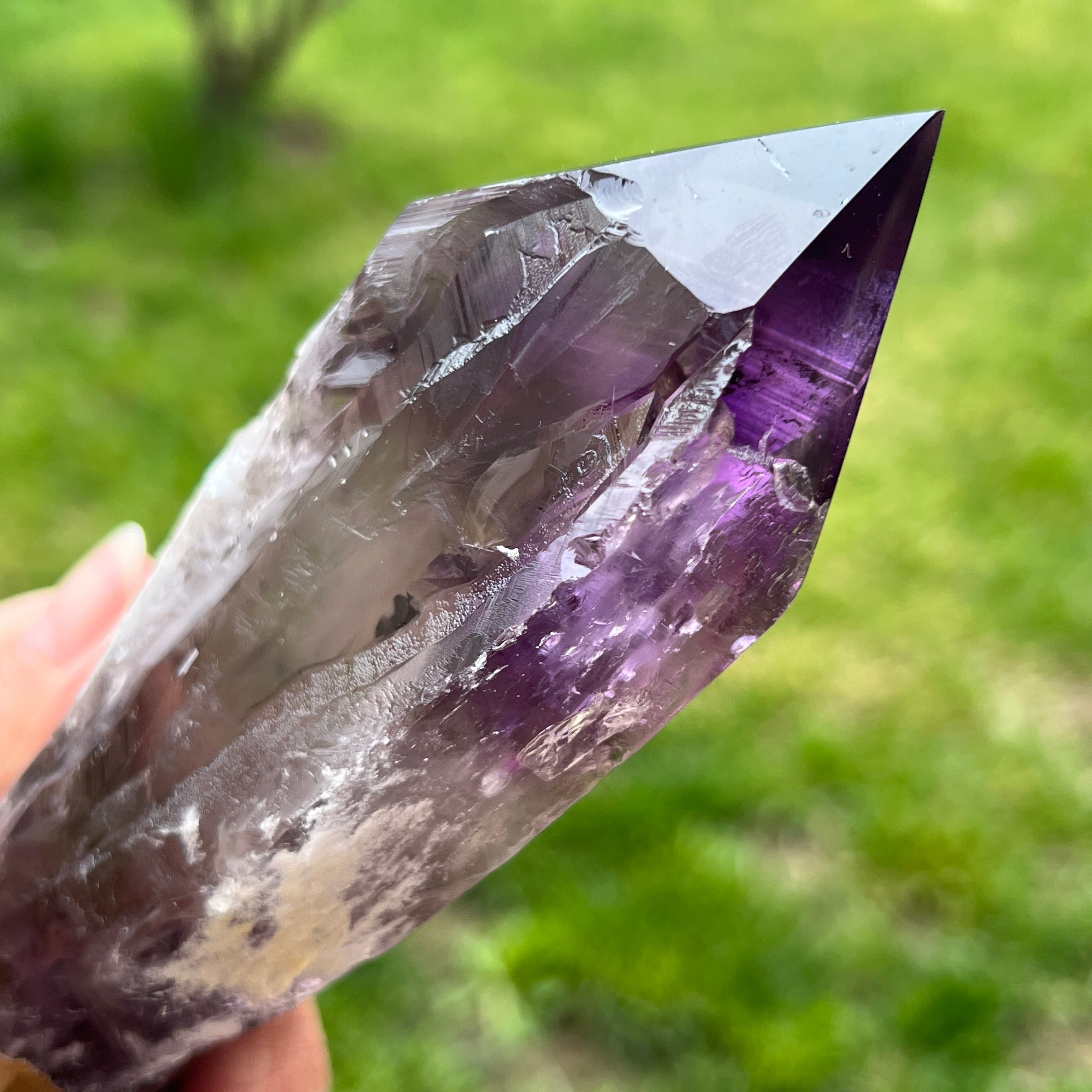 La amatista Bahia, a veces también llamada "Rincón del Dragón", se extrae de la región de Bahia, Brasil. Cada cristal es un espécimen natural único, con una forma cristalina bien definida y presenta muescas o protuberancias a lo largo de toda su longitud. Estos cristales no se desprenden de un grupo más grande, sino que se forman individualmente, uno por uno.
