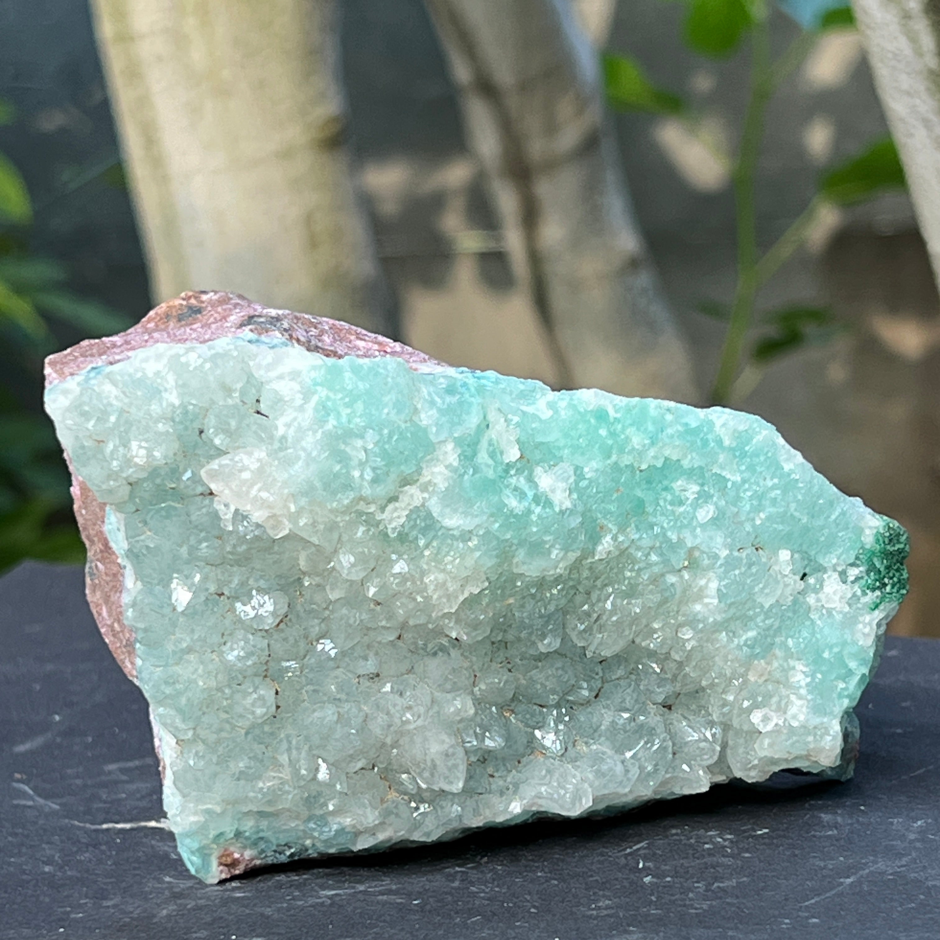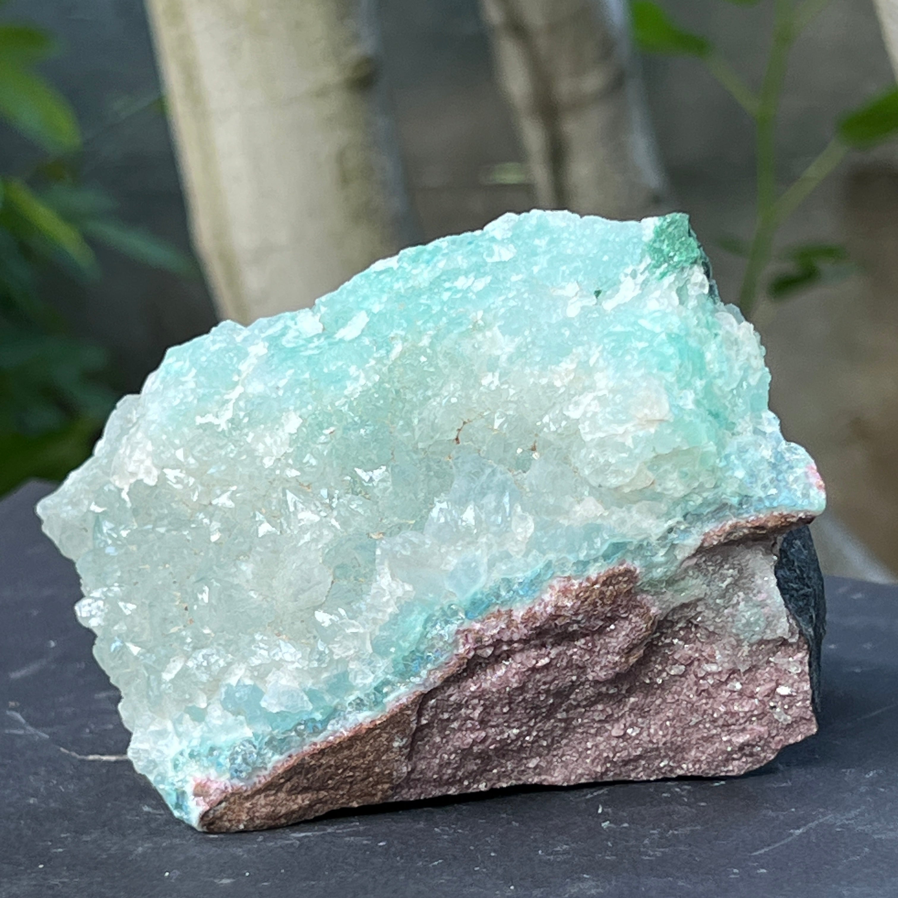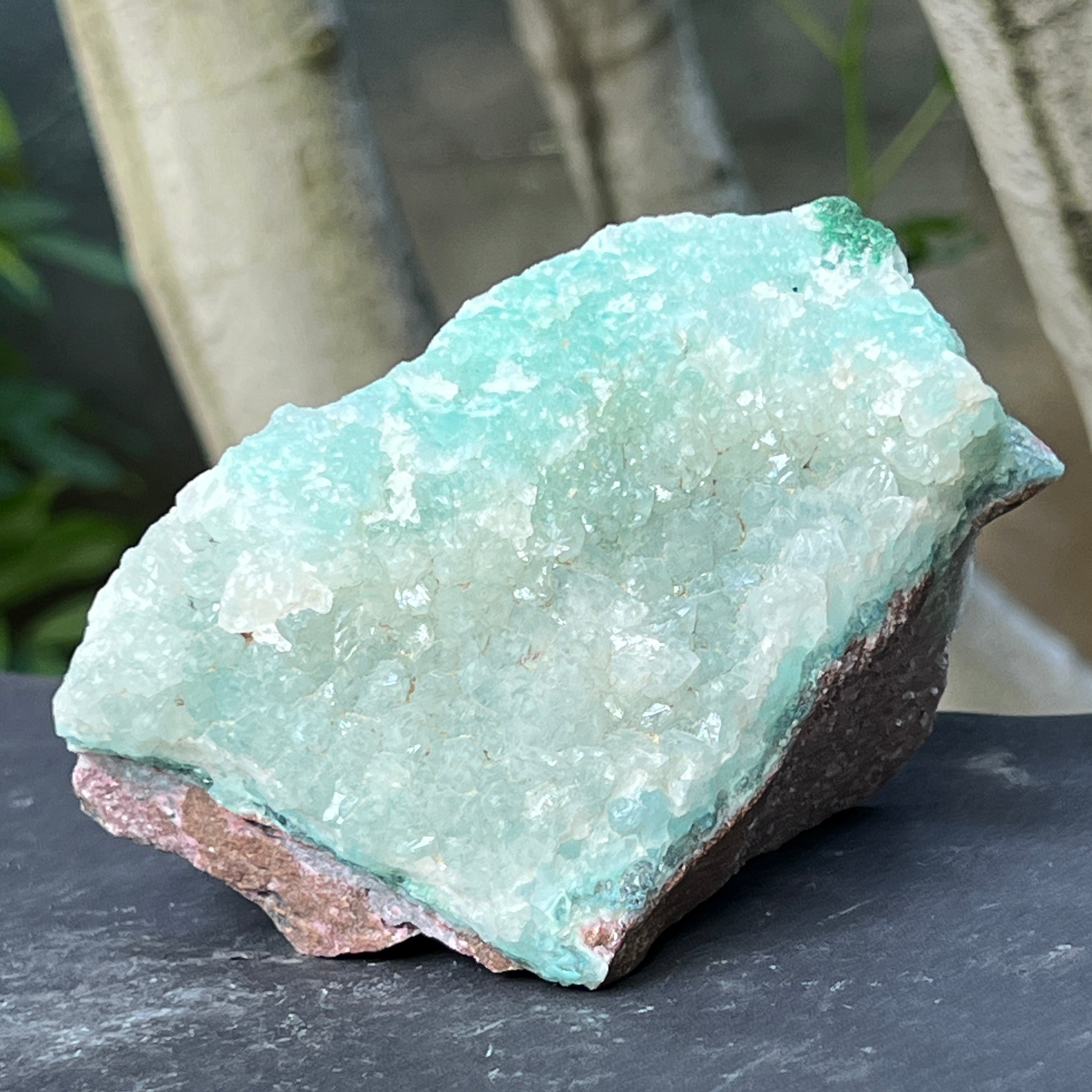 Es una forma natural, no alterada, de una calcedonia cromada, un mineral difícil de encontrar, extraído exclusivamente de Zimbabue y apreciado por su color vivo, que no proviene del níquel (como en la crisoprasa), sino del cromo que late profundamente en su estructura cristalina. En esta versión especial, las inserciones de azul y verde crean un fascinante juego cromático, con transiciones suaves entre lo translúcido y lo opaco, entre lo denso y lo etéreo.