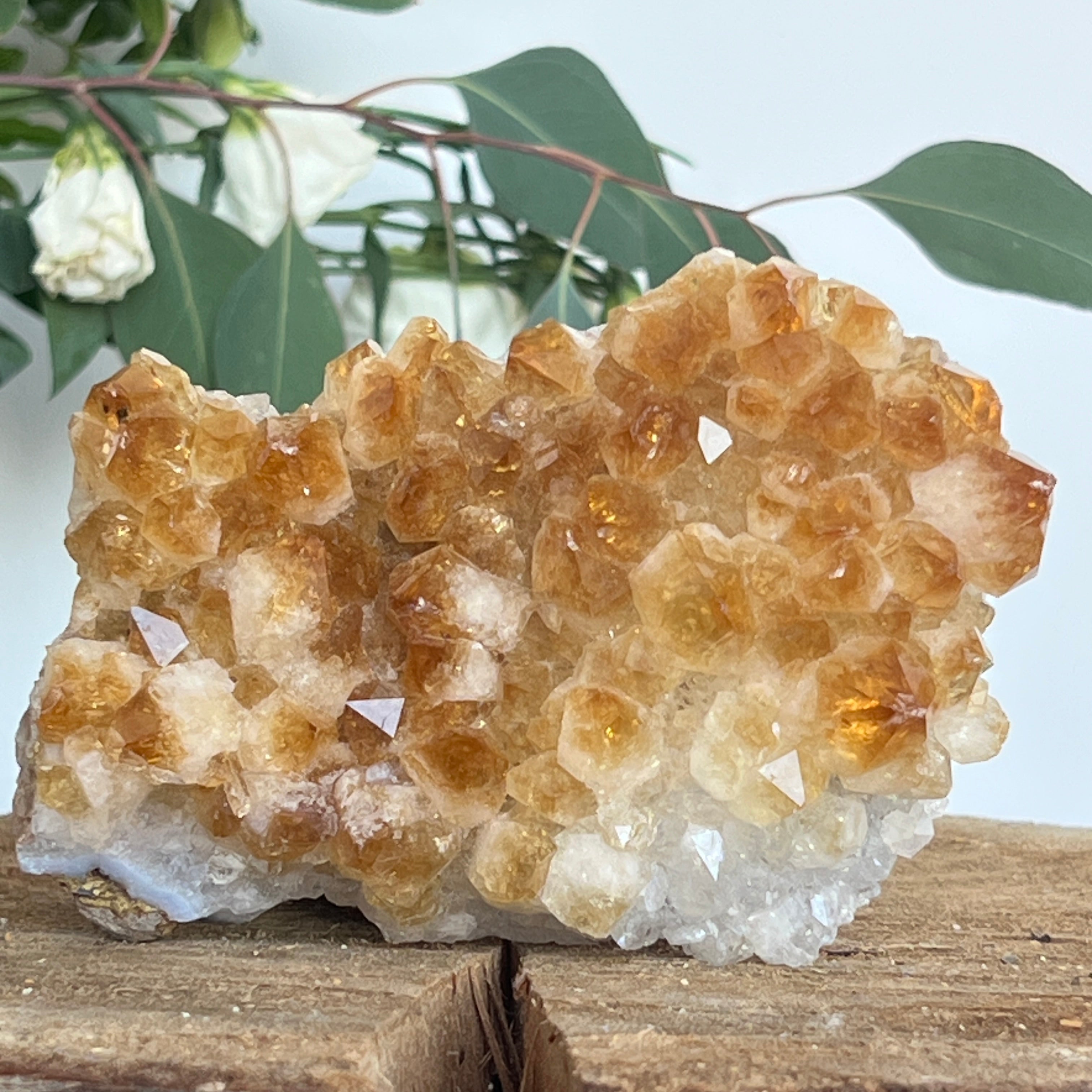 En cristaloterapia,el citrino se considera la piedra de la abundancia y del optimismo. Incluso en forma tratada térmicamente, su vibración luminosa se percibe como un apoyo para la claridad mental, la alegría y la manifestación de las intenciones. Un racimo de este tamaño e intensidad se convierte en un verdadero punto de luz en un espacio, atrayendo armonía y prosperidad.