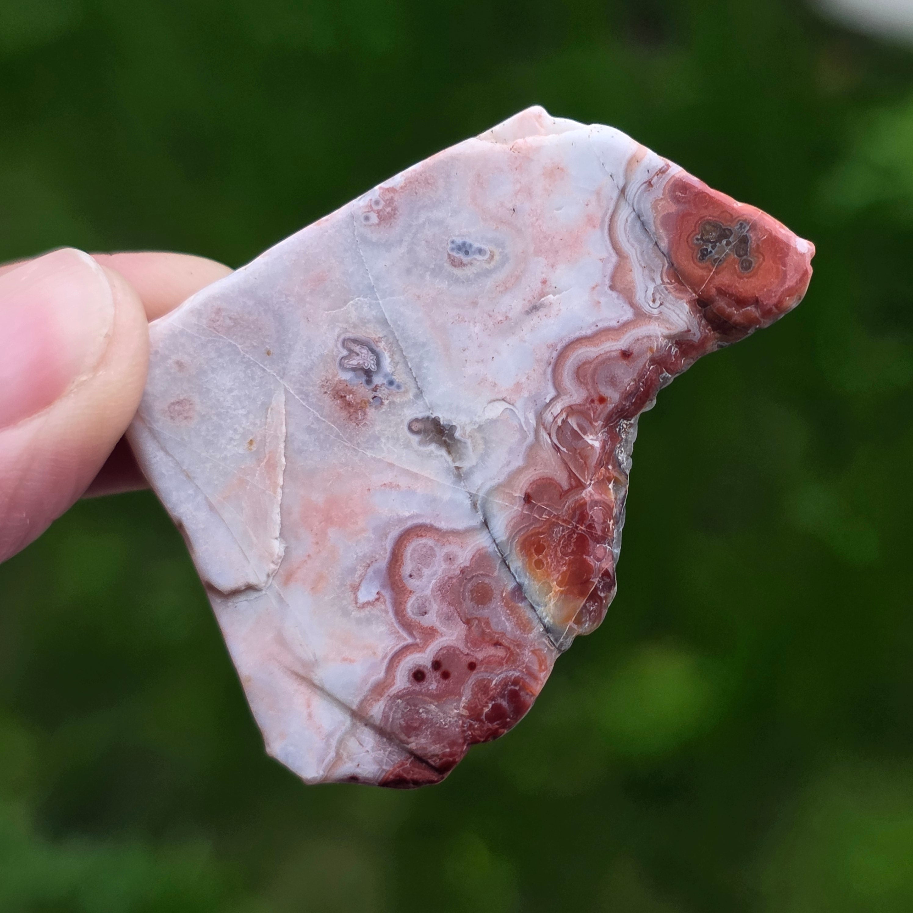 El ágata Crazy de México es una de las variedades de ágata más vibrantes y espectaculares, famosa por sus líneas onduladas y los juegos locos de colores que parecen dibujados por una mano libre, sin reglas. En esta rebanada natural, pequeña pero extremadamente expresiva, se revela toda la historia de la piedra: capas terrosas, tonos cálidos de caramelo, rojo intenso, naranja, gris y crema, mezclados en patrones en espiral que parecen palpitar con vida.