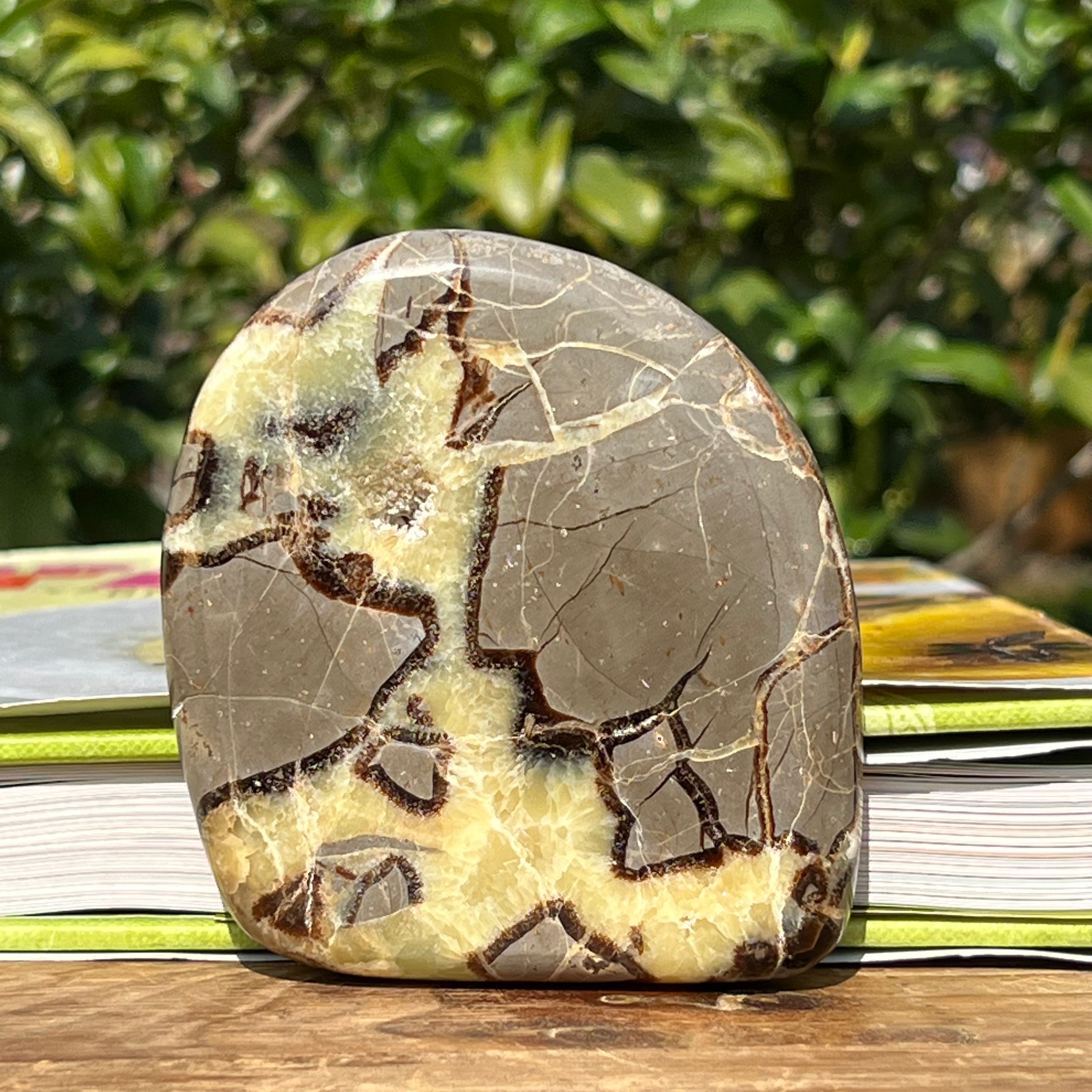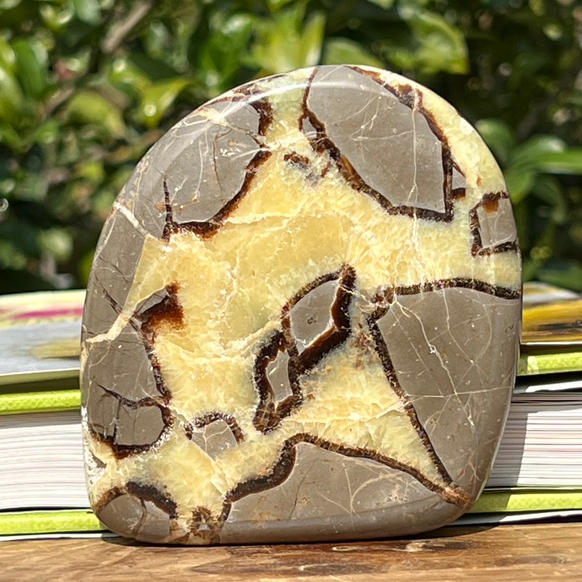 Septaria está formada por calcita, limonita, yeso y barita, minerales que forman un juego único en esta piedra y le confieren un aspecto especial.