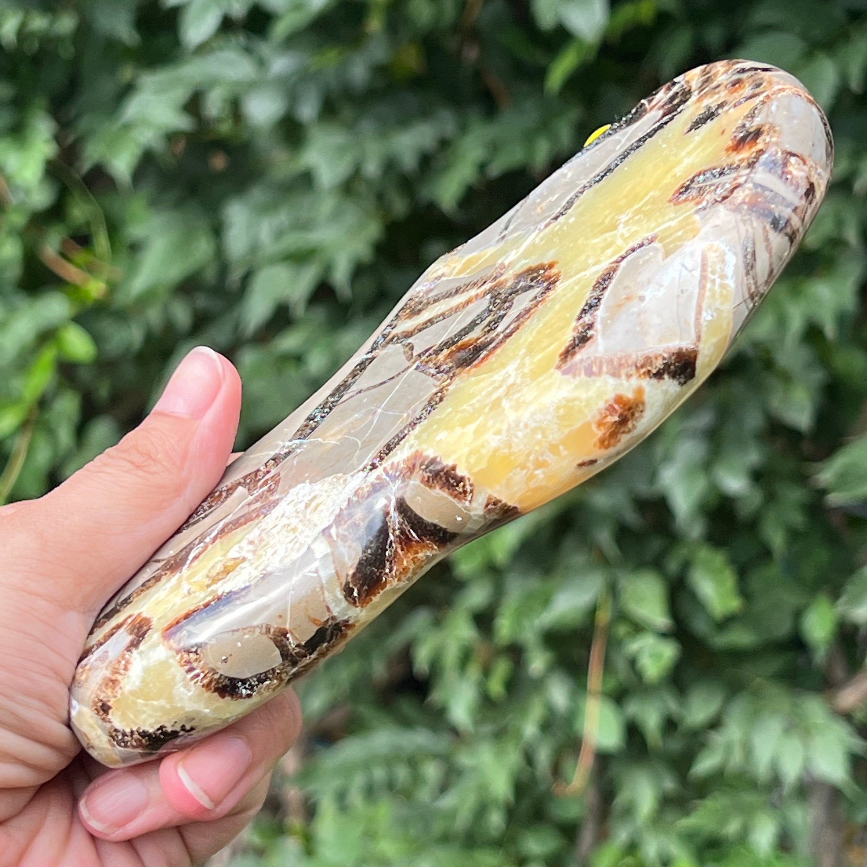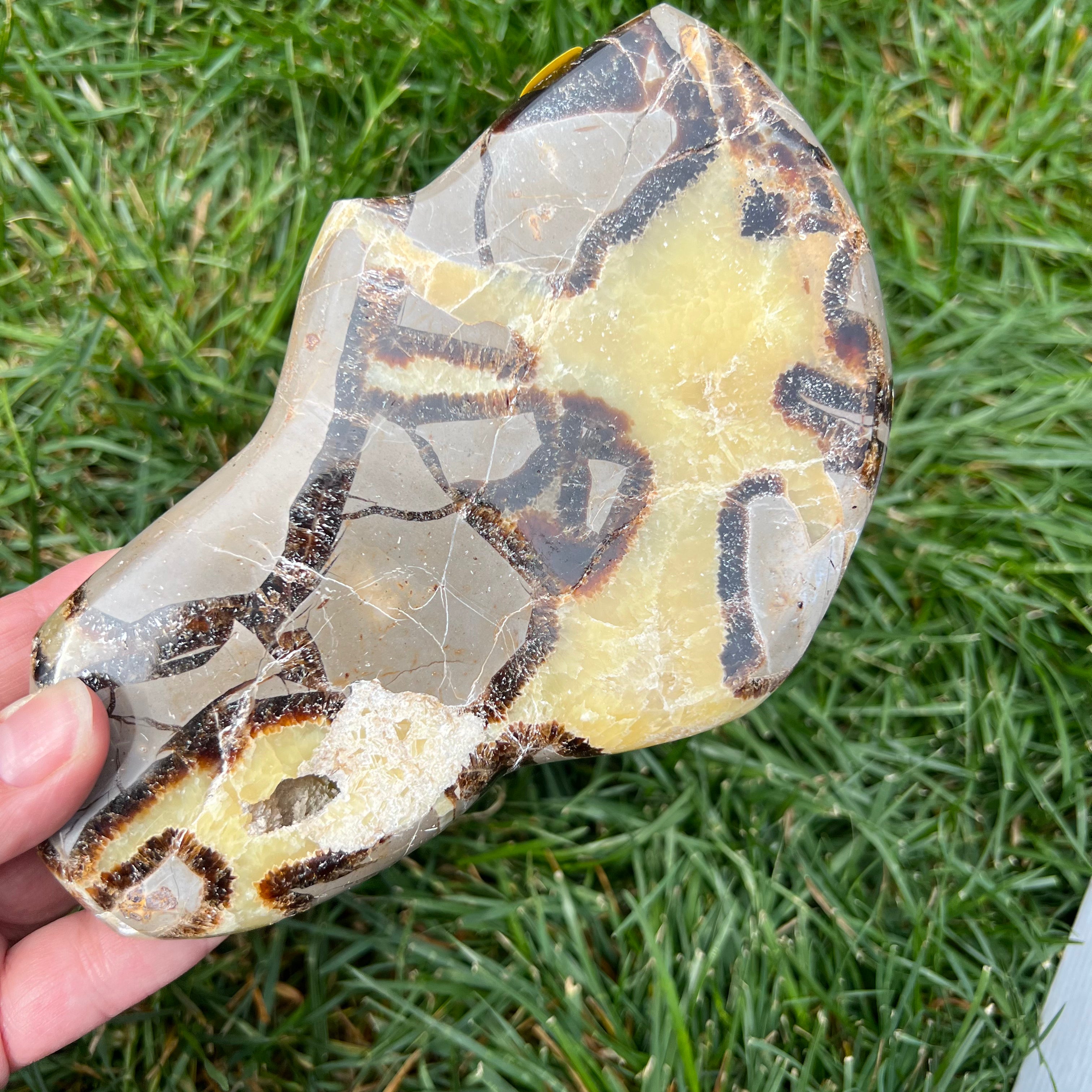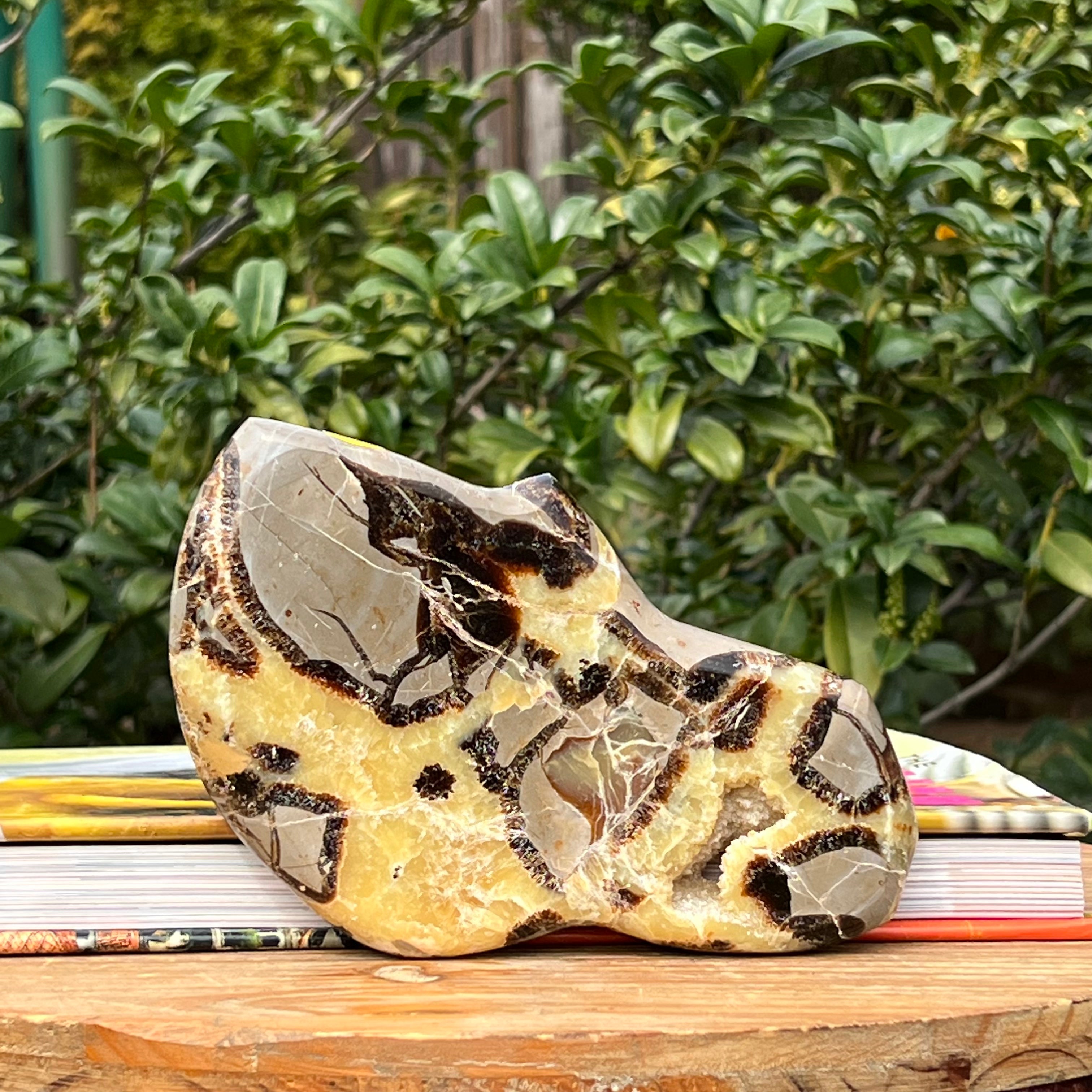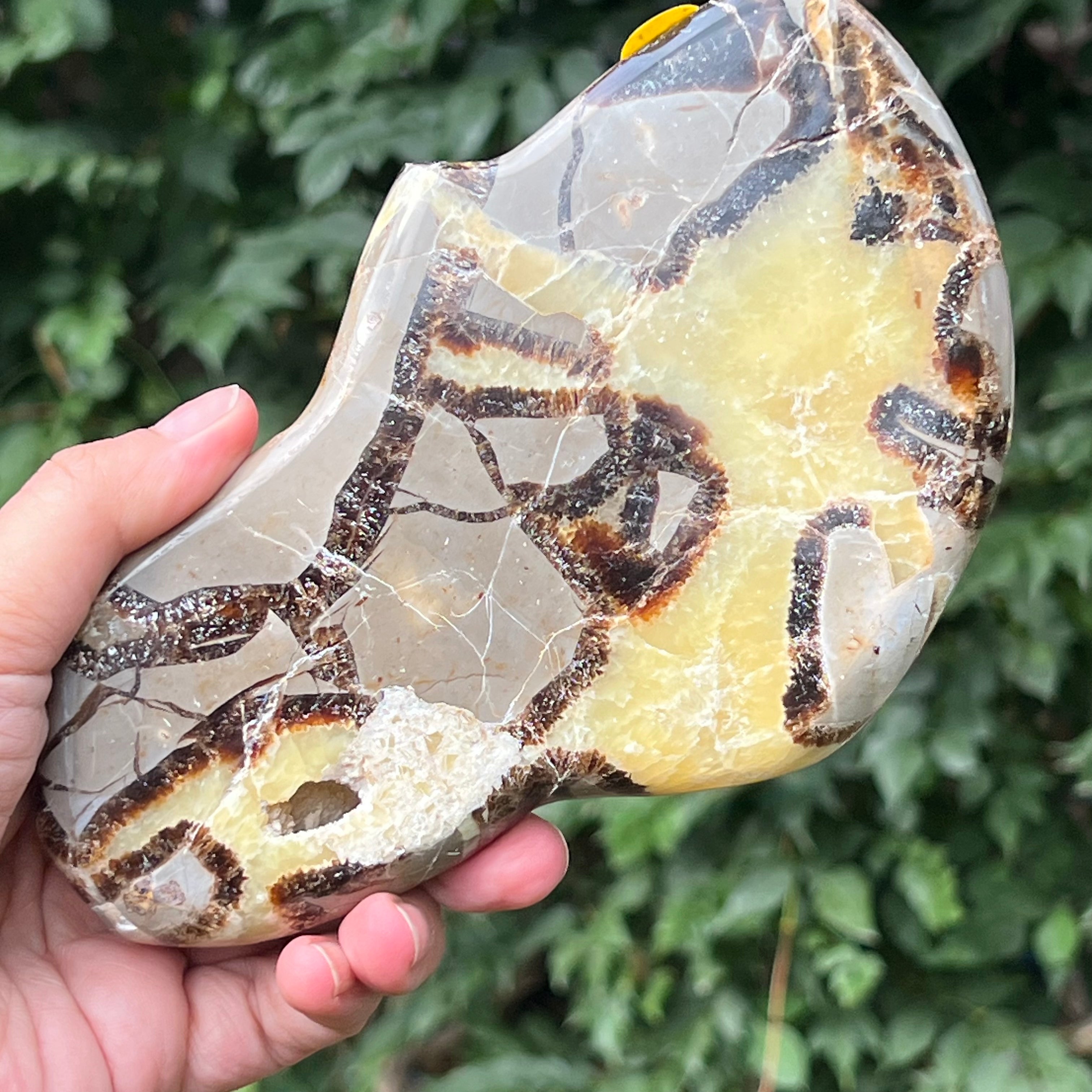 Septaria está formada por calcita, limonita, yeso y barita, minerales que forman un juego único en esta piedra y le confieren un aspecto especial.