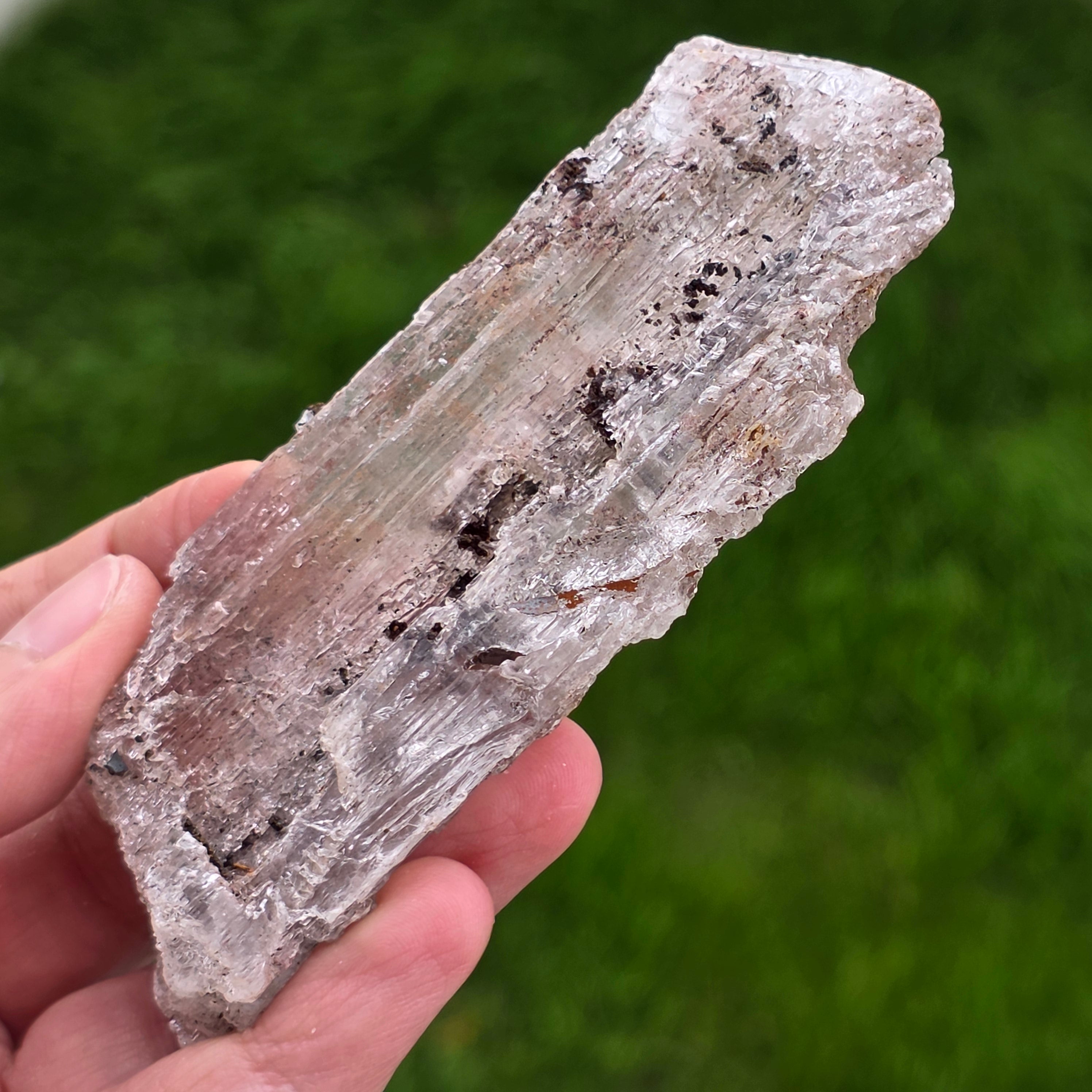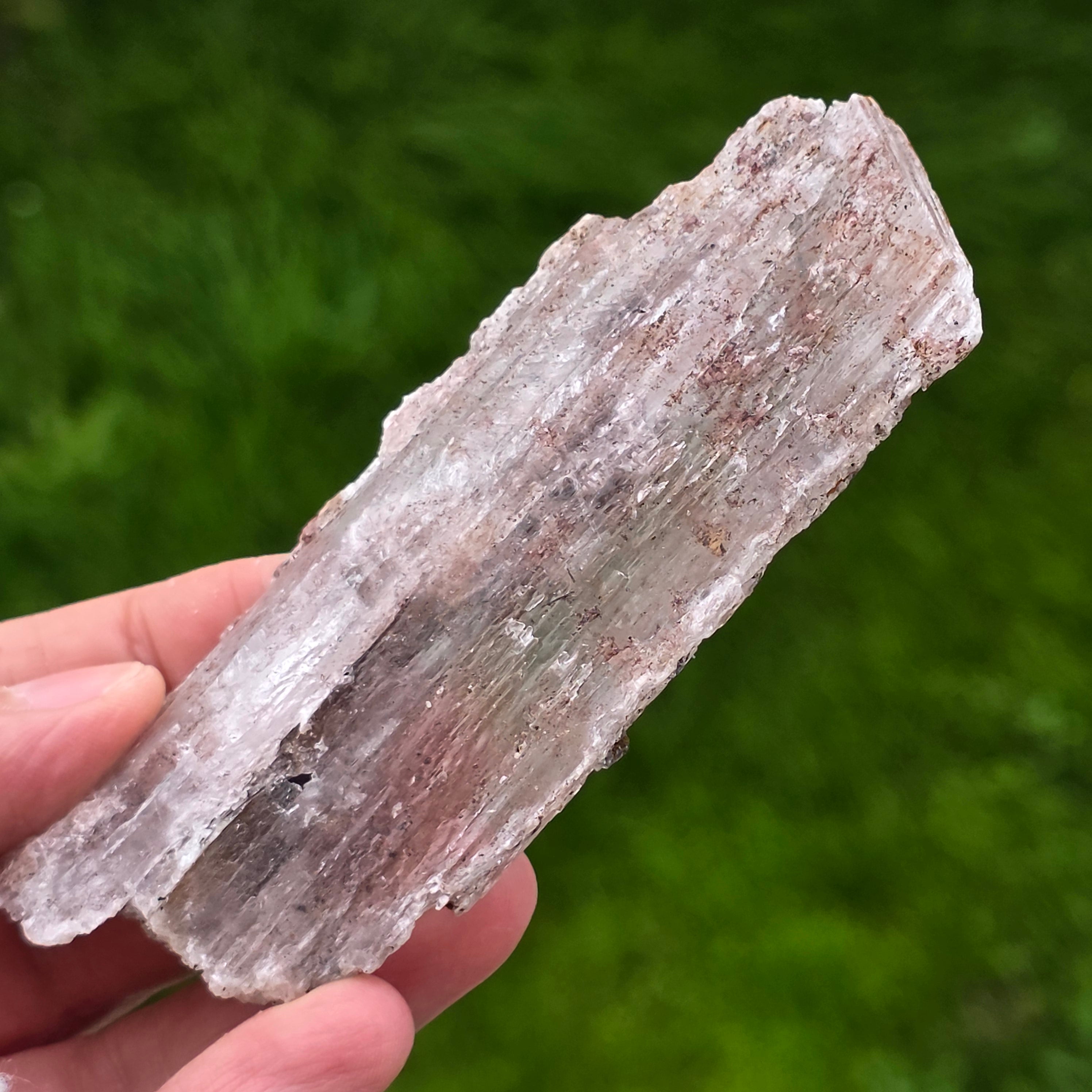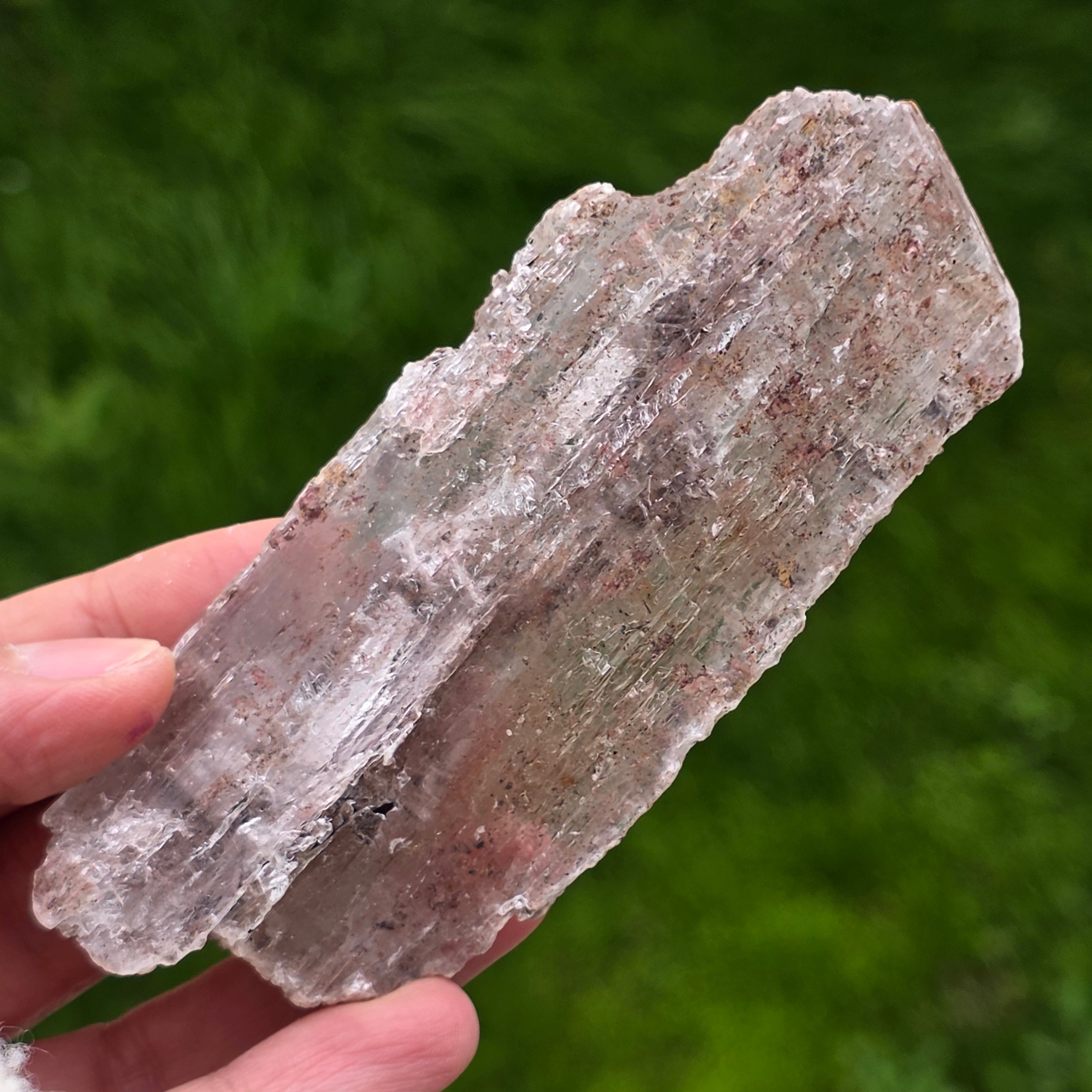 La selenita aparece en forma de cristales alargados o placas translúcidas, con brillo sedoso y textura fina, mientras que la hematita se presenta en forma de inclusiones, películas o depósitos naturales, que acentúan la estructura del cristal y le confieren profundidad visual.