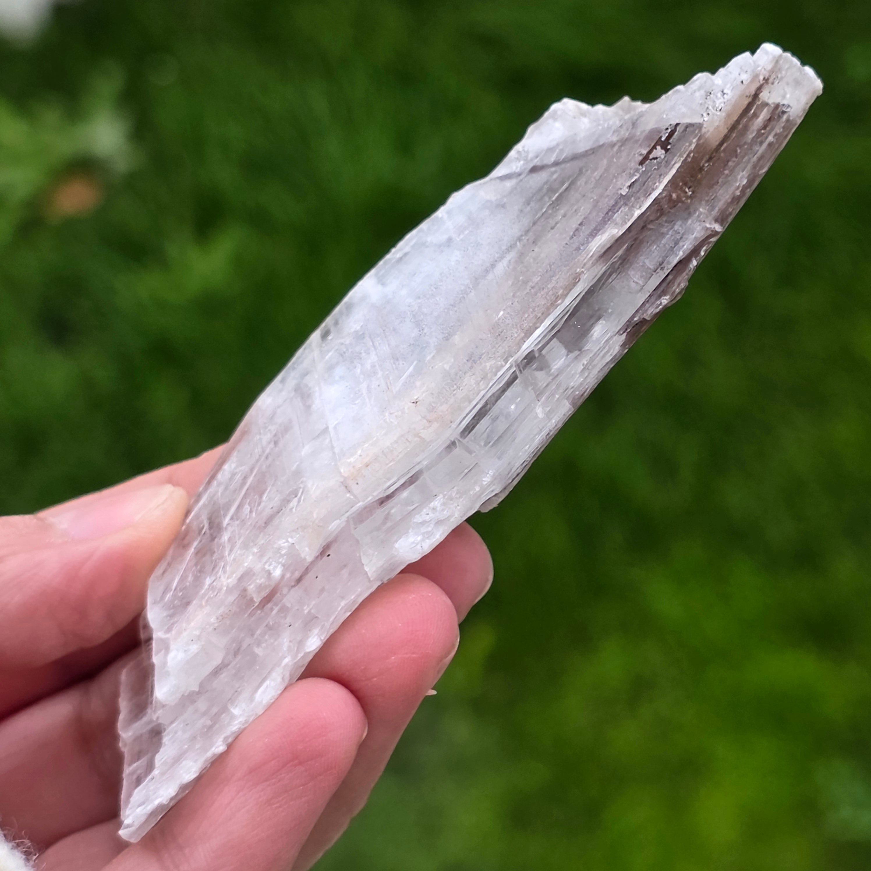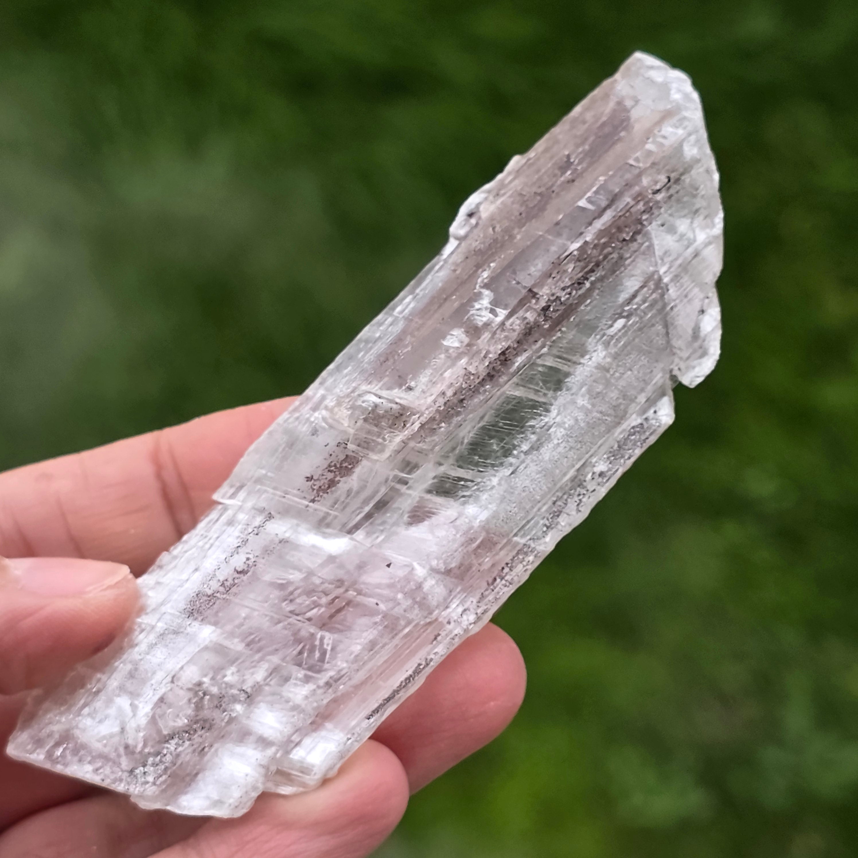 La selenita se presenta en forma de cristales alargados o placas translúcidas, con un brillo sedoso y textura fina, mientras que la hematita está presente en forma de inclusiones, películas o depósitos naturales, que acentúan la estructura del cristal y le dan profundidad visual.