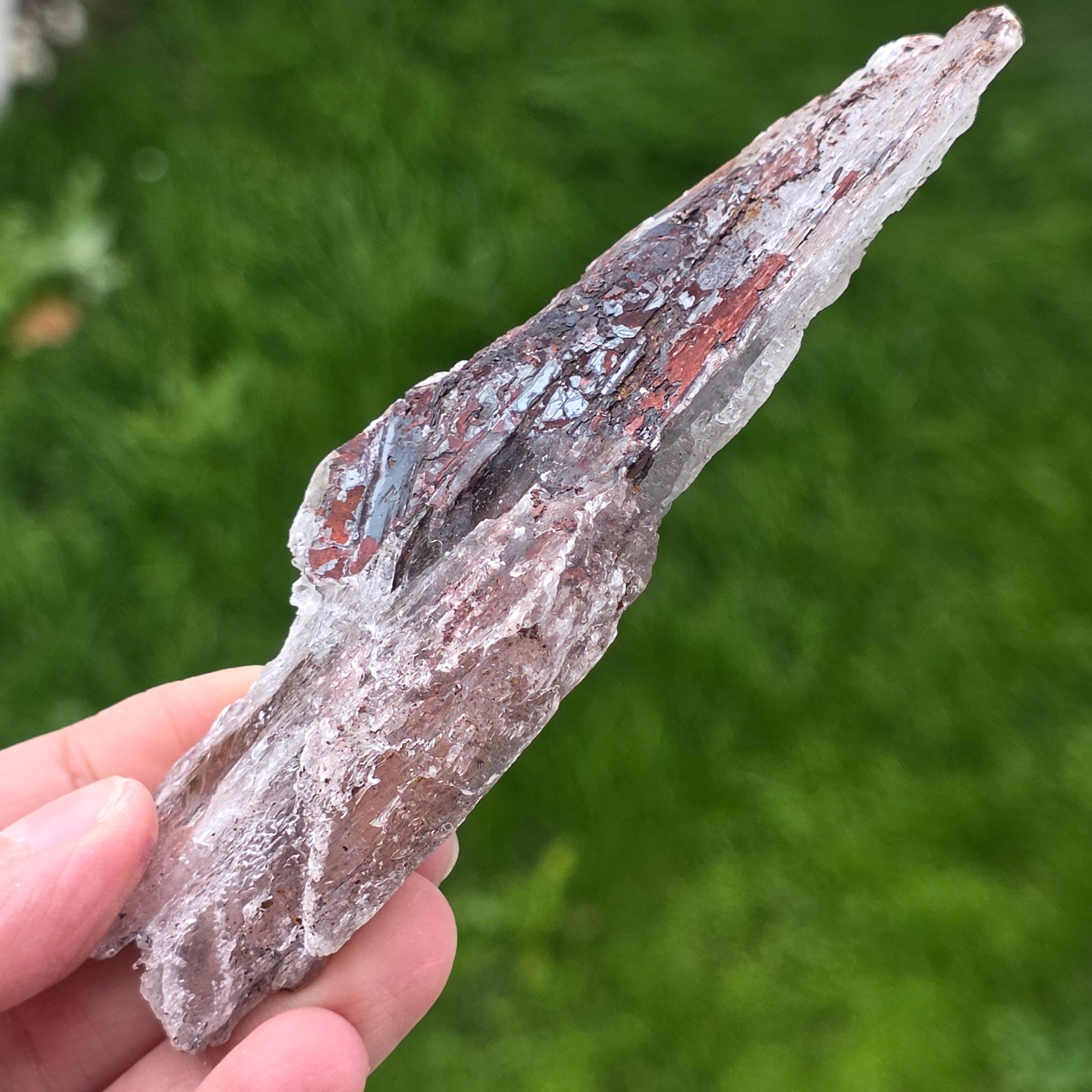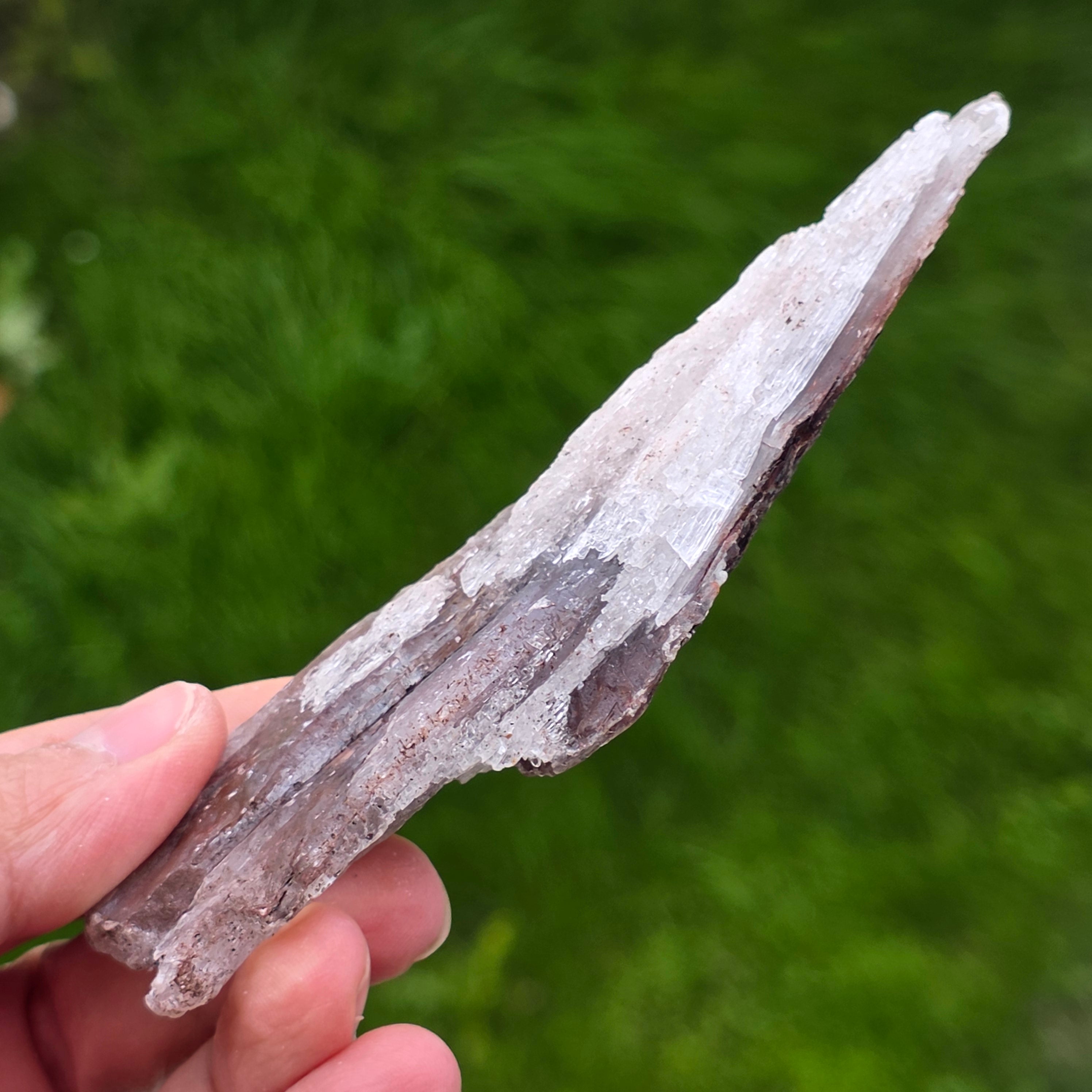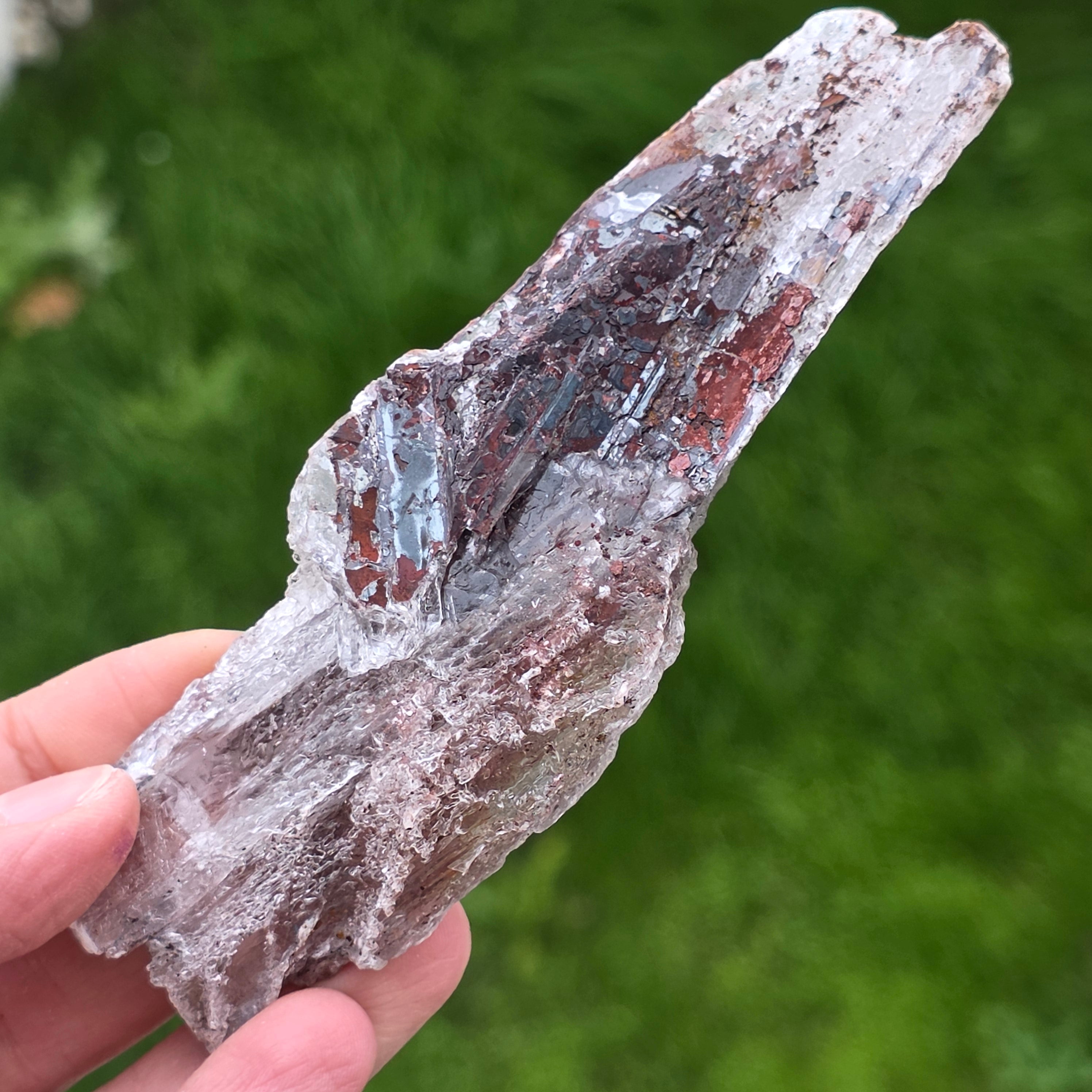 La selenita se presenta en forma de cristales alargados o placas translúcidas, con un brillo sedoso y textura fina, mientras que la hematita está presente en forma de inclusiones, películas o depósitos naturales, que acentúan la estructura del cristal y le dan profundidad visual.