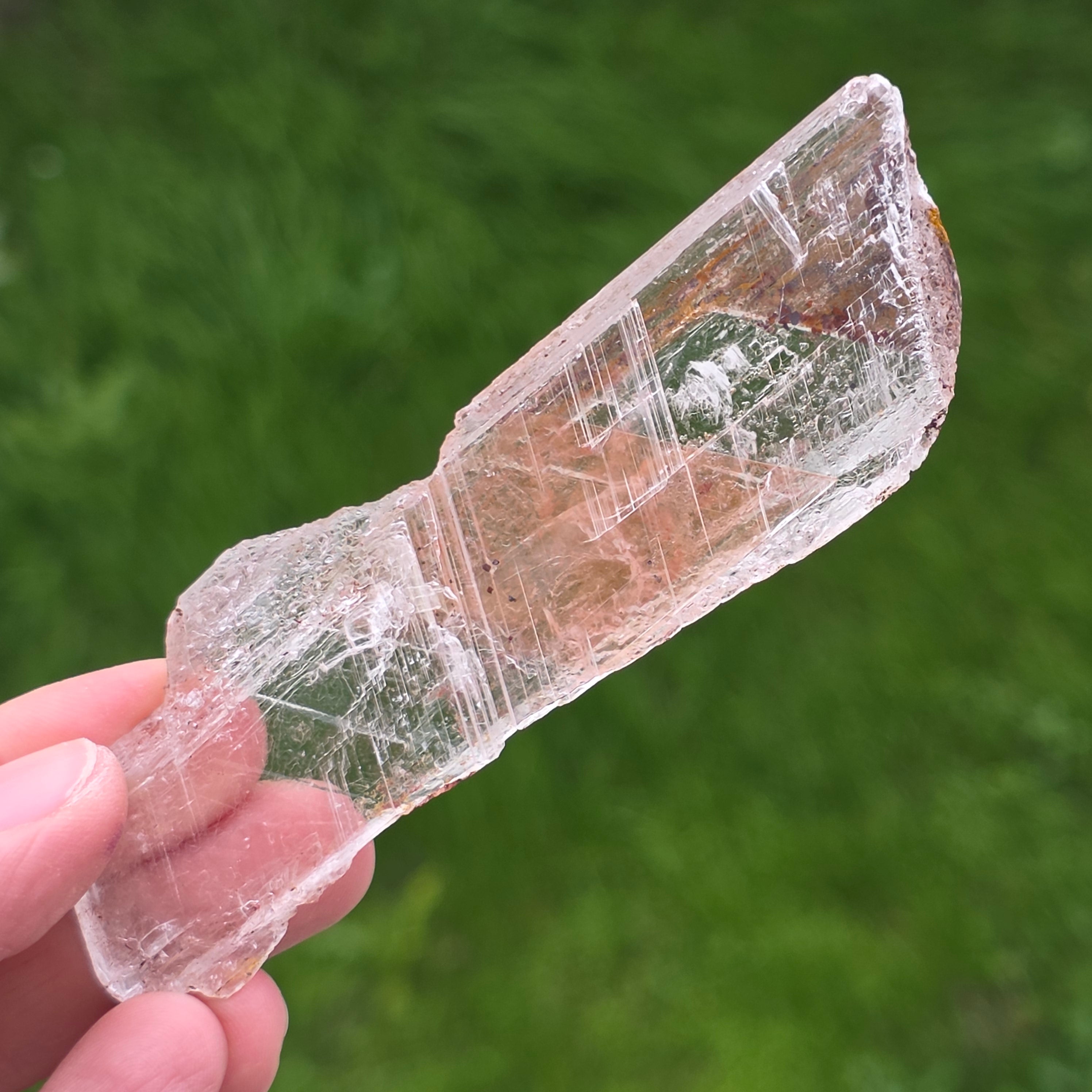 La selenita aparece en forma de cristales alargados o placas translúcidas, con brillo sedoso y textura fina, mientras que la hematita está presente en forma de inclusiones, películas o depósitos naturales, que acentúan la estructura del cristal y le confieren profundidad visual.